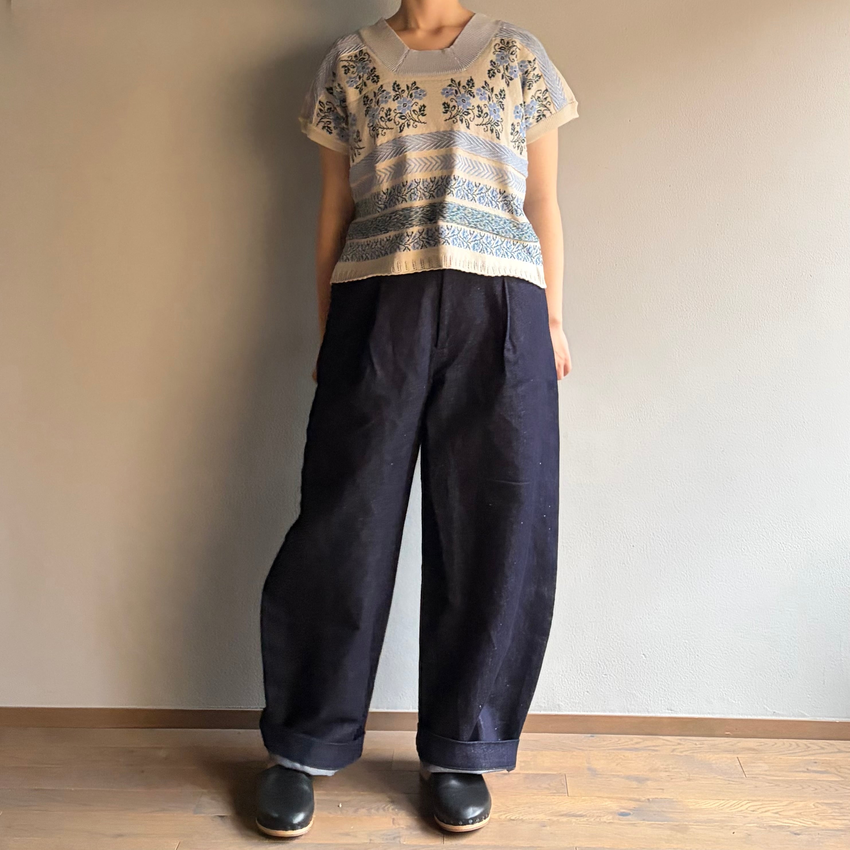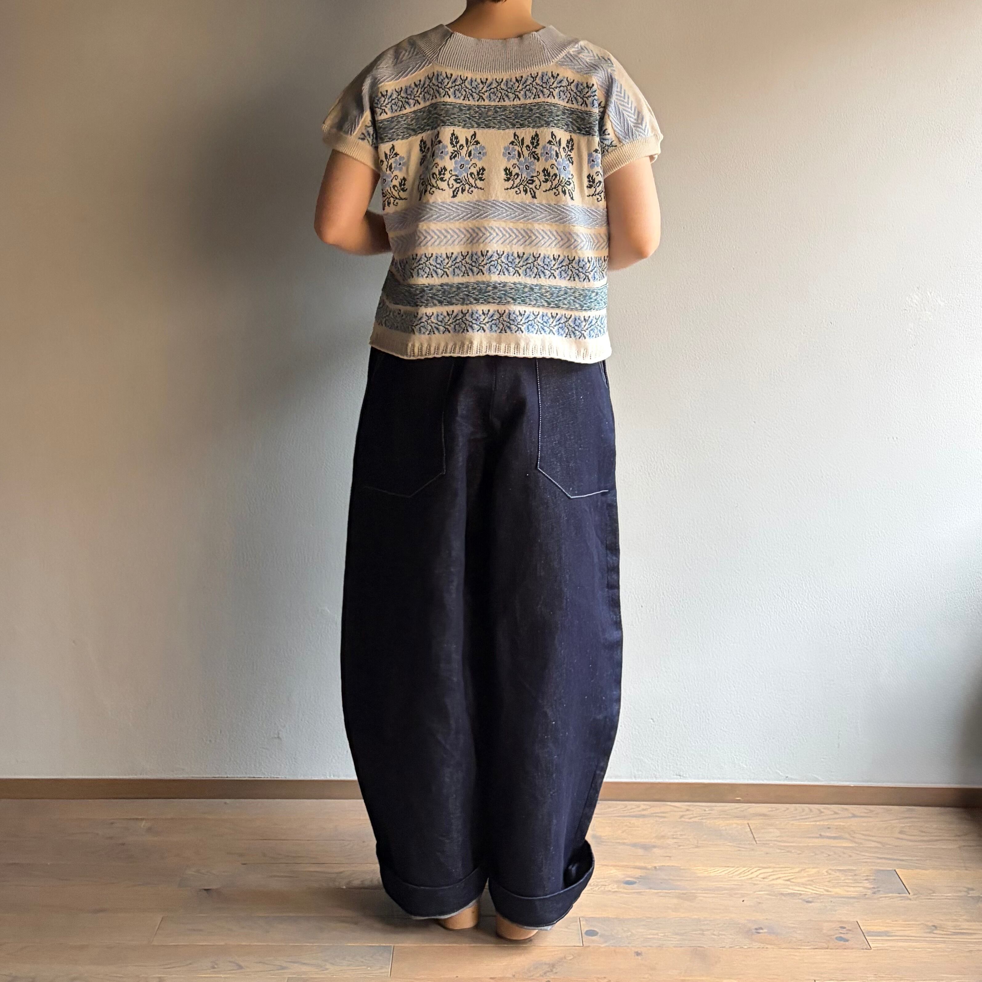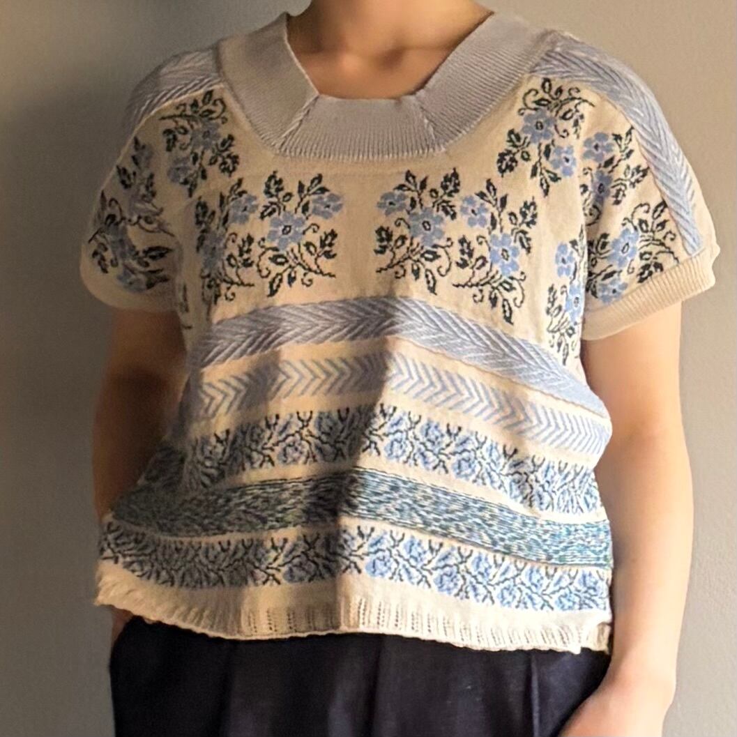 オリジナルのフラワーモチーフをジャガードで丁寧に編み立てたニットブラウス。ナチュラルなOFF WHITEをベースに、淡いブルーとグリーンの配色が美しく浮かび上がり、どこか民族的で清涼感のある表情に仕上がっています。