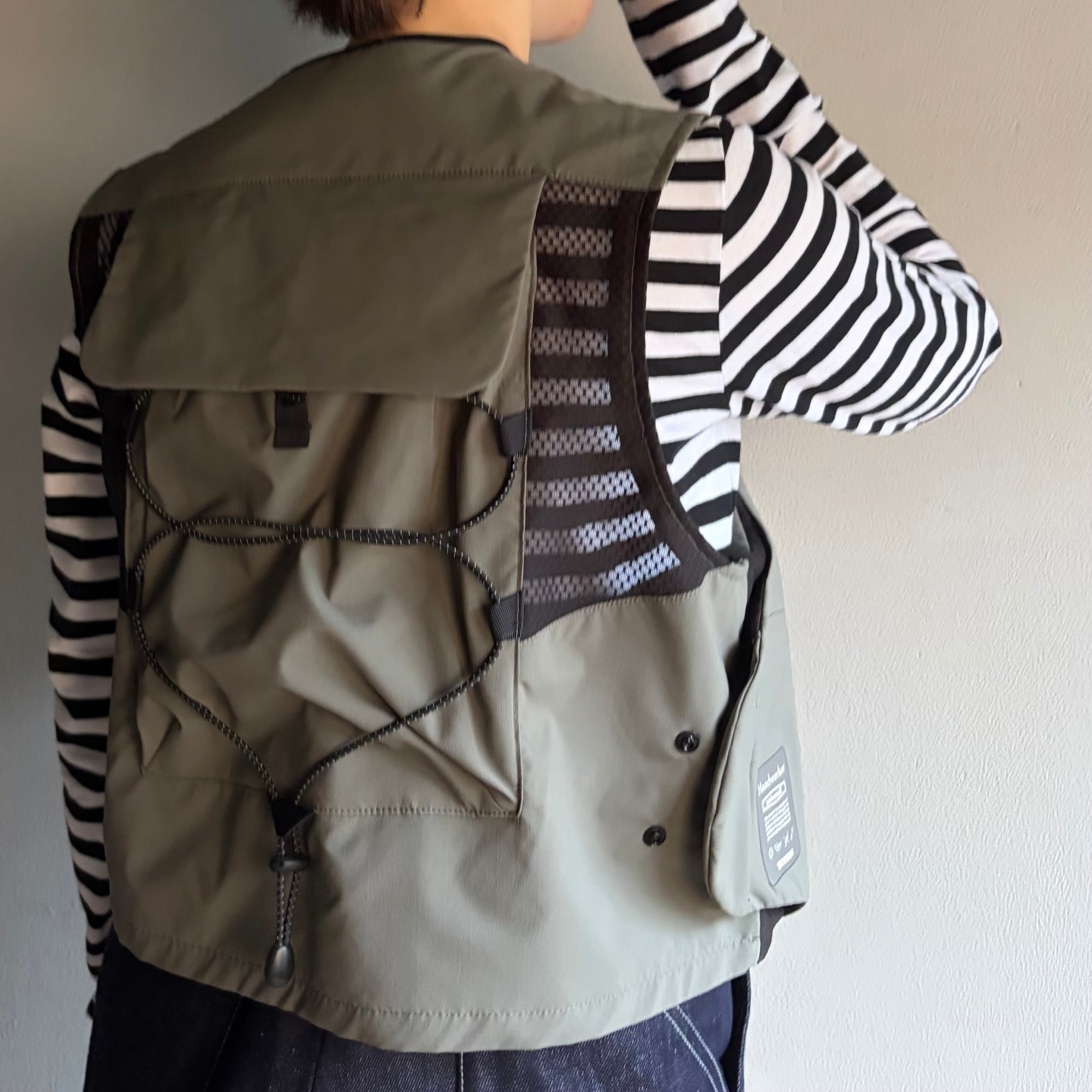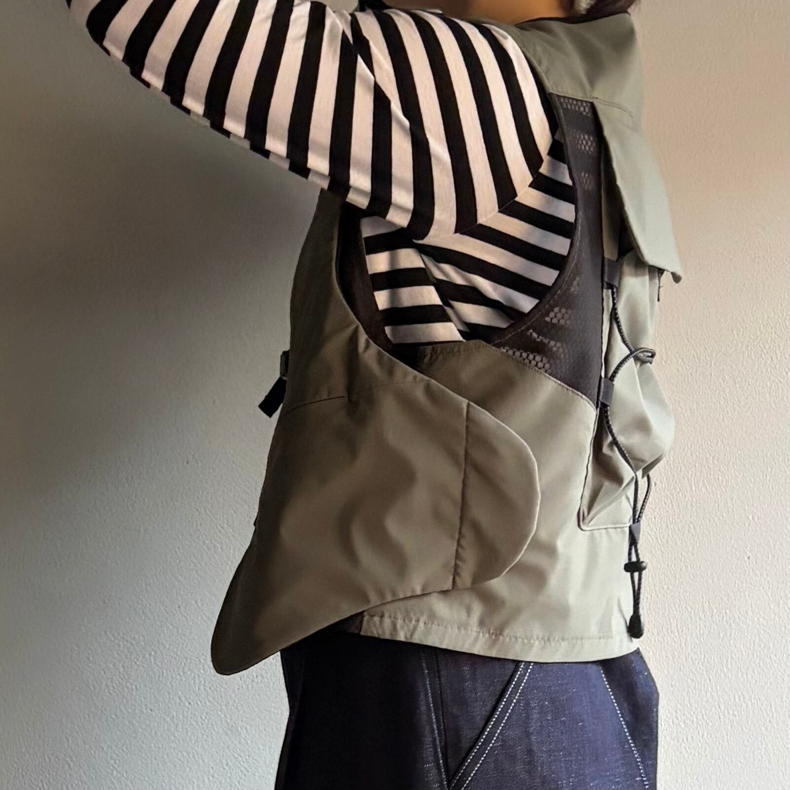 収納力を備えたベストを、鞄の代わりとして身に着けられるイメージでデザインしました。子供と公園で遊ぶシーンや、野外イベントなど拠点を持たず移動する場面で活躍します。