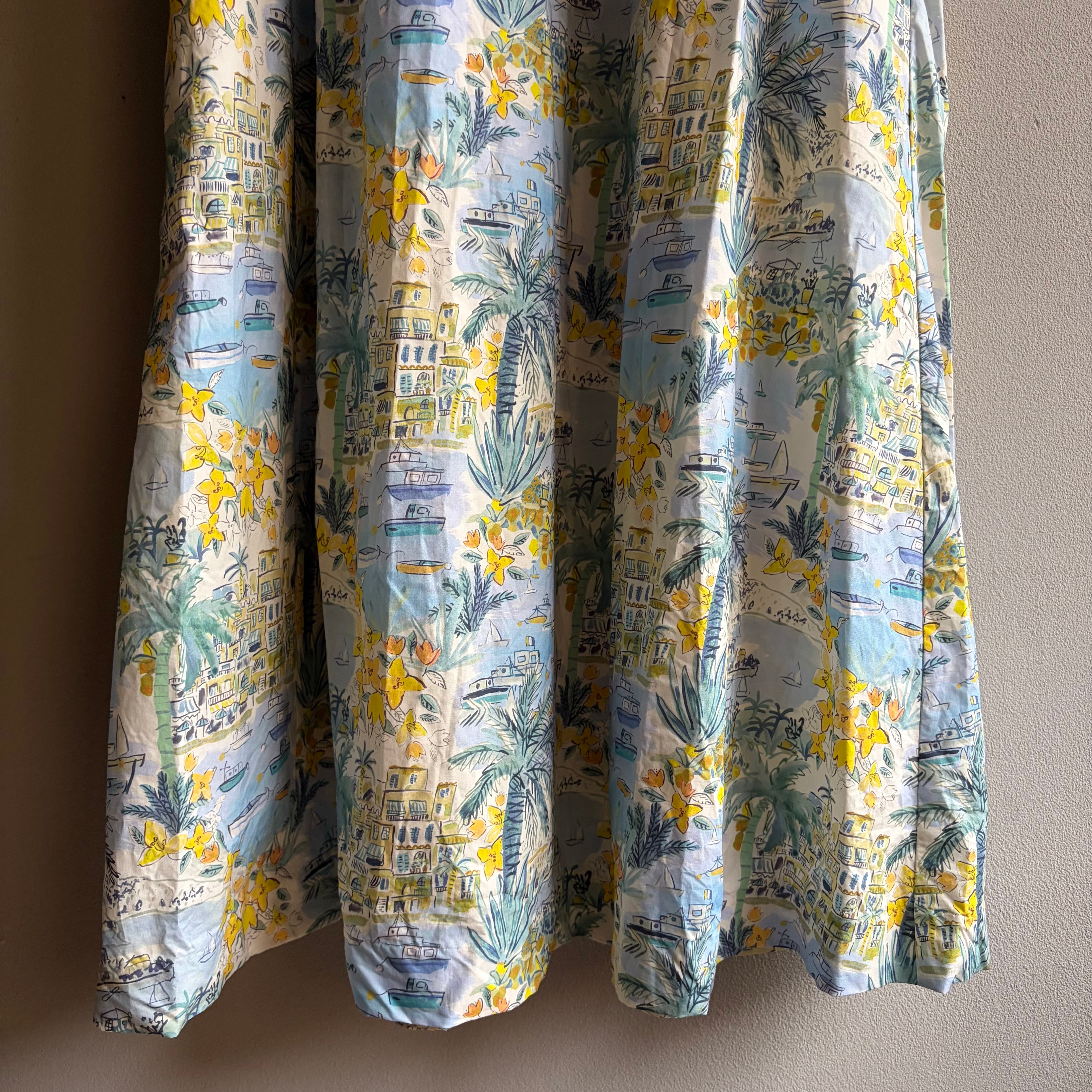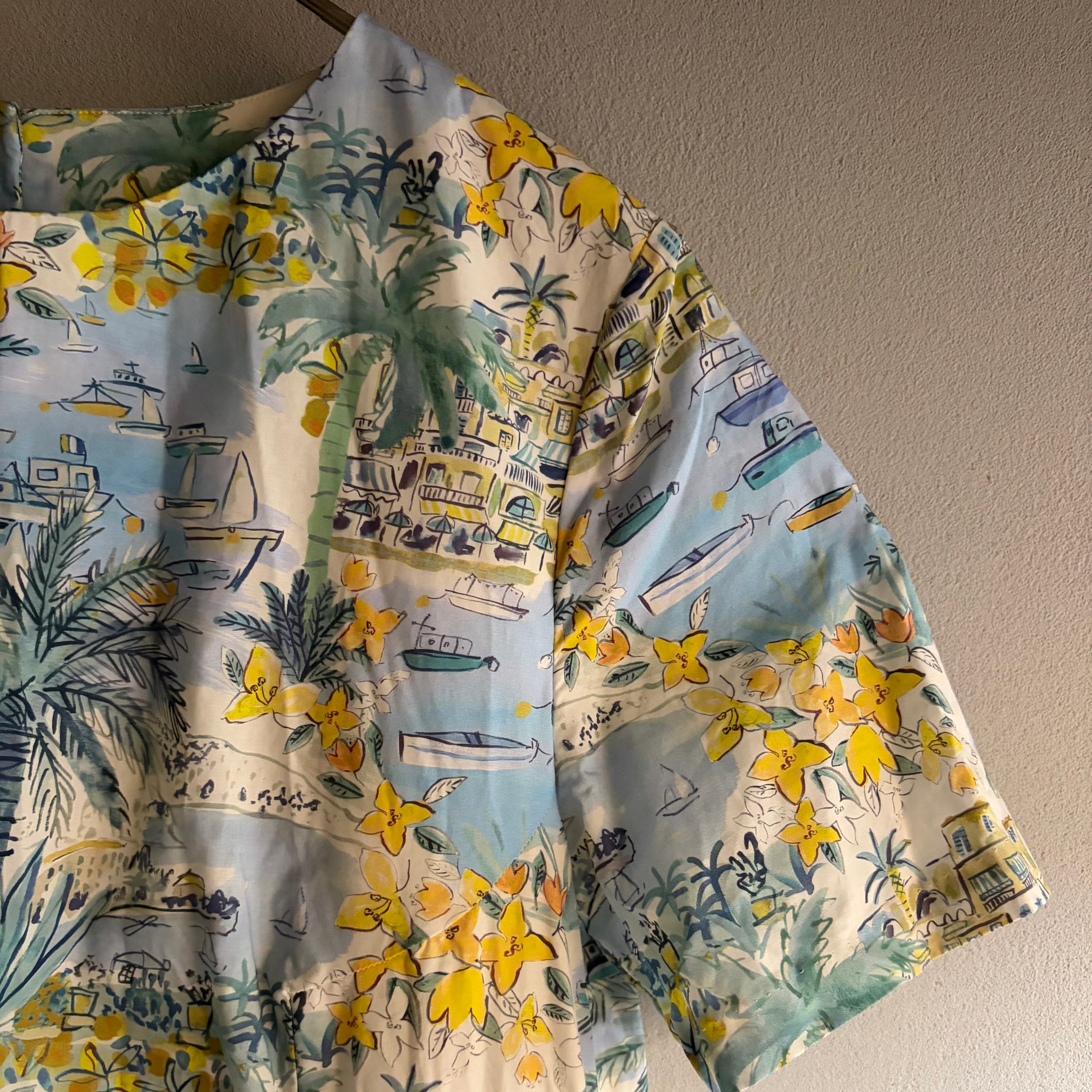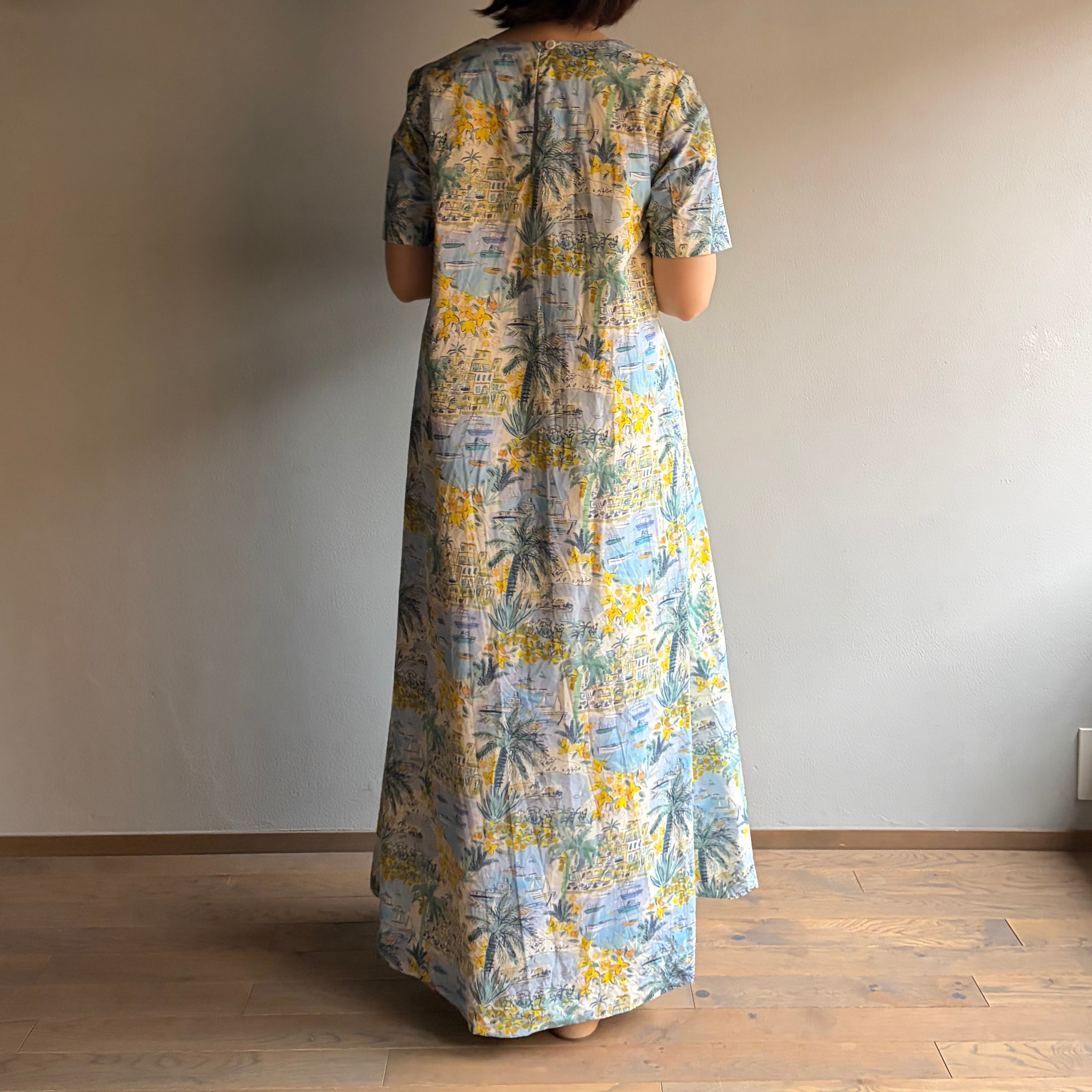 トロピカルなプリントが魅力的なこのAラインドレスは、南国の爽やかなリゾート気分を感じさせてくれます。ヤシの木や船港を思わせるデザインは、日常を離れた異世界への旅へと誘います。透け感がないため、一枚で気軽にお召し上がりいただけ、夏の暑い日にもぴったりのアイテムです。