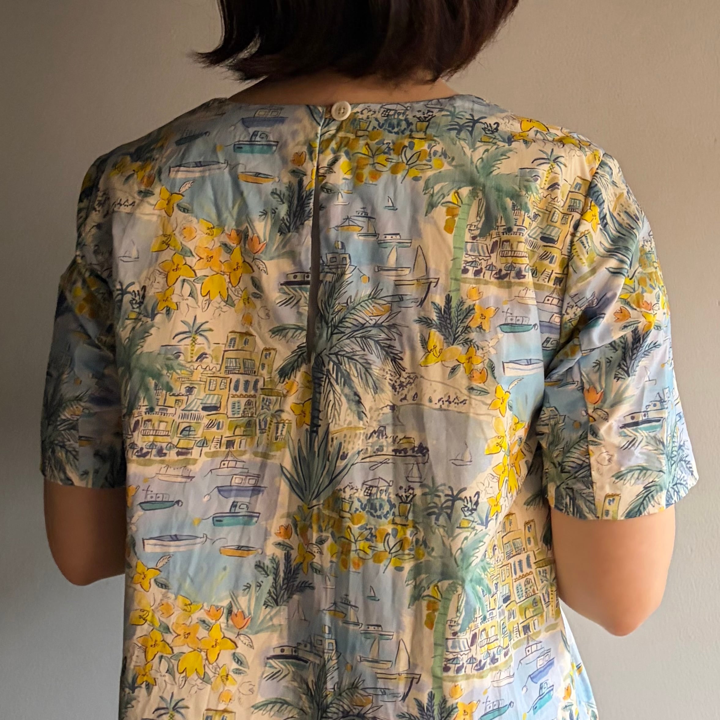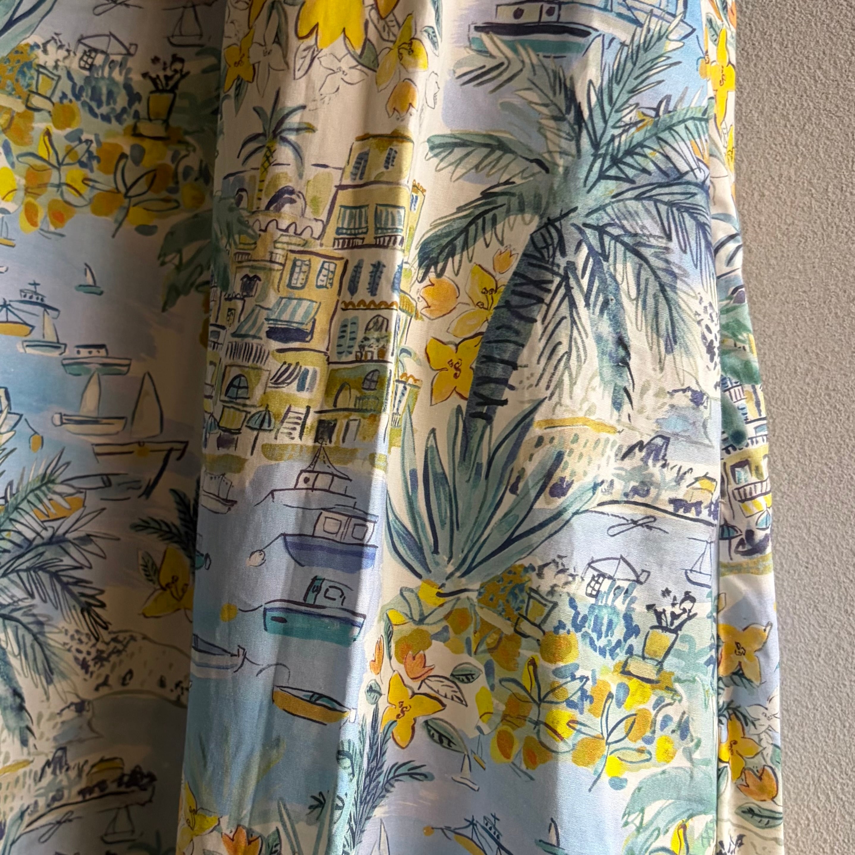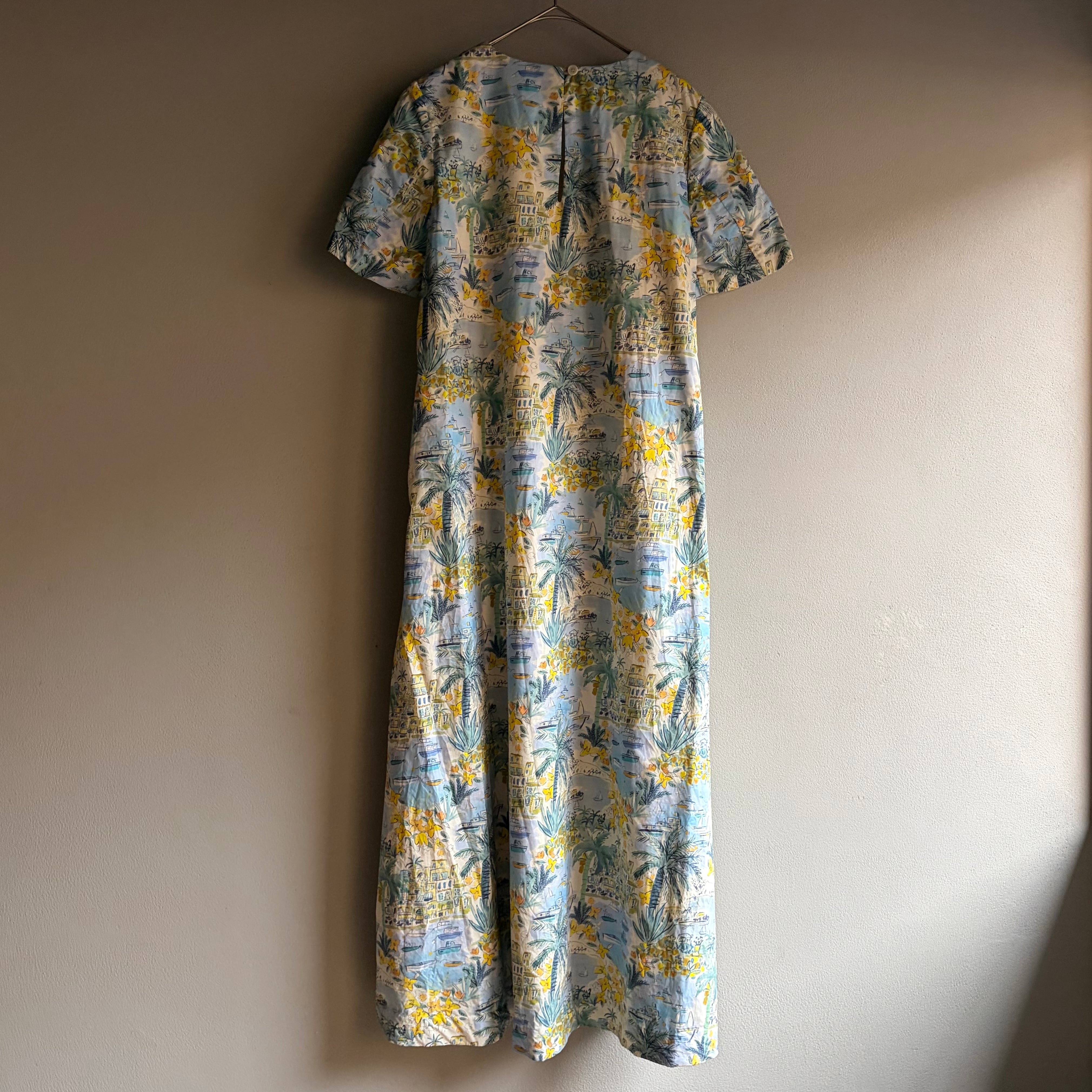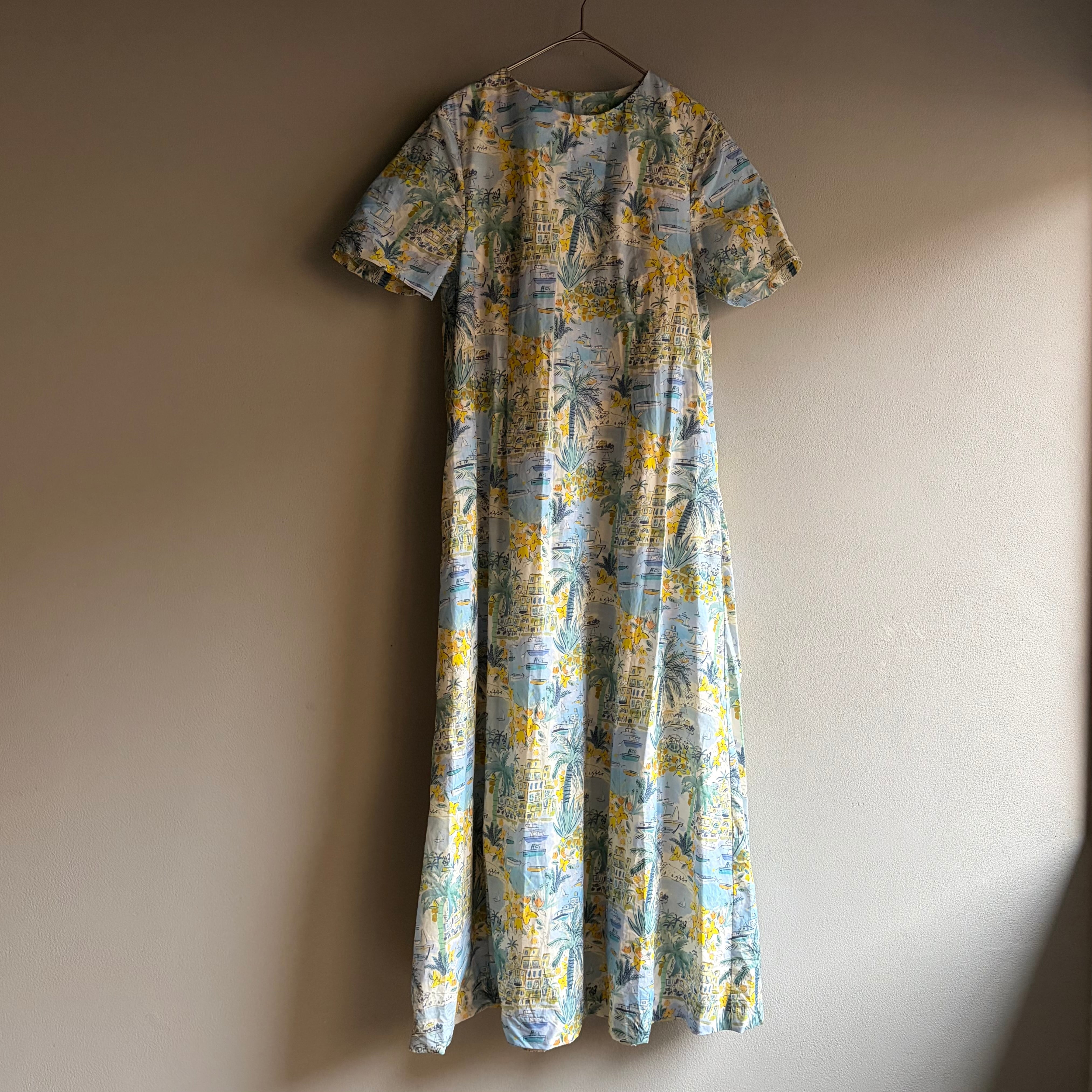 トロピカルなプリントが魅力的なこのAラインドレスは、南国の爽やかなリゾート気分を感じさせてくれます。ヤシの木や船港を思わせるデザインは、日常を離れた異世界への旅へと誘います。透け感がないため、一枚で気軽にお召し上がりいただけ、夏の暑い日にもぴったりのアイテムです。