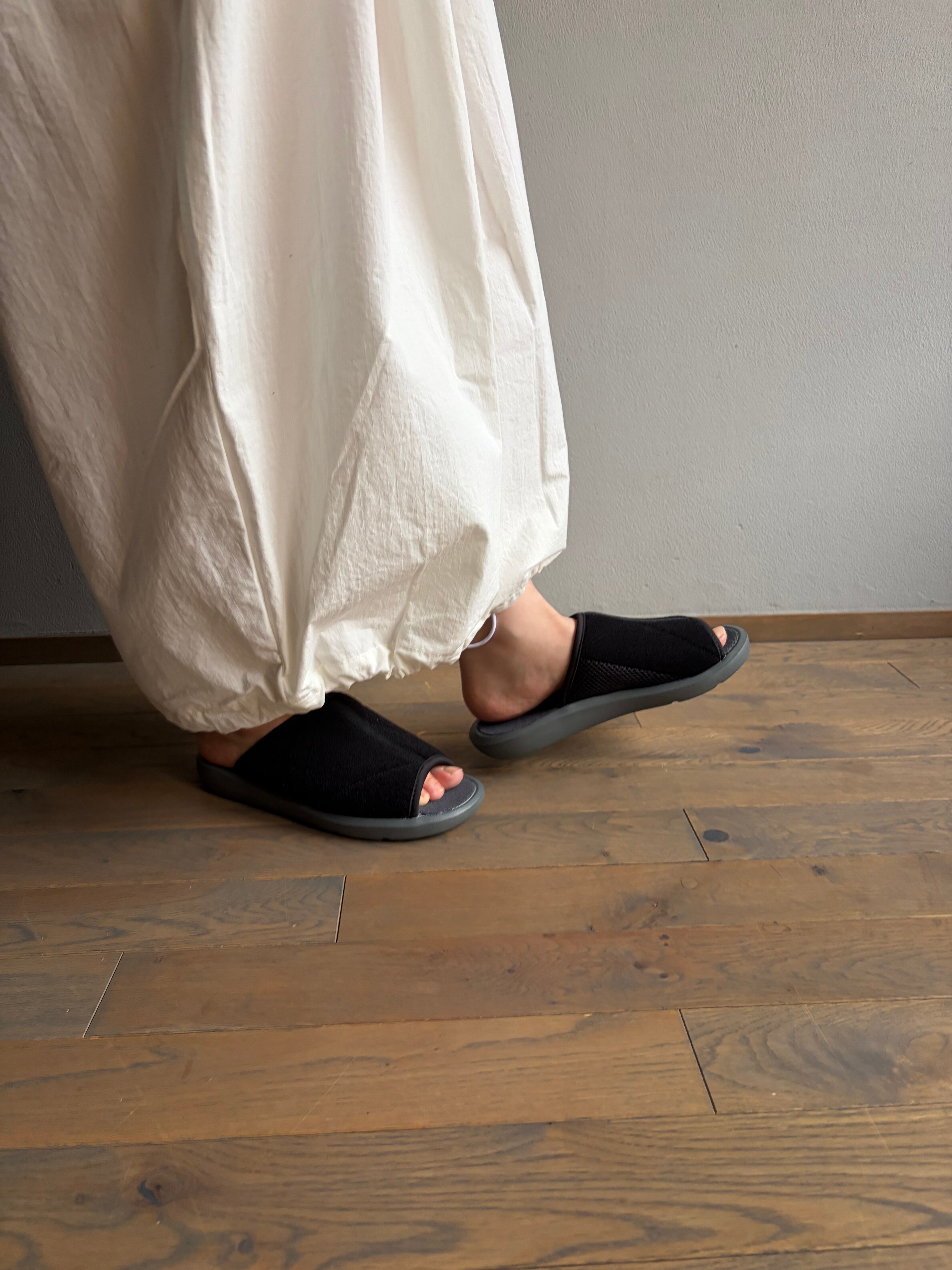 アッパーには撥水加工が施されたリップストップ生地を使用し、内側は通気性の優れたメッシュに切り替え。適度に厚みを持たせたソールは程よい弾力のある素材を採用し、足なりの形状に合わせた設計。フットベッドにはAg+ 抗菌防臭機能を搭載し利用後も清潔にご利用いただけます。無駄を削ぎ落とし、ディテールを突き詰めた屋内外兼用のスリッパタイプ。