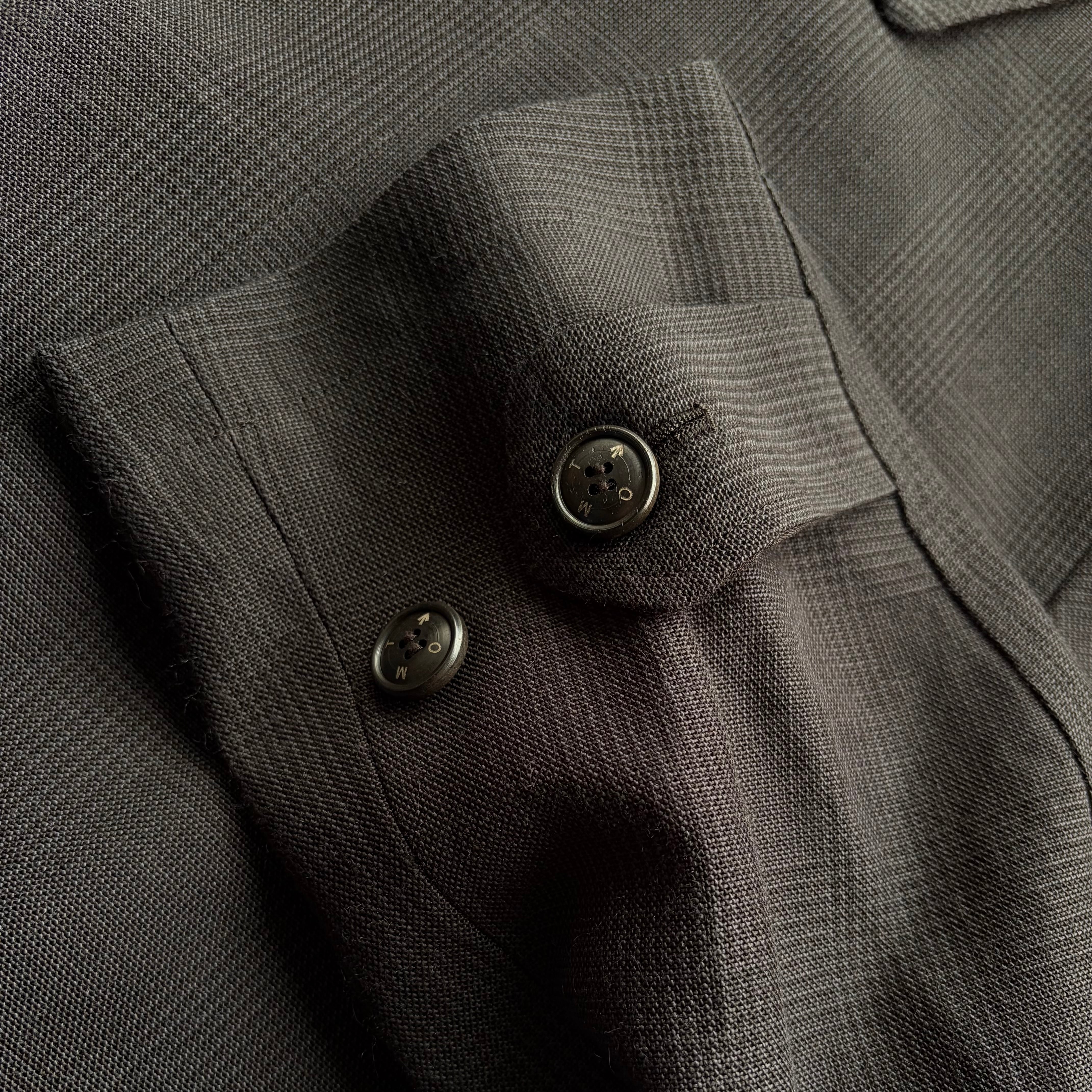 フラップ付きのポケットが右に1段左に2段つきます。後ろそのセンターベンツには開き止めのボタンが1つ付いています。