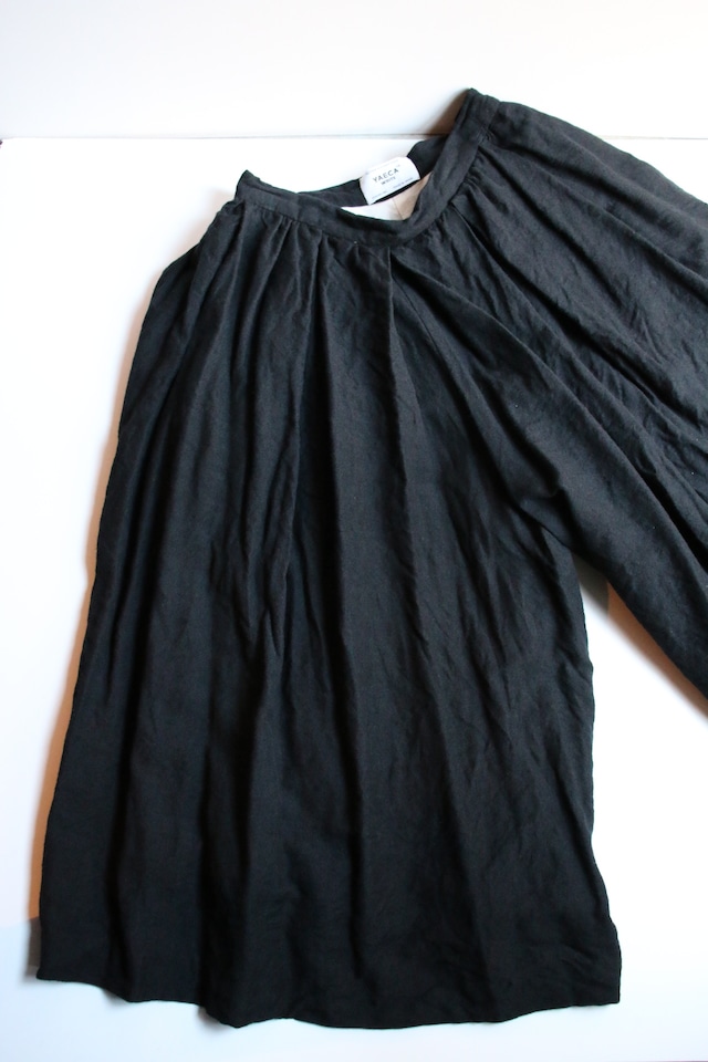 深くとられたタックが腰回りにぐるっとあり、たっぷりとした生地使いが深い陰影をたずさえ、