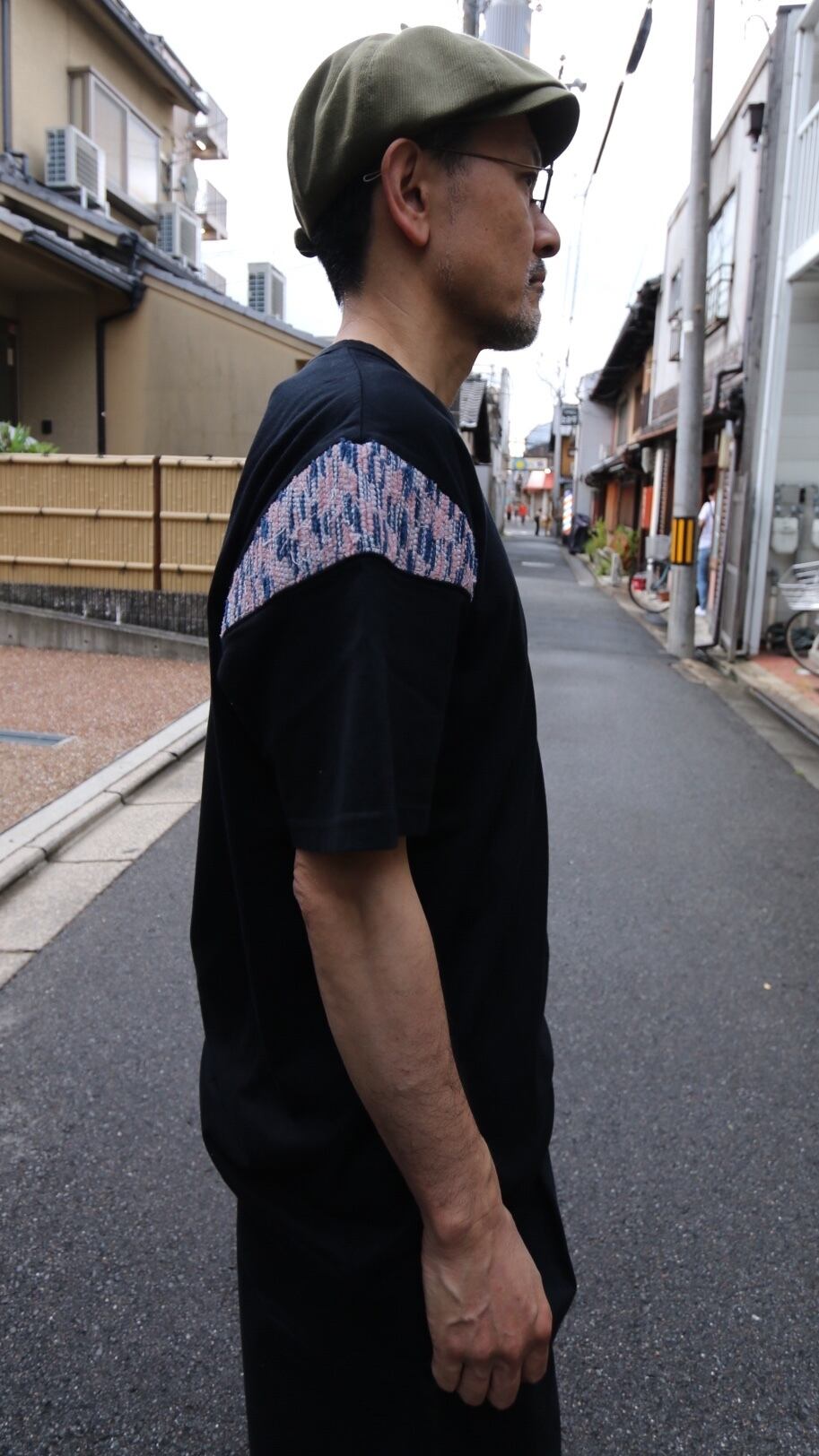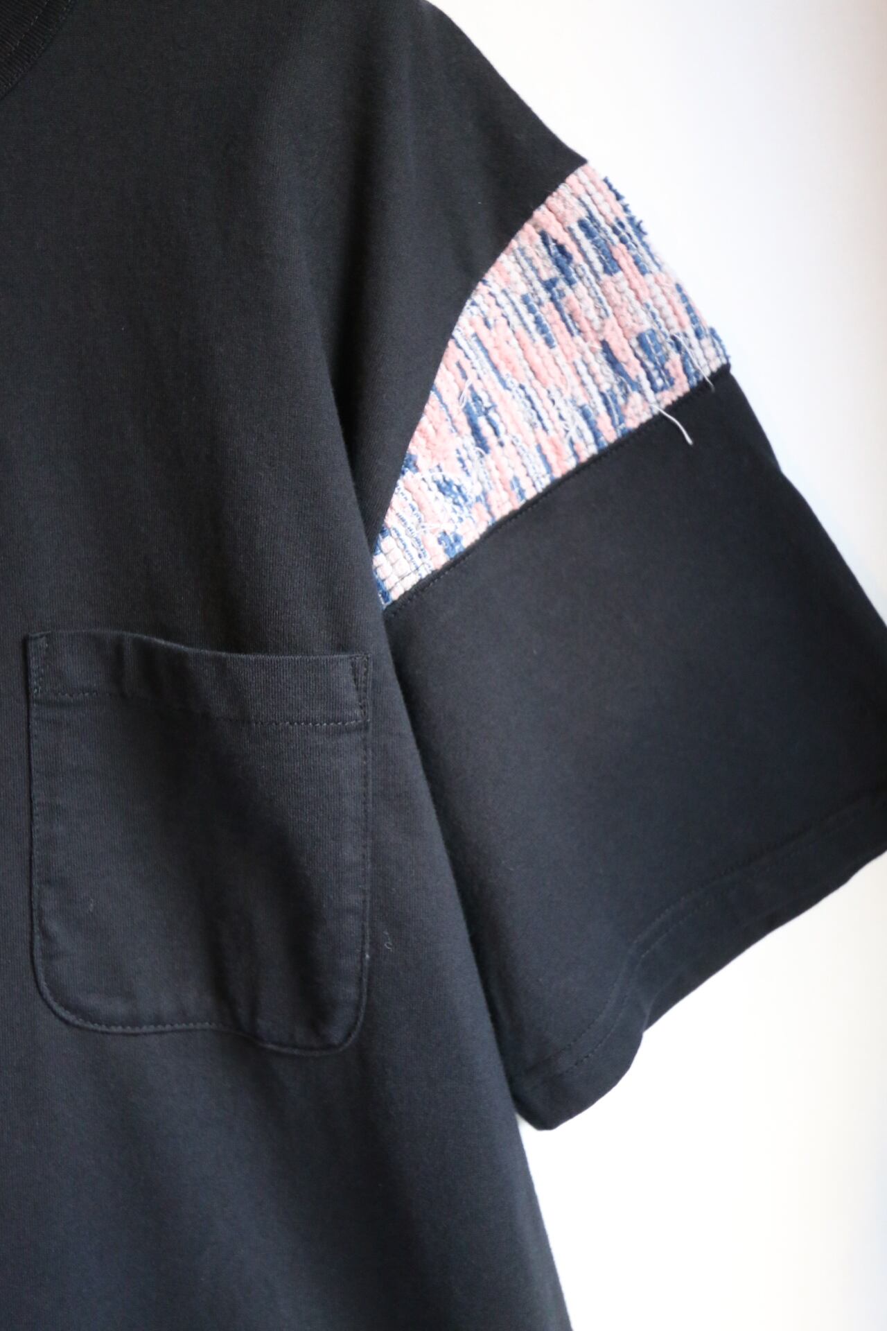 裂き織りの布を肩の部分に組み入れたT シャツです。