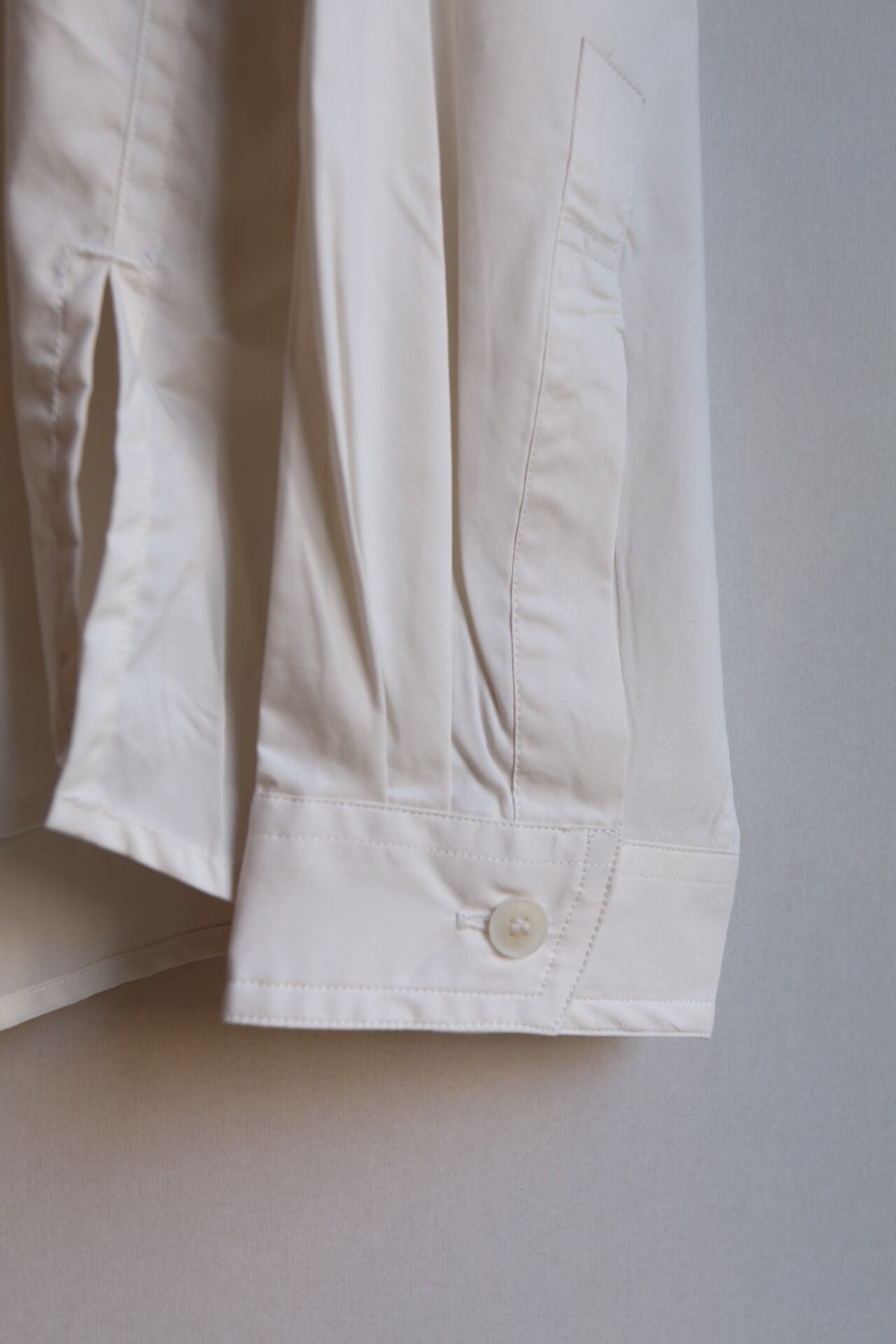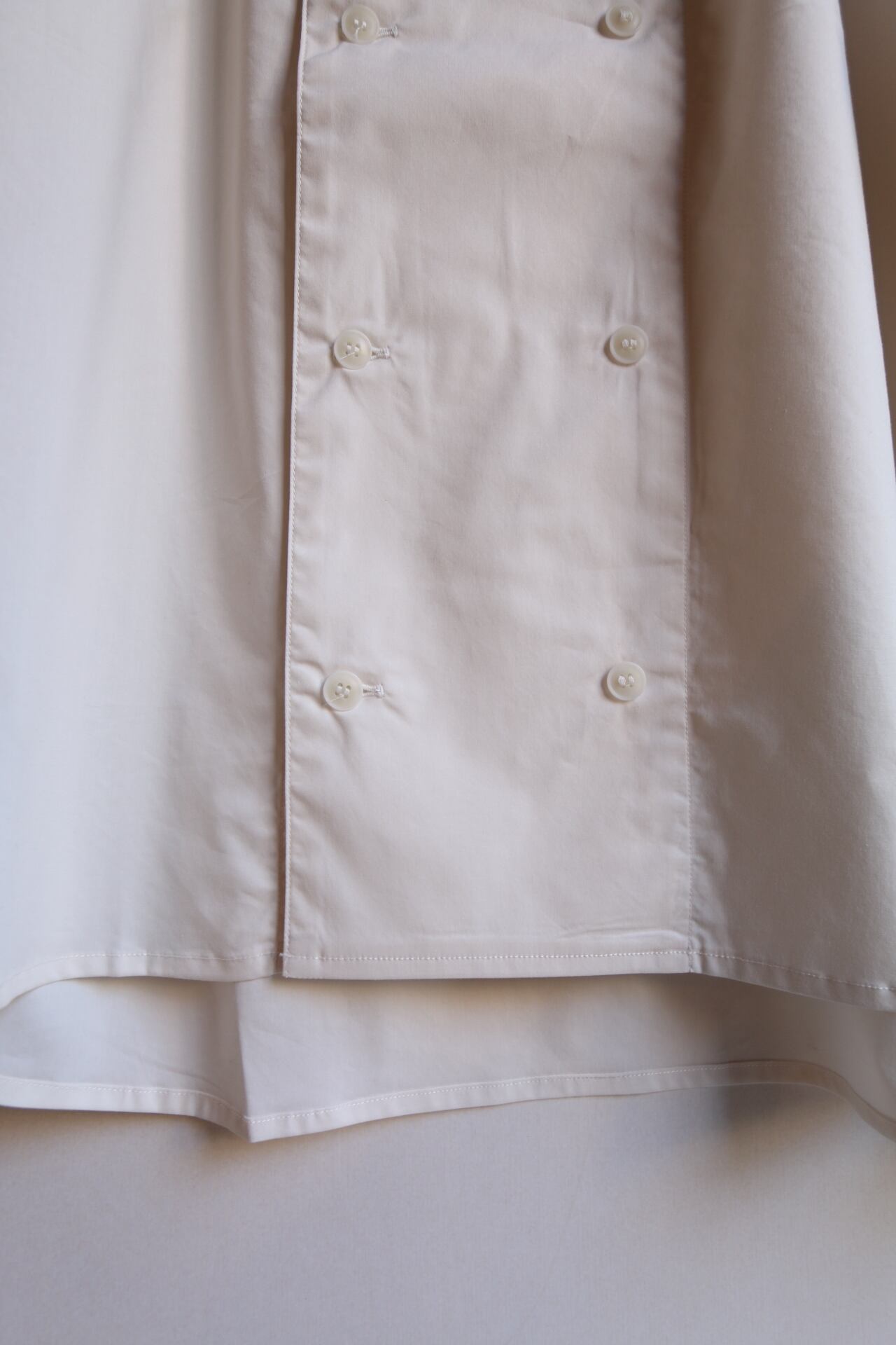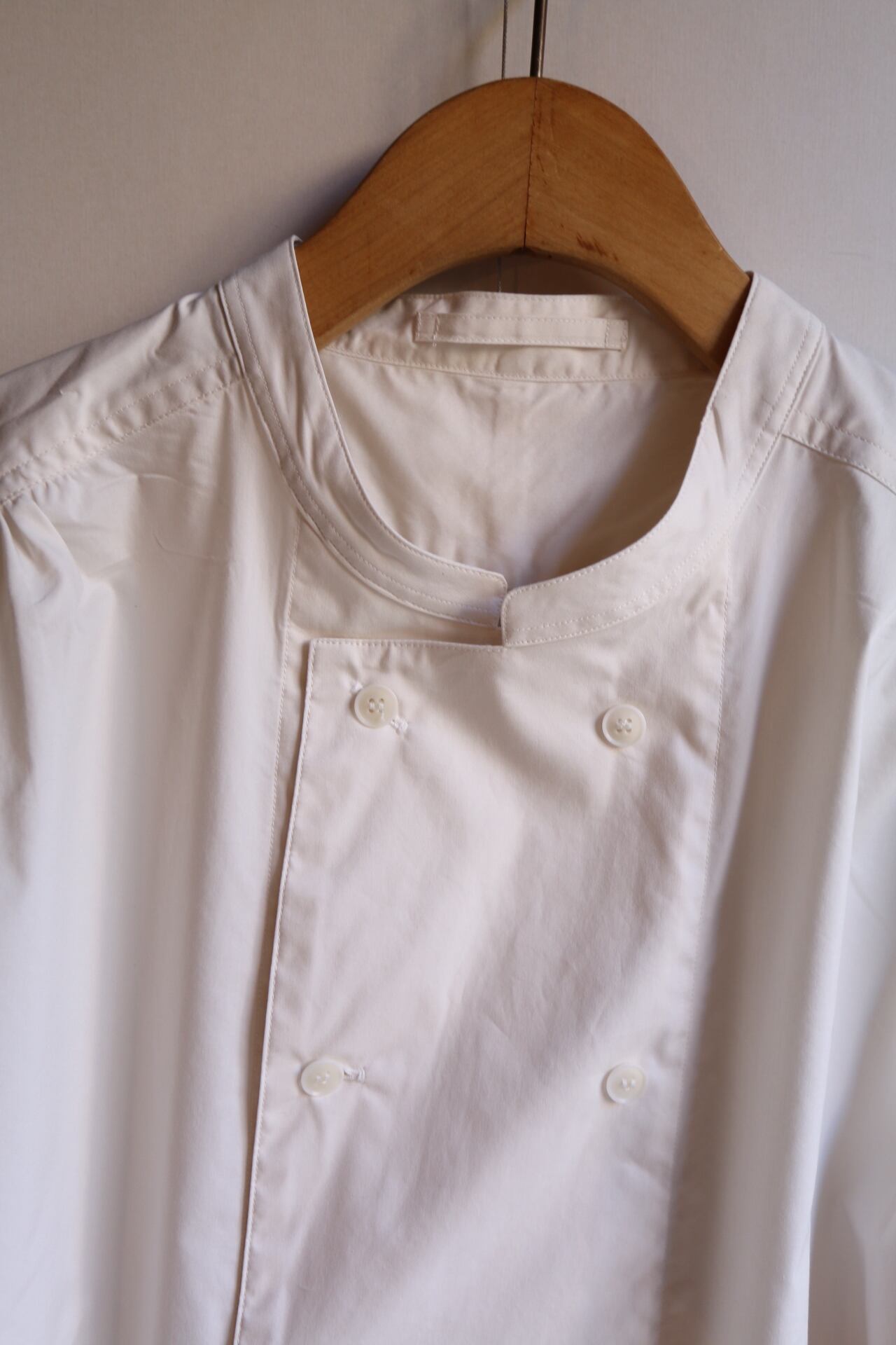 Handwerkerの定番シャツをベースに、コックさんの着る厨房服をイメージソースに、前の合わせをダのブルにしたスタンドカラーのシャツです。
