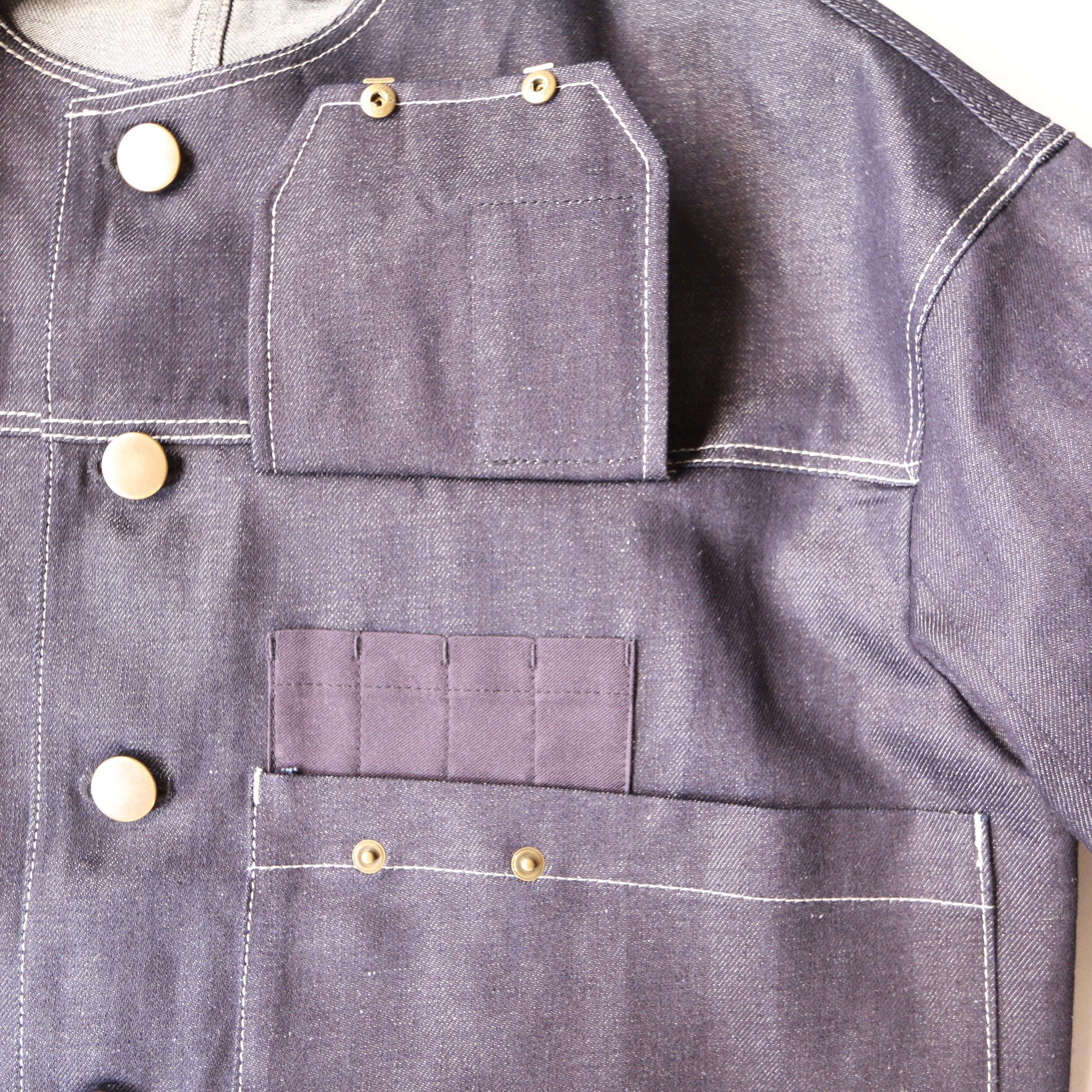 胸には大きめなフラップのついたポケットがあり、脇まで一体で、かつマチ付きなのでたっぷりとした容量があり、お財布やメモ帳などもはいります。胸ポケットの内側にはペン挿しも4本分あります。前身頃の裾が、斜めにカットされ、アンティークのワーカーズにあるようなすっきりとしたデザイン。デザイナー玉井健太郎さんのこだわりを感じます。