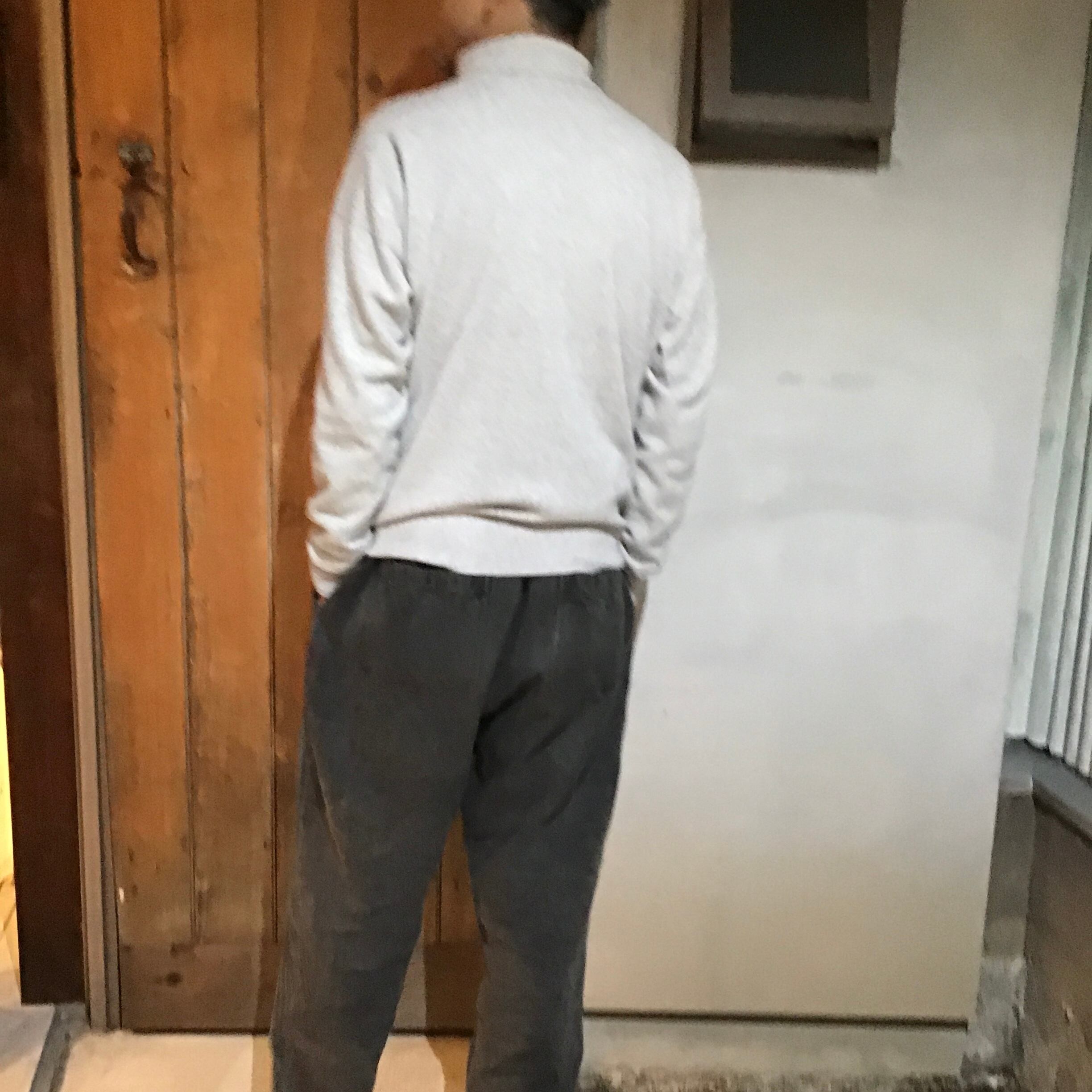 ホールガーメントという糸から1着まるごとの状態で、編み機から直接編成される機械を使って作っています。ホールガーメントは縫い代が無いのが特徴で、構造上の制約も多く無縫製の分かえって平面的に仕上がる事もあるのですが、逆にその特性を生かした平面的なセーターとなっています。前後差も無いので前後ろ逆でも着用が可能で、肩傾斜も水平、襟ぐり以外は直線で構成されています。ネック部分は折り返しても、そのままでも着ることができます。またホールガーメントの為、手縫いで付いている織りネームと品質表示を外せば裏表逆でも着用が可能です。リブは伸びてもスチームアイロンや水を通すと元に戻ります。素肌に着る事ができる位に柔らかな素材ですが、中に何か着た時にも比較的ゆとりのある作りになっています。