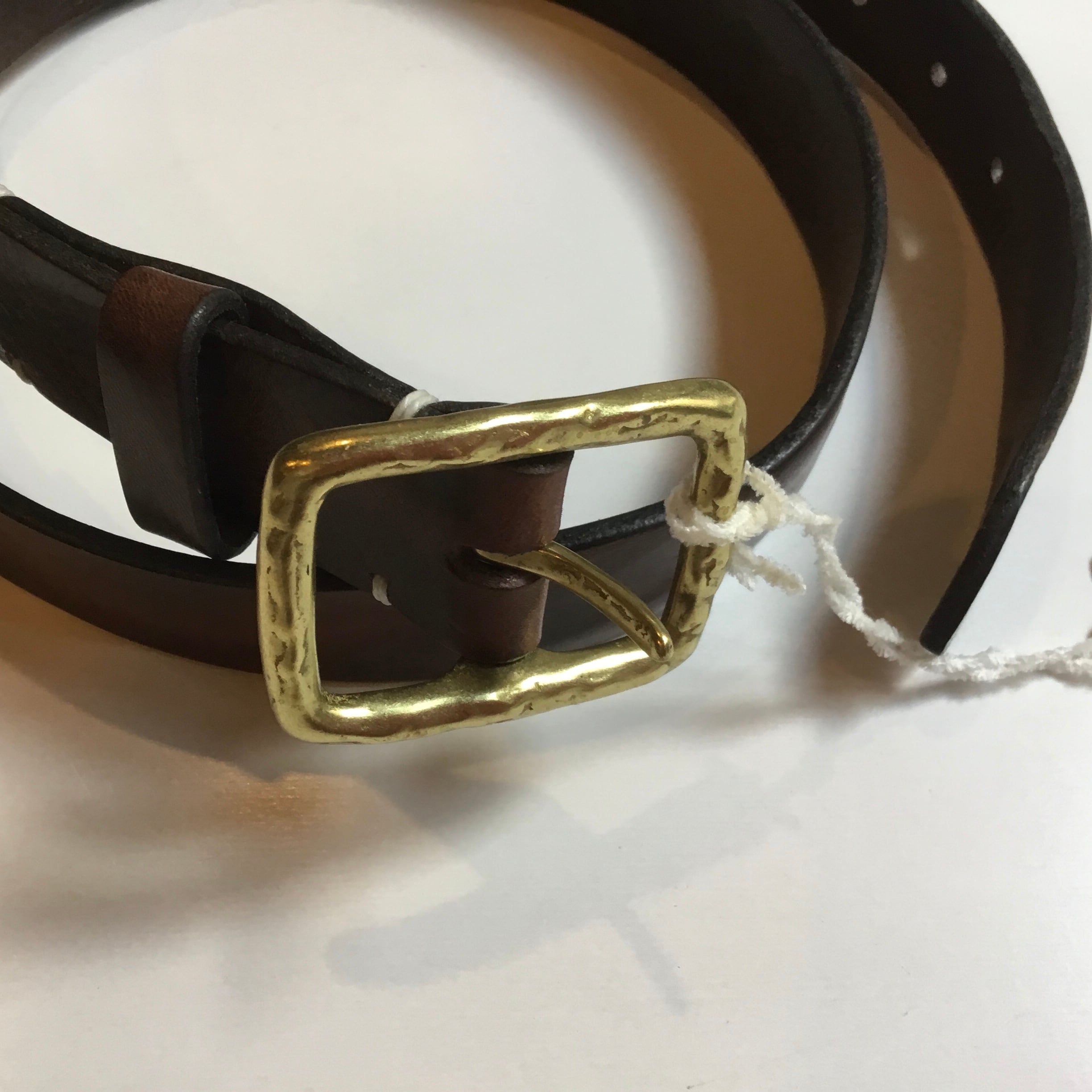 真鍮の味わいのあるバックル。厚みのあるしっかりとしたレザー。ウエスト最小74㎝から最大97㎝と幅のあるワンサイズのサイズ感。存在感のあるボトムス、デニムのコーデなどにぴったりの長くお使いいただけるベルトです。