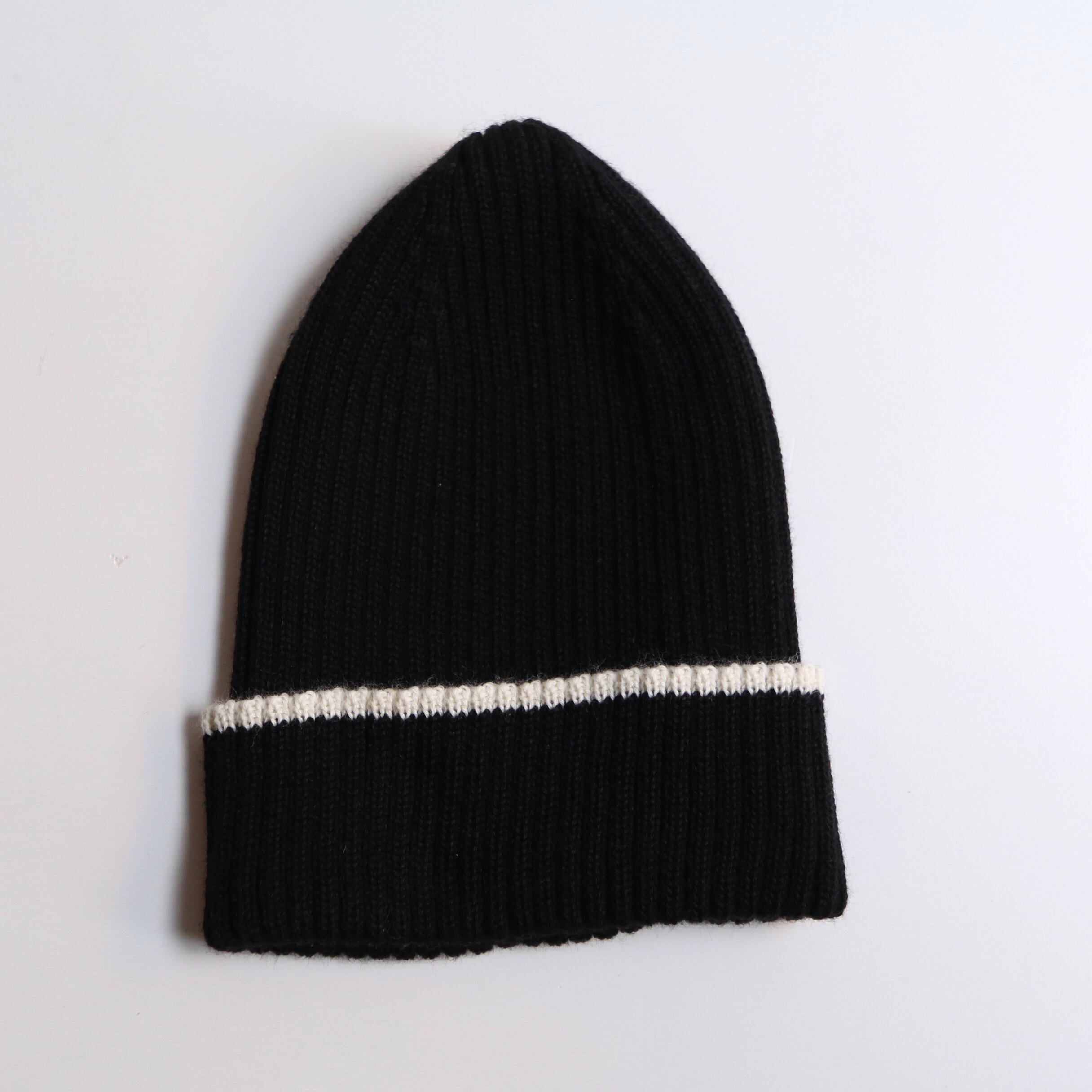 白いラインがアクセントの黒いニットキャップ。モードもカジュアルも両方いけるデザインです。