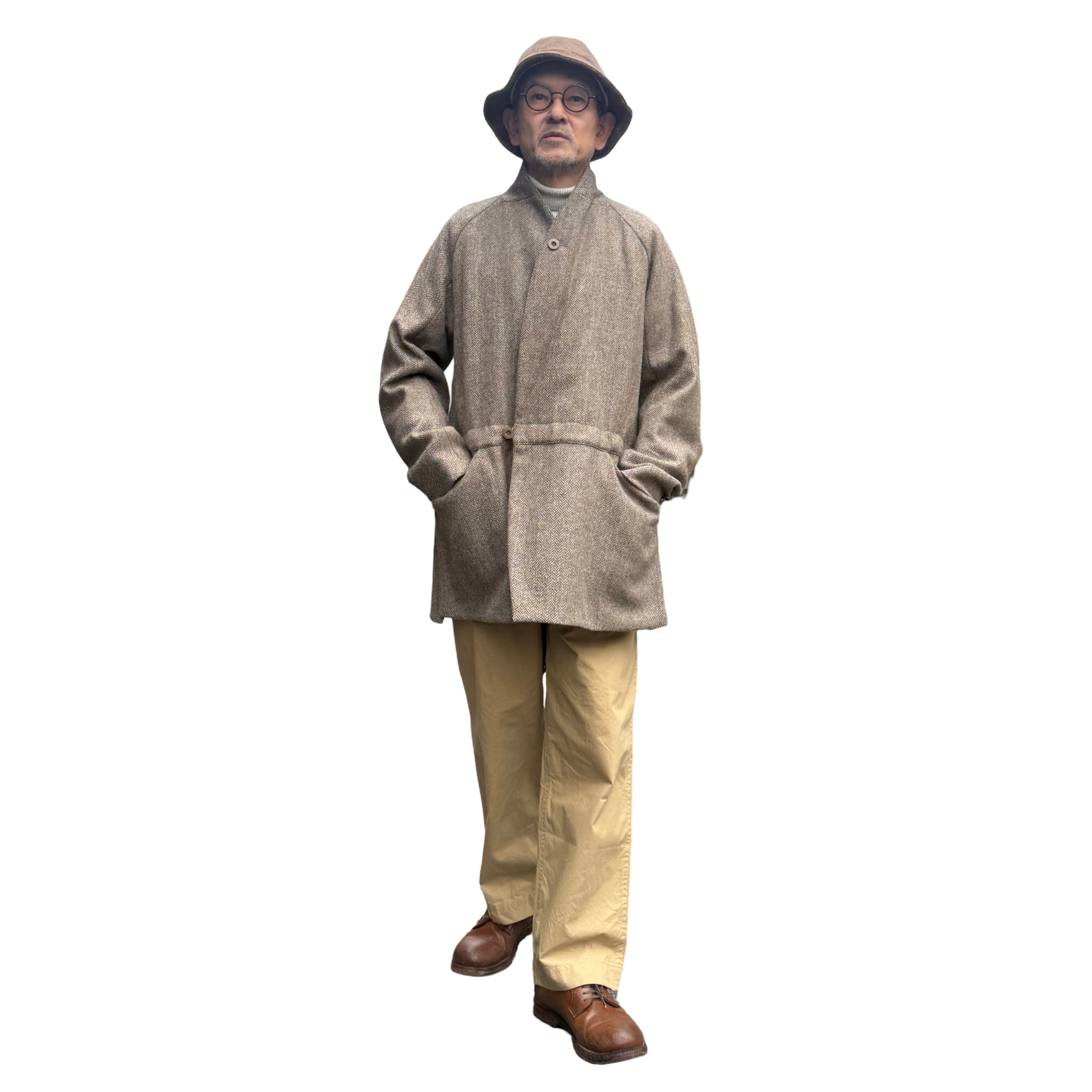 主人公が特別な日に装うガウンコート。ガウンのリラックス感は残しつつも、ヘチマカラーのカッティングやジャケット仕様の袖など正装着のきちんと感を併せ持つバランスです。中綿入りのふわっとしたシルエットをウエスト内側に配した紐で絞ってメリハリをつけることも。両脇には大き目のスリットがあり、パンツポケットへのアクセスがしやすいようになっています。