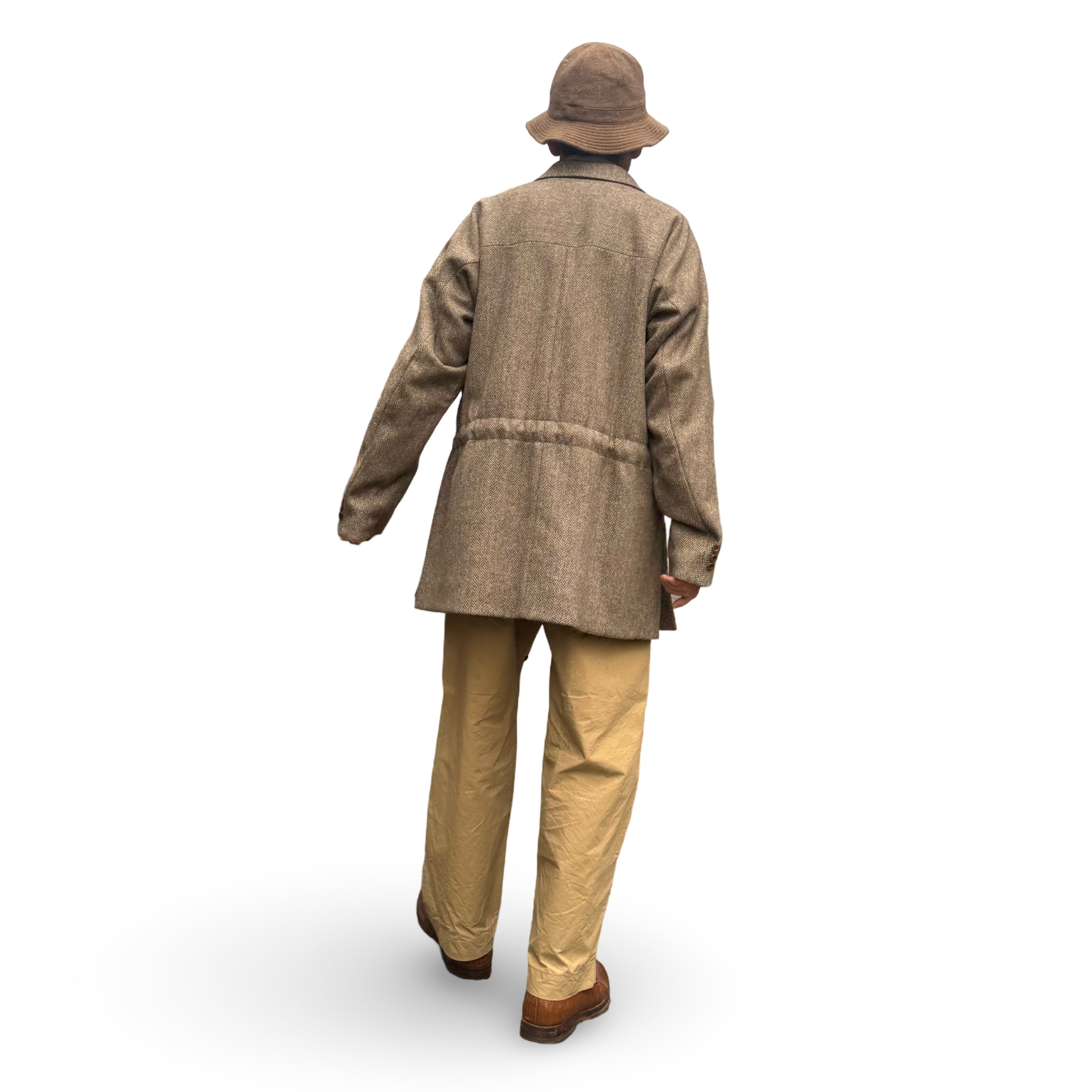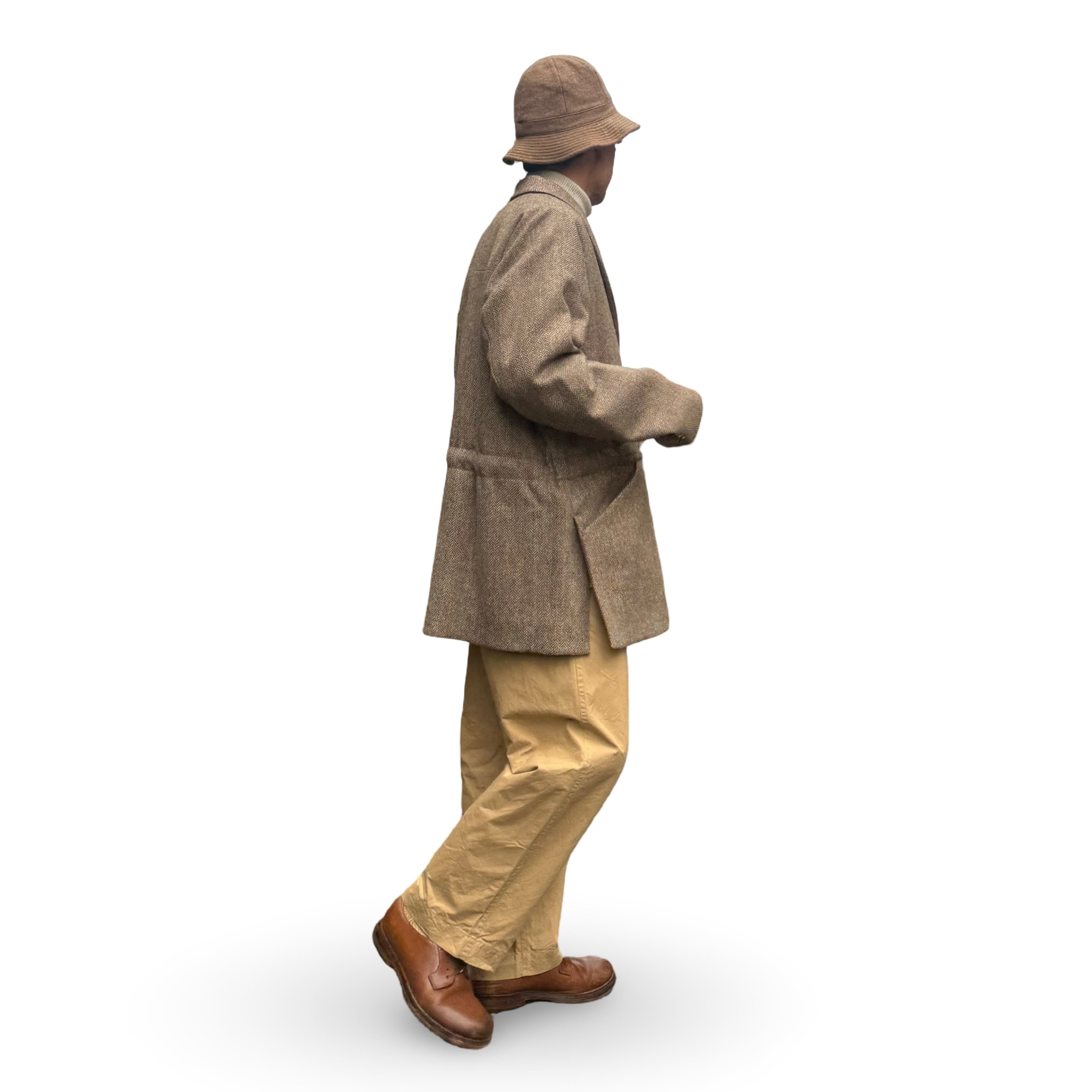 素材は英国の老舗生地メーカーMOON社のもの、北イングランド、ヨークシャーに1868年設立。以来ホームスパンの時代の記憶をよみがえらせるような古きよき時代のツイードを制作しています。経糸にライトブルーのメランジ系、緯糸にベージュのテキスタイルで自然奥行きのあるベージュです。