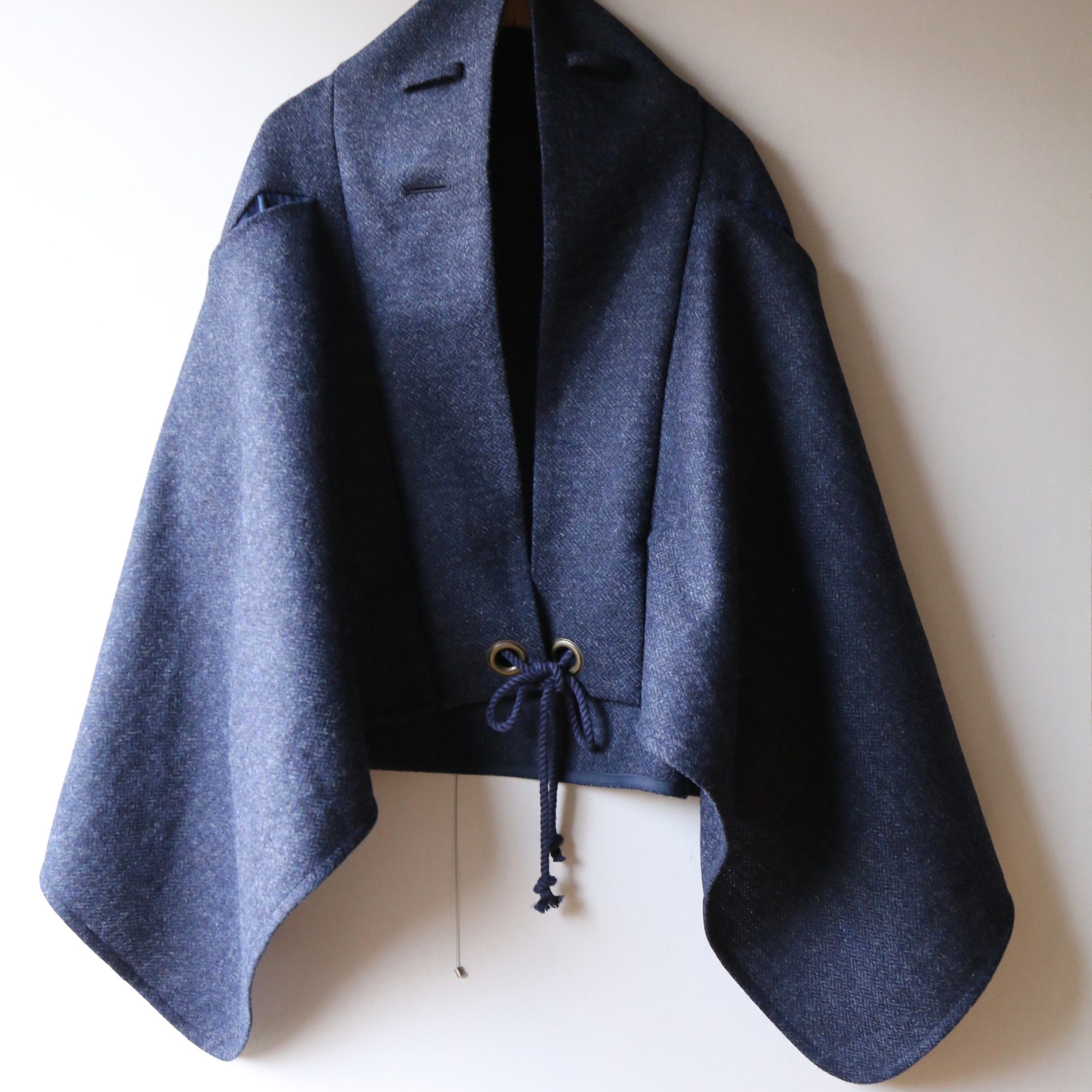 ウールブランケット素材を重ねることができます。また、ウールのウエストヨーク部分を折り返して前側の紐を結ぶとケープとしても着用できます。ウールヘリンボーンのスカートには稲穂と麦のリース柄が刺繍されており、お守りのようなしるしとなっています。