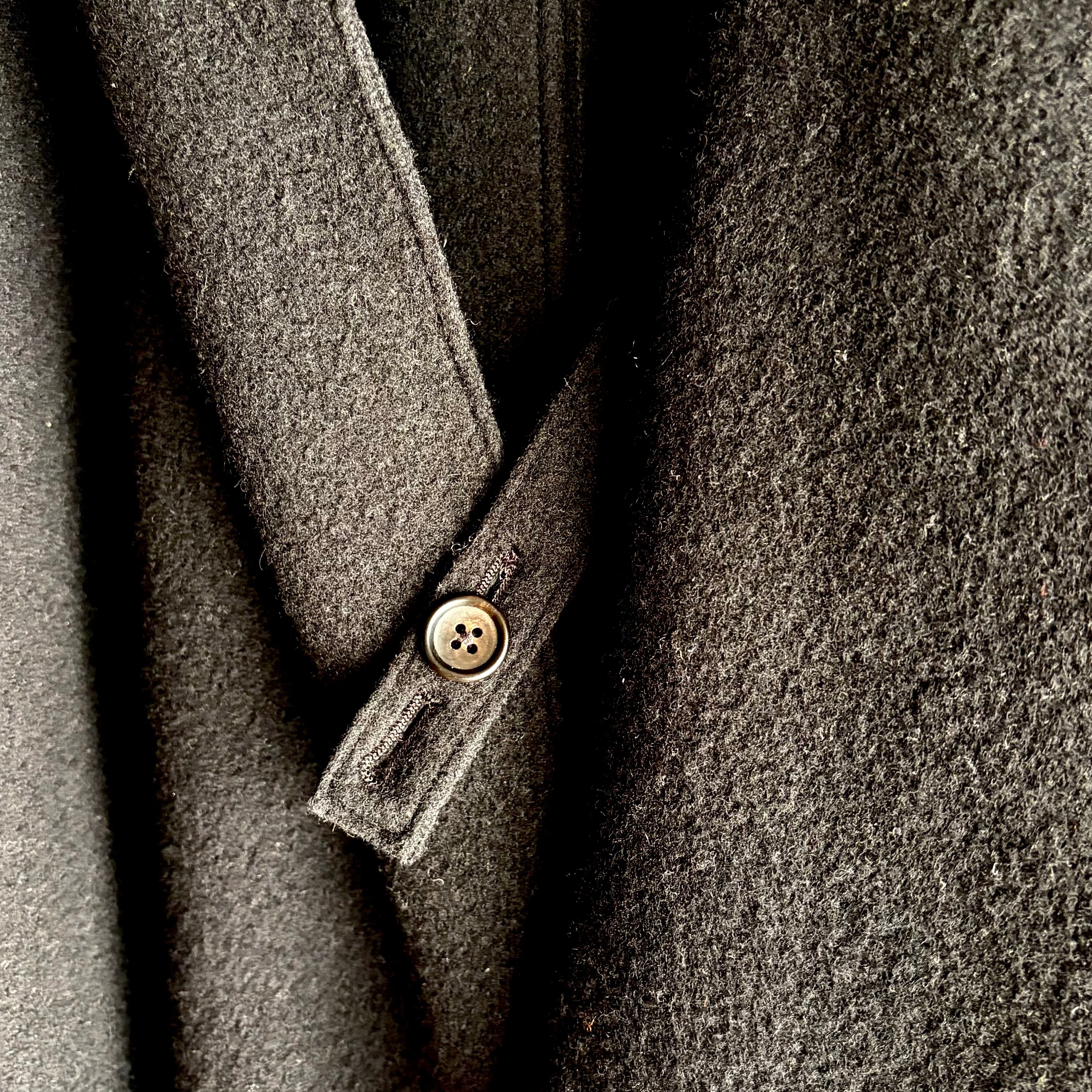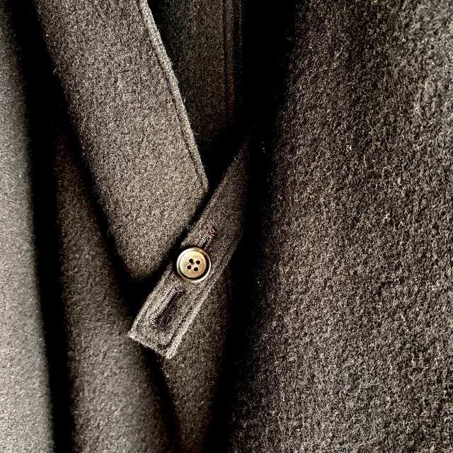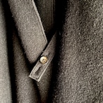 特徴的なのは、フロントの仕様です。首元と胸元のボタンに紐を掛ける独自の留め具デザインにより、前を閉めすぎることなく、自然なドレープを保ったまま着用いただけます。