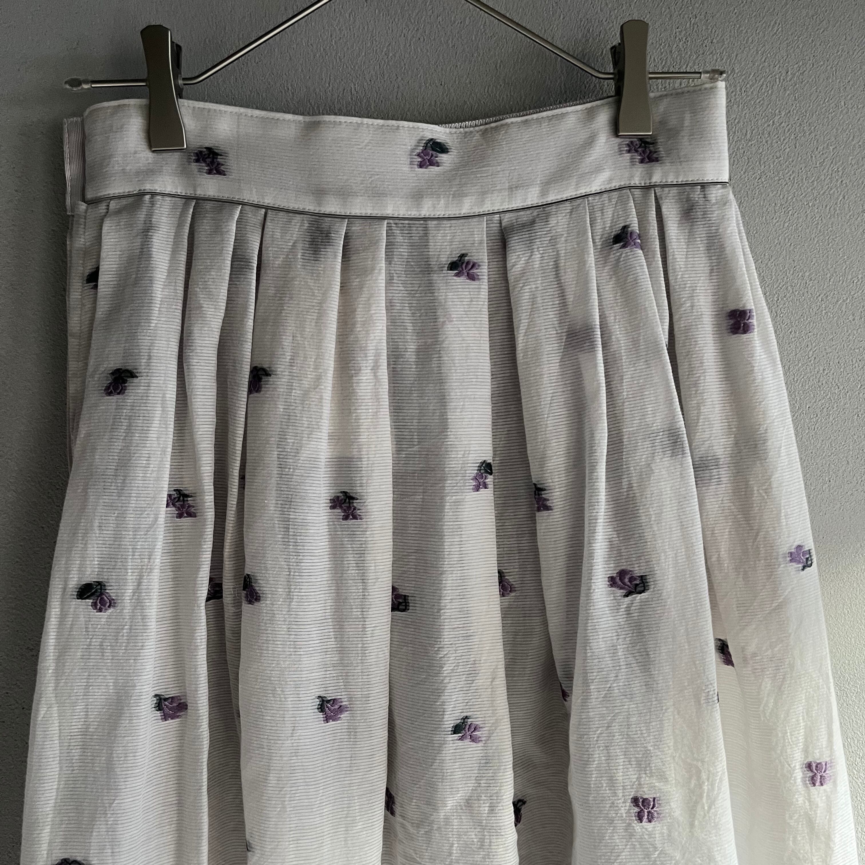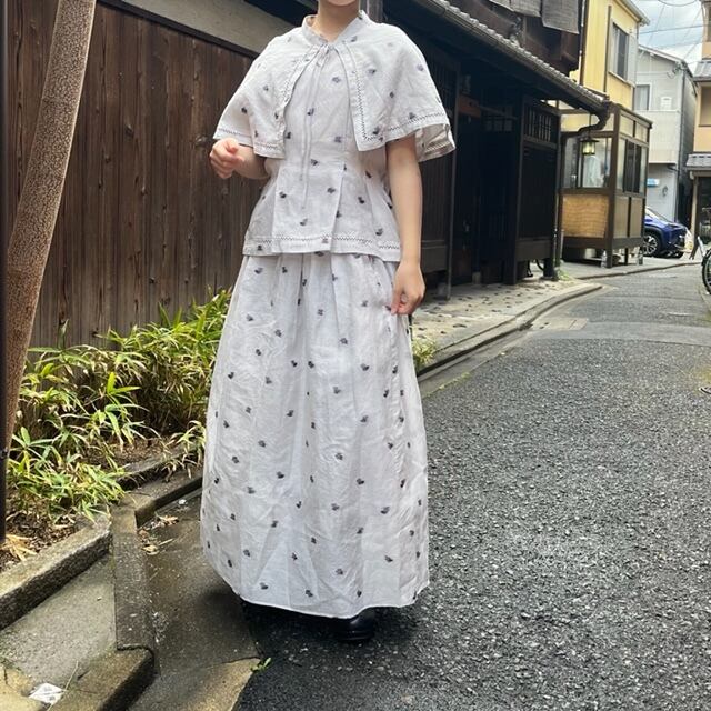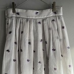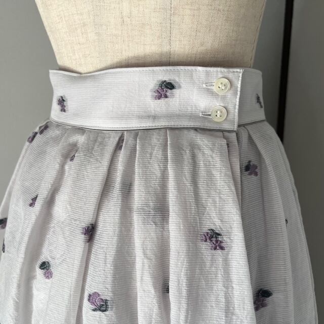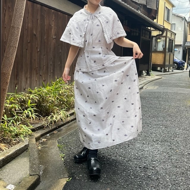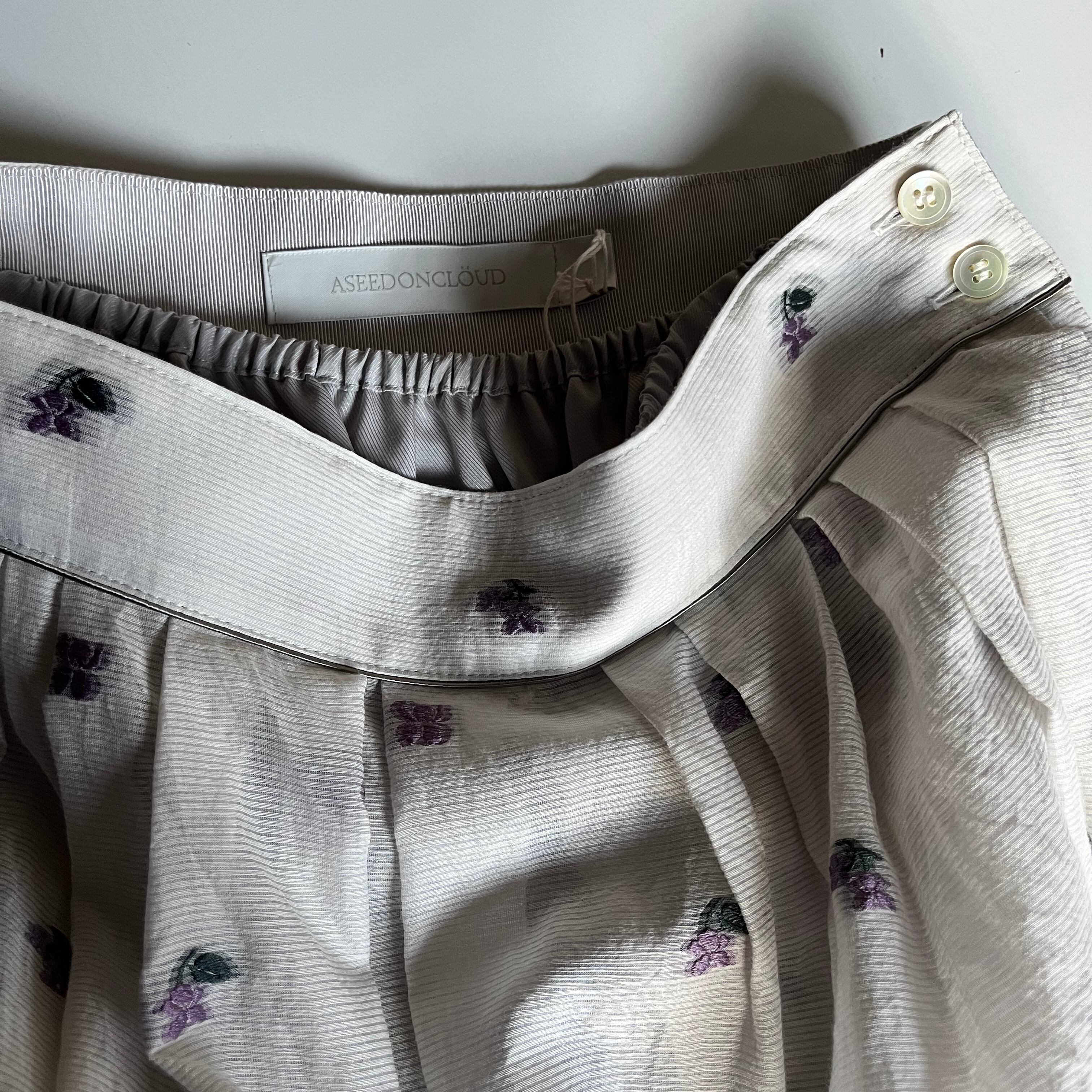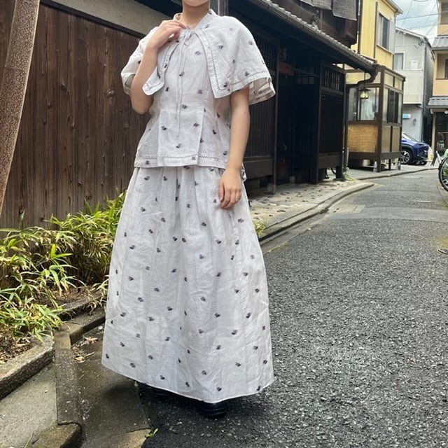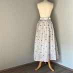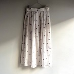 タックとギャザーでたっぷり分量が入っていて、ふっくらとしたシルエットになっています。透け感のある生地(プリントとカットジャガード)にはペチコートが付いていて、透けた時に足が綺麗に見えるよう高さになっています。本品はスカートのみで、着画をあわせているブラウスは別売りになります。