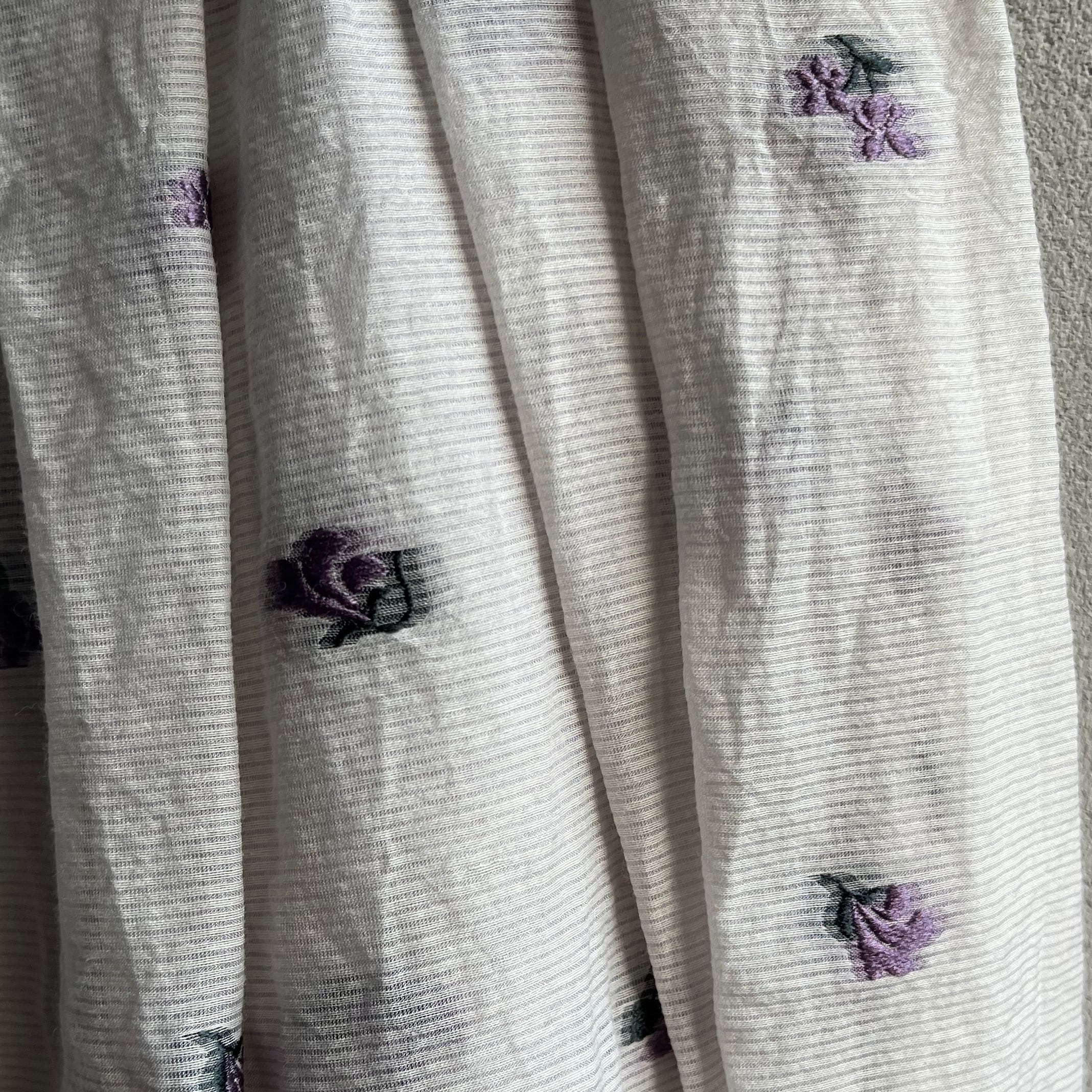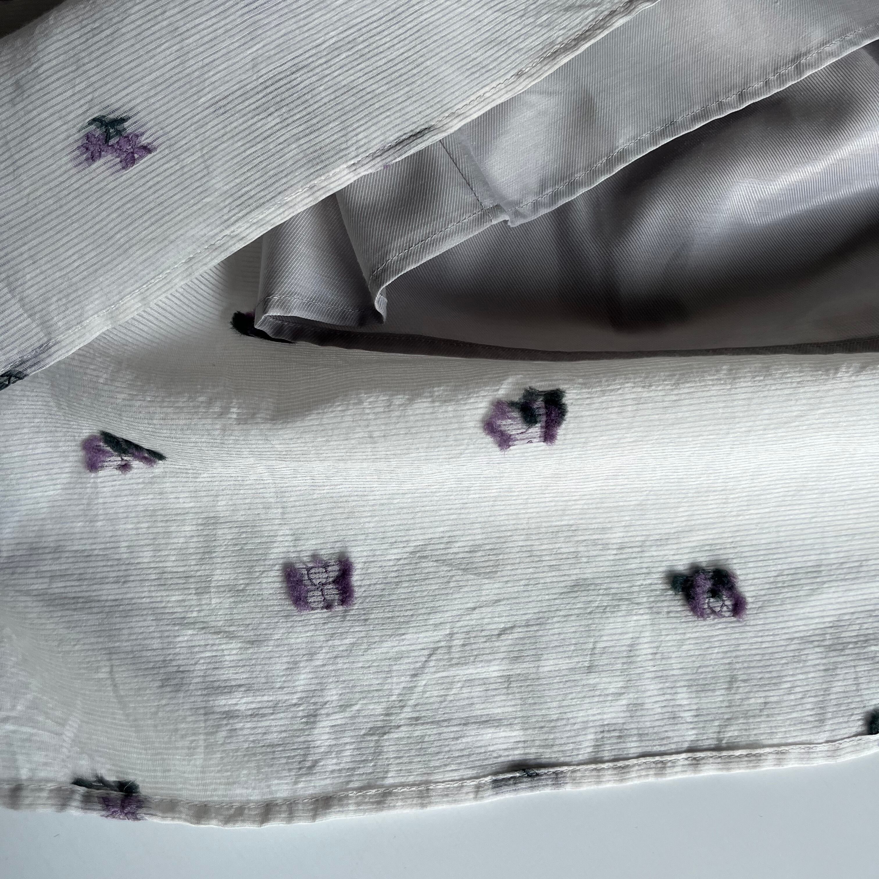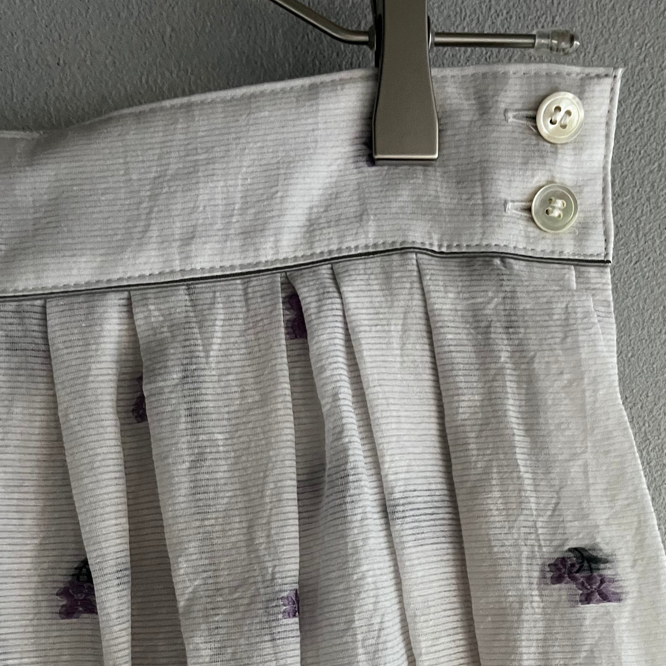 タックとギャザーでたっぷり分量が入っていて、ふっくらとしたシルエットになっています。透け感のある生地(プリントとカットジャガード)にはペチコートが付いていて、透けた時に足が綺麗に見えるよう高さになっています。本品はスカートのみで、着画をあわせているブラウスは別売りになります。