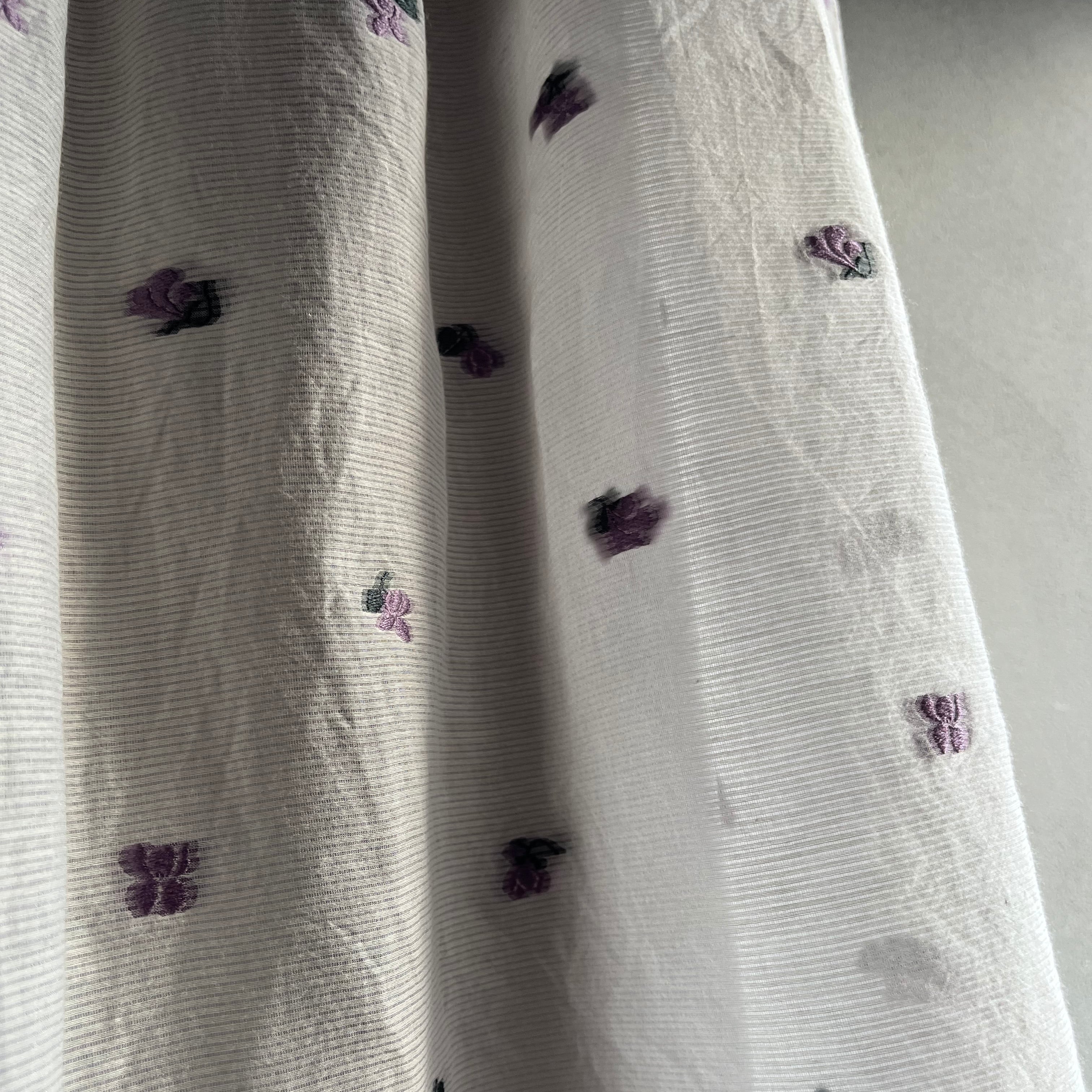 別名魔女のスミレと呼ばれています。修道士が少女たち一人一人の性格をツルニチソウの形で表現しており、10 種類のツルニチソウが施されたこの生地は修道士からのメッセージが込められています。ツルニチソウには「生涯の友情」「楽しい思い出」「悪いものを寄せ付けない」などという意味もあります。透け感の強い生地にカットジャガードをすることにより、少しにじみのあるような素敵な花柄に仕上がりました。