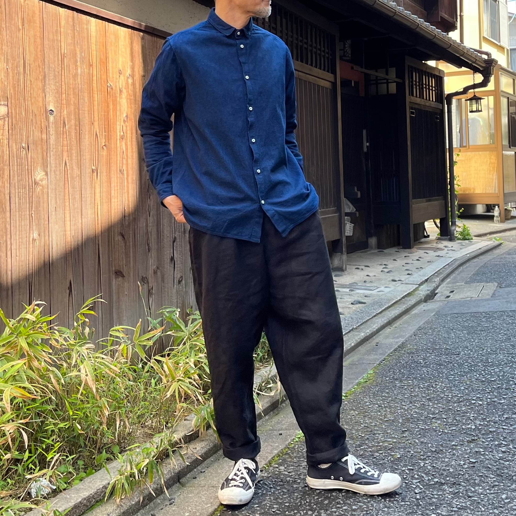 ※天然藍で染色をしています。着用を繰り返す事で淡い色へと変化していきます。色移りを避ける為淡色との組み合わせはお控えください。洗濯の際は中性洗剤を使用し、陰干ししてください。染め直しの際はご相談ください。