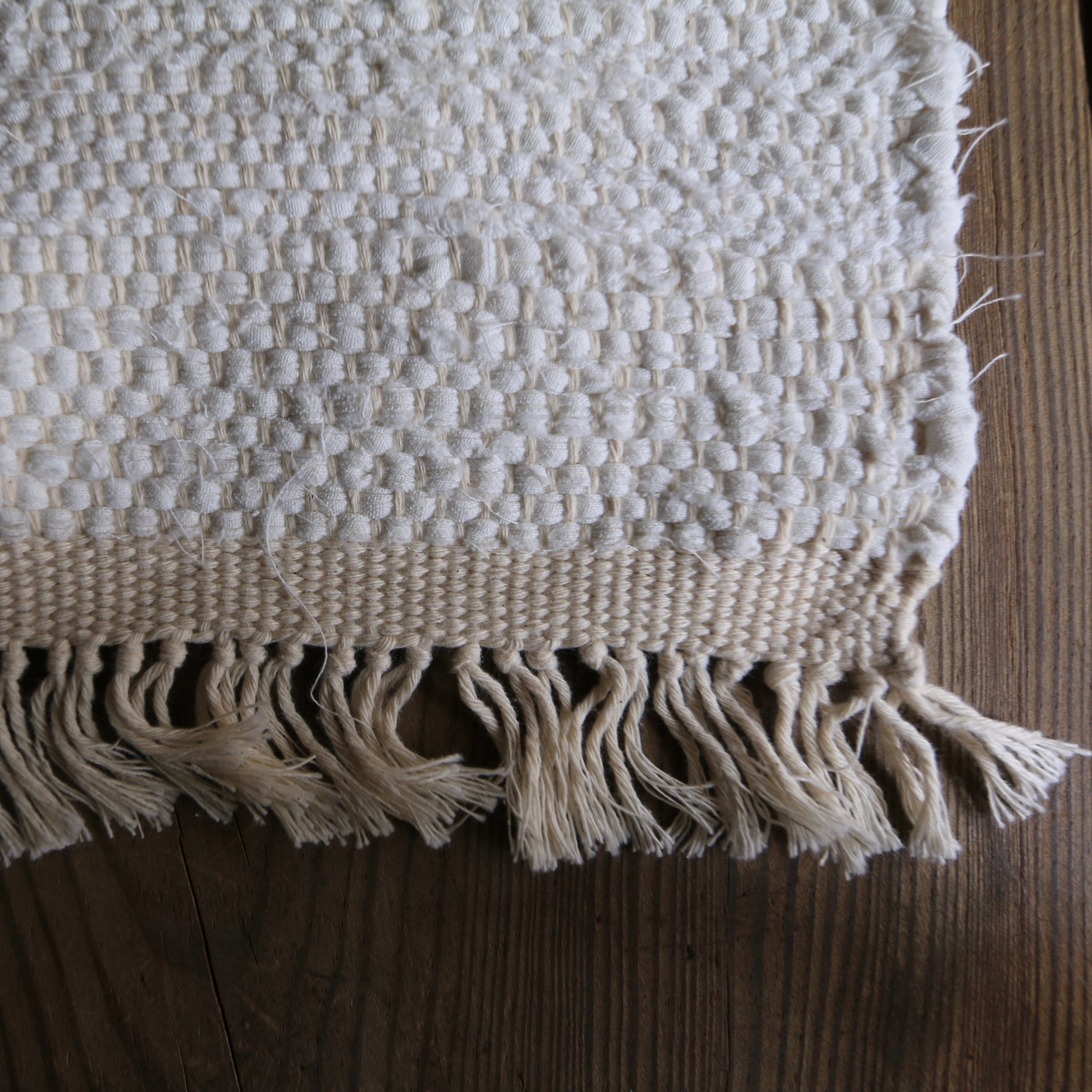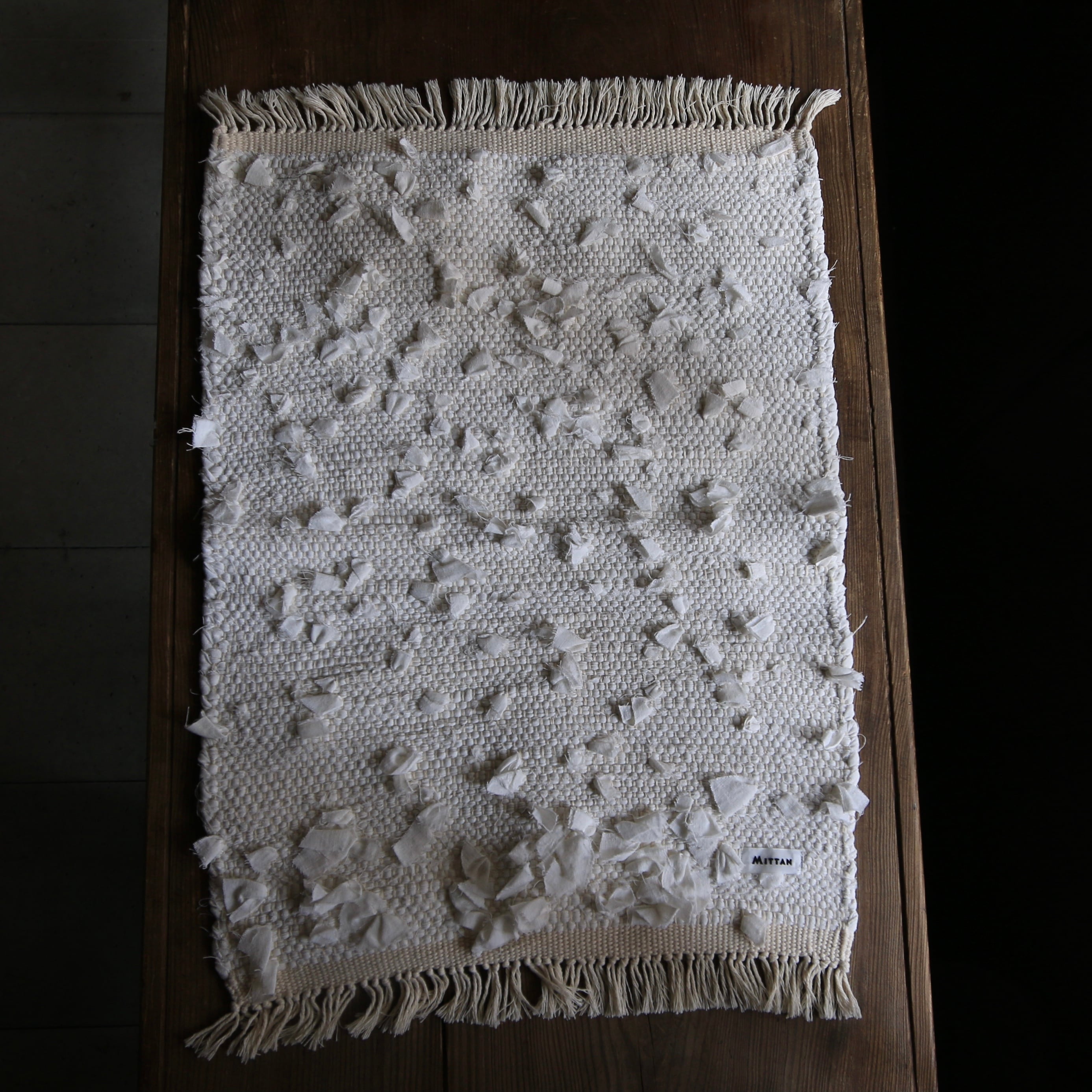 使用しているカディはインド・西ベンガルで経糸緯糸共に手紡ぎ、手織りで作られている、比較的短繊維のデシコットンを主体とした綿織物になります。こちらの裂織マットの緯糸にはカディの生地を使った他の製品を裁断する時に出る、端切れを手で裁断したものを、経糸にはリサイクルの綿糸を使用しています。