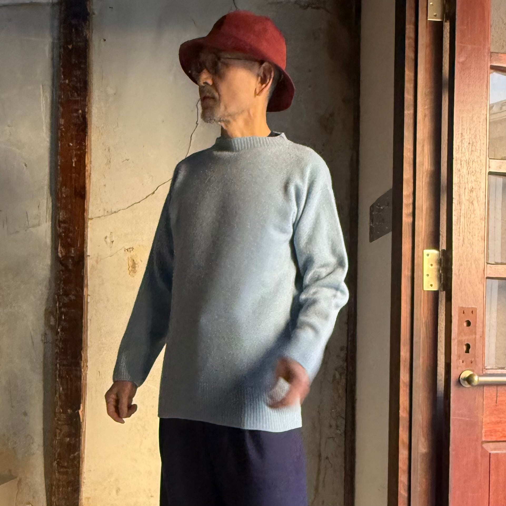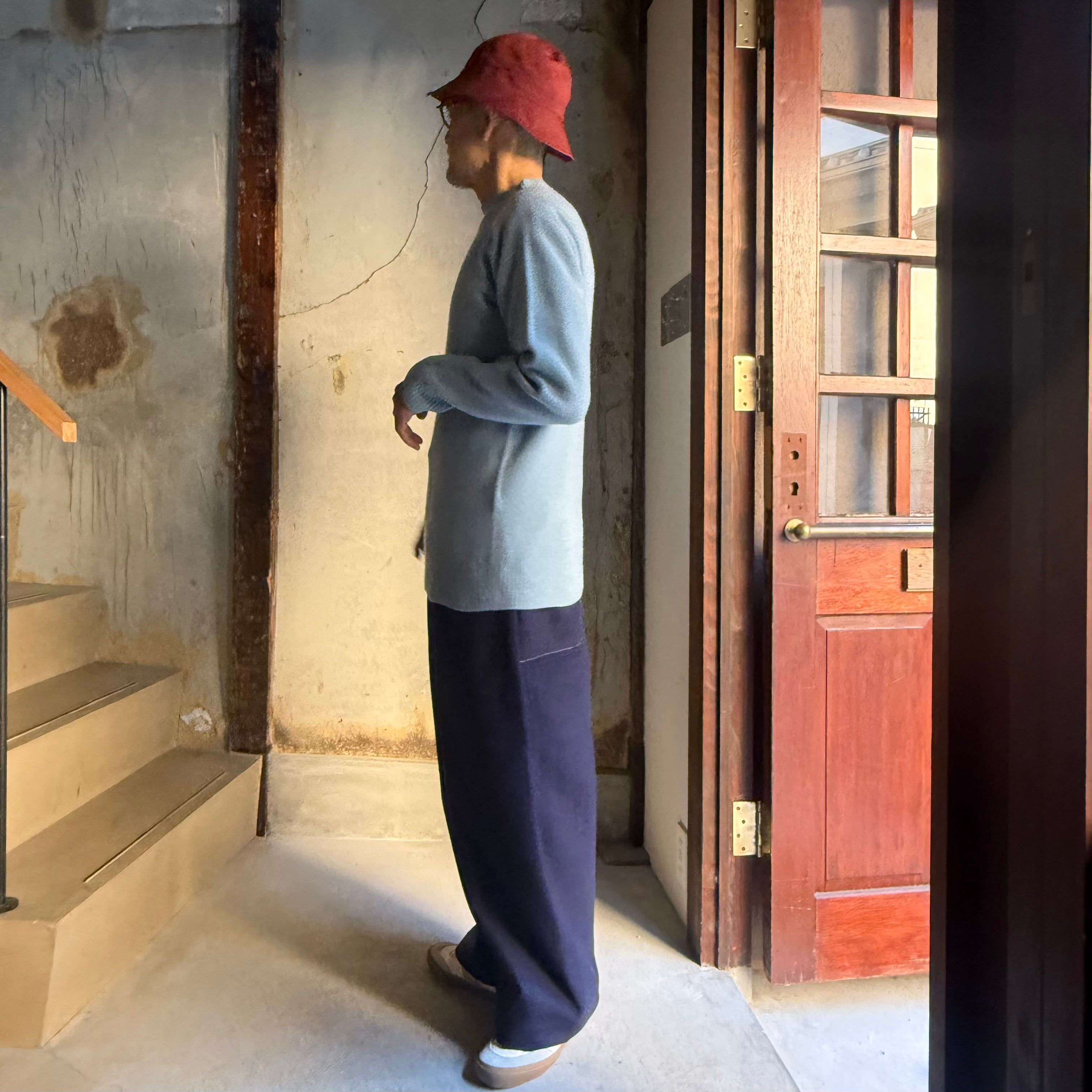 糸は南米ウルグアイのウルグアイ産の平均繊度15.5マイクロンの超極細メリノウールを使用しています。滑らかでありながら嵩高性があり、カシミヤに近い肌触りで、糸を2本取りにすることで、適度なボリュームが生まれたミドルゲージのニットになります。原料を大阪は泉州の紡績工場、深喜毛織さんが紡績しています。編み立ての工場は福島の葛尾村にあり、愛知県岡崎に本社工場を持つ金泉ニットさんが国の自立・帰還支援雇用創出企業立地補助金を活用して設立されました。ほぼ日さんの記事に詳しいので参照ください。