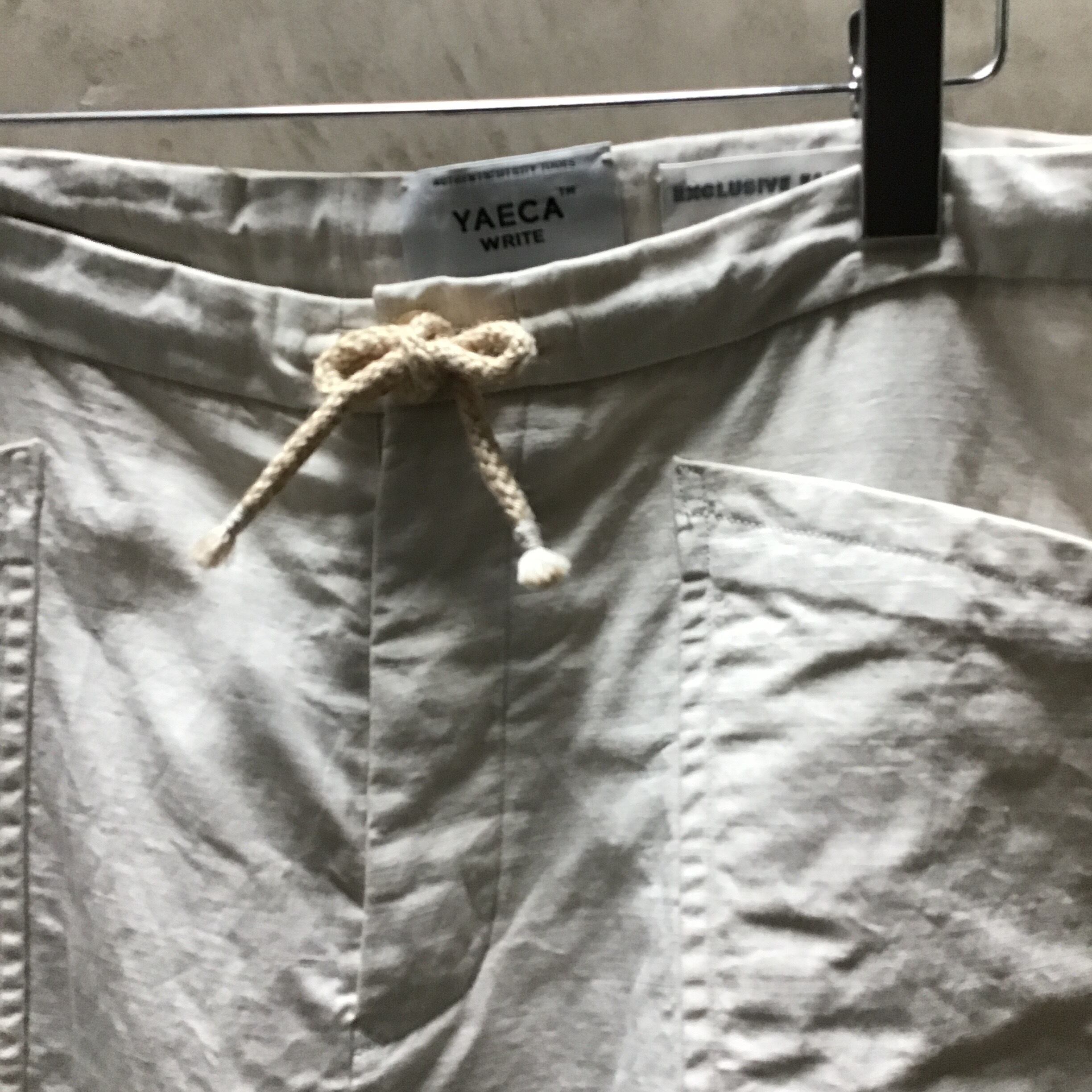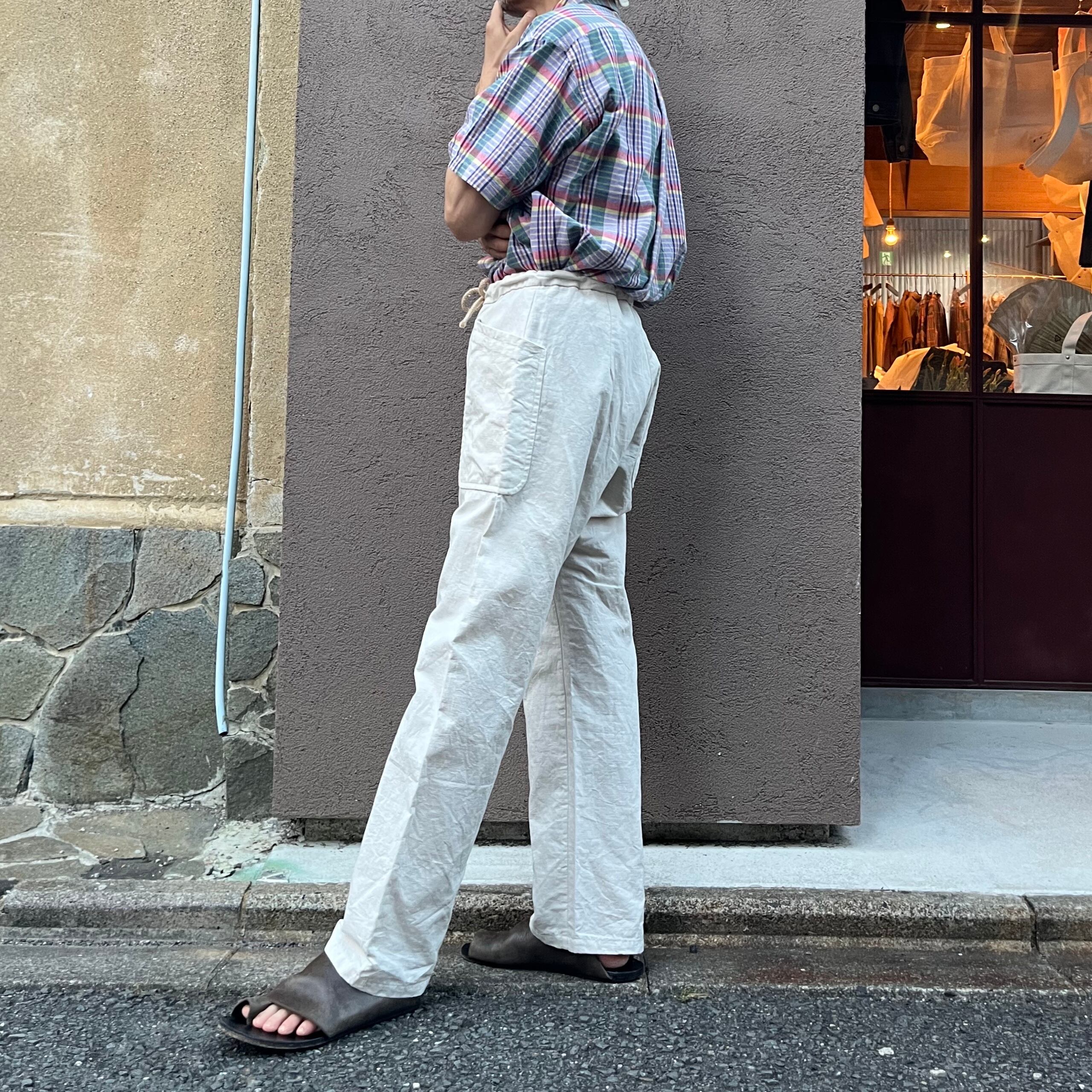 WRITEラインのYAECAオリジナルテキスタイルを使用。自然色のコットンとリネンが杢のような豊かなブレンドの表情をした、上質なテキスタイルです。飴色のボタンフライで開くフロントに、ウエストには太い麻ひもがめぐらされており、ベルトなしで