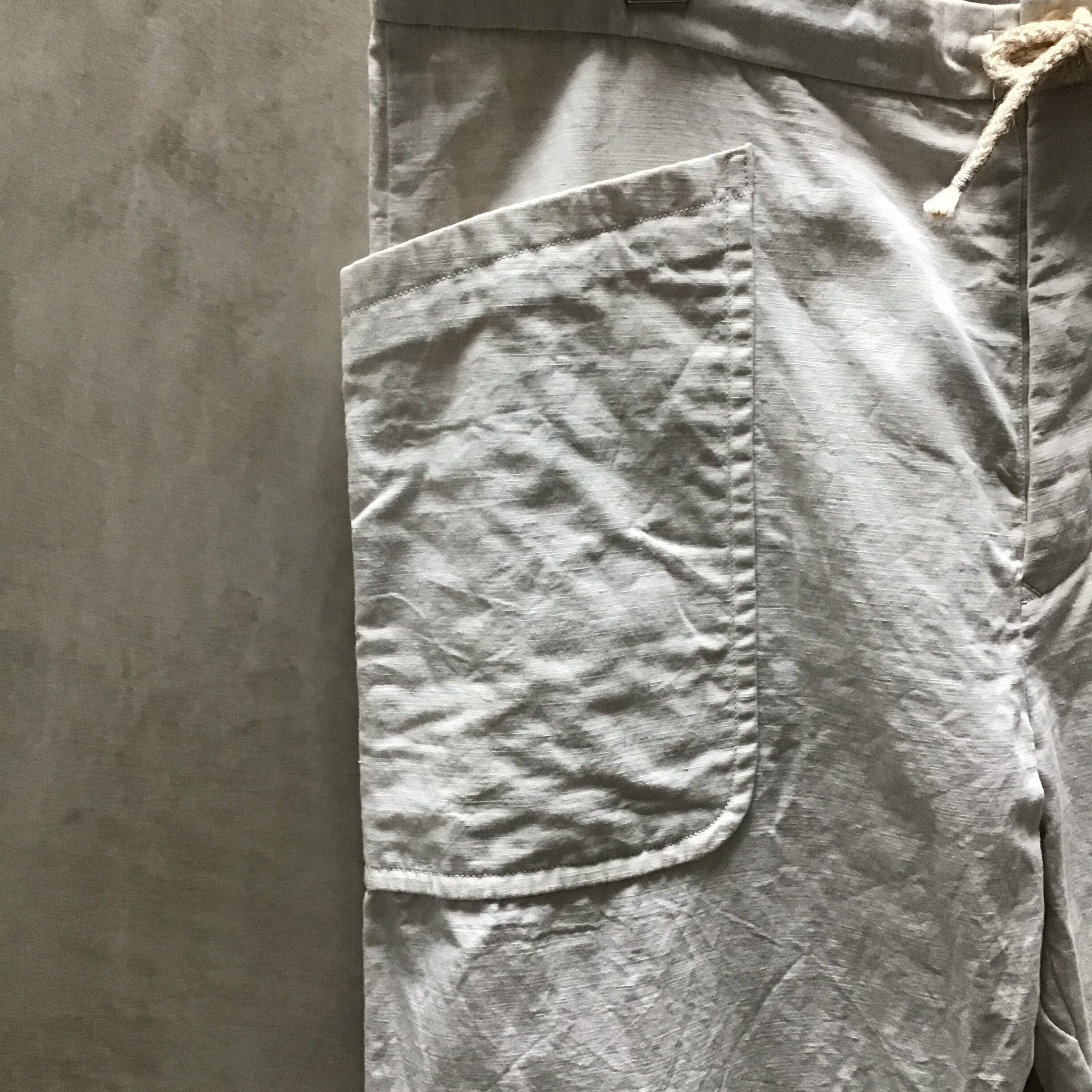 紐を縛ってウエストを調整することができます。少しオーバーサイズ気味のフロント左右のポケットにはスマホや小さいお財布なども入れることができ、右後ろにはもう一つバックポケットがついています。ポケット隅の細かいステッチや、フロント左のポケットの中にあるコインポケットなど上品なワーク感の漂う、シルエットのきれいなイージーパンツです。