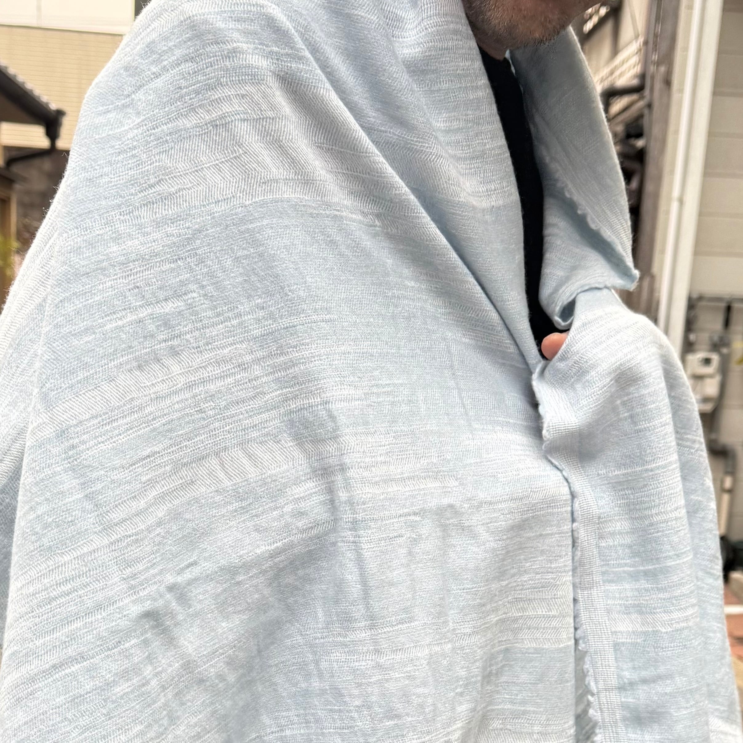 通常の工業製品と異なり、製織後にカット・縫製した後に一枚一枚縮絨をかけることで、それぞれに違った表情が生まれています。生地幅も場所によって一定では無い為、よりウールが縮絨するという自然の工程を体感していただけます。通常のストール使いの他にも肩にかけて使用することができます。