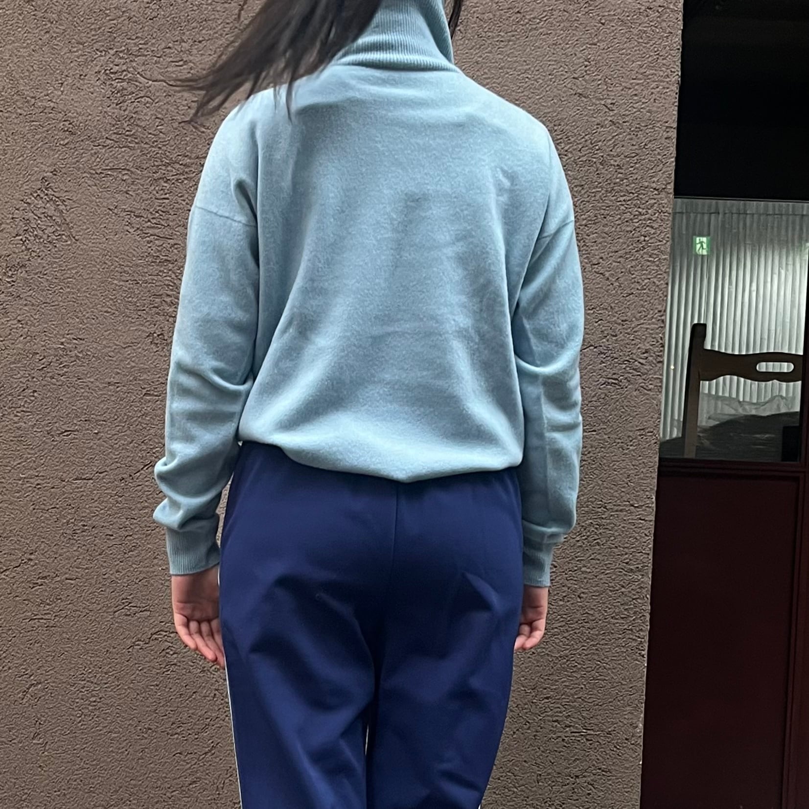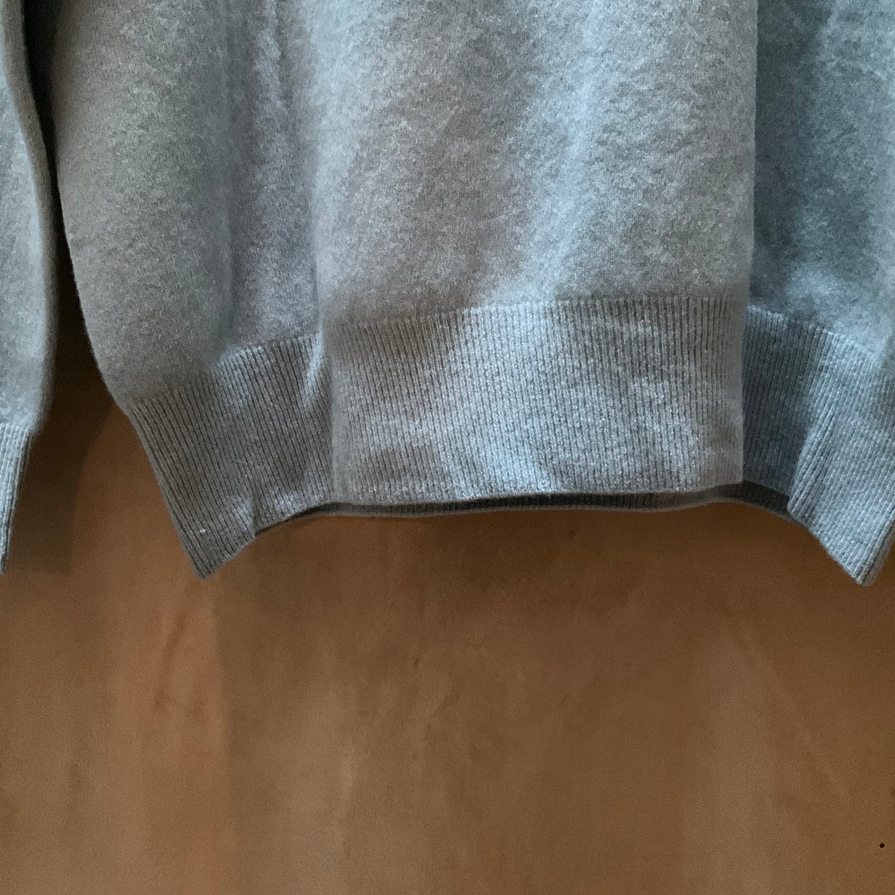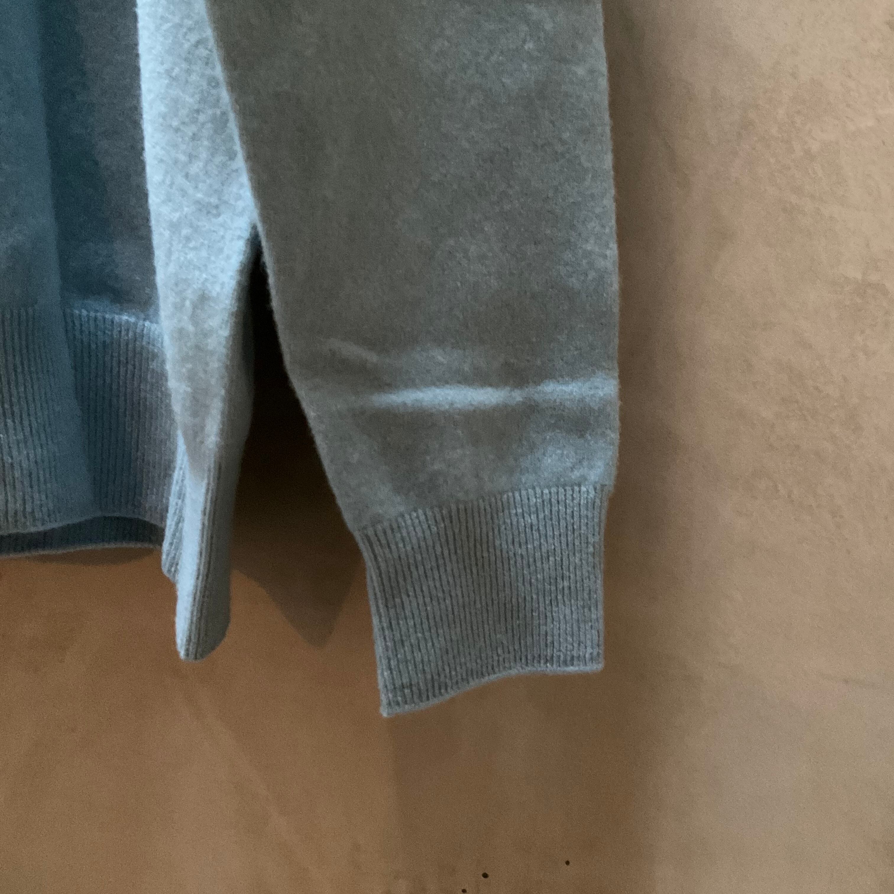 ホールガーメントという糸から1着まるごとの状態で、編み機から直接編成される機械を使って作っています。ホールガーメントは縫い代が無いのが特徴で、構造上の制約も多く無縫製の分かえって平面的に仕上がる事もあるのですが、逆にその特性を生かした平面的なセーターとなっています。前後差も無いので前後ろ逆でも着用が可能で、肩傾斜も水平、襟ぐり以外は直線で構成されています。ネック部分は折り返しても、そのままでも着ることができます。またホールガーメントの為、手縫いで付いている織りネームと品質表示を外せば裏表逆でも着用が可能です。リブは伸びてもスチームアイロンや水を通すと元に戻ります。素肌に着る事ができる位に柔らかな素材ですが、中に何か着た時にも比較的ゆとりのある作りになっています。