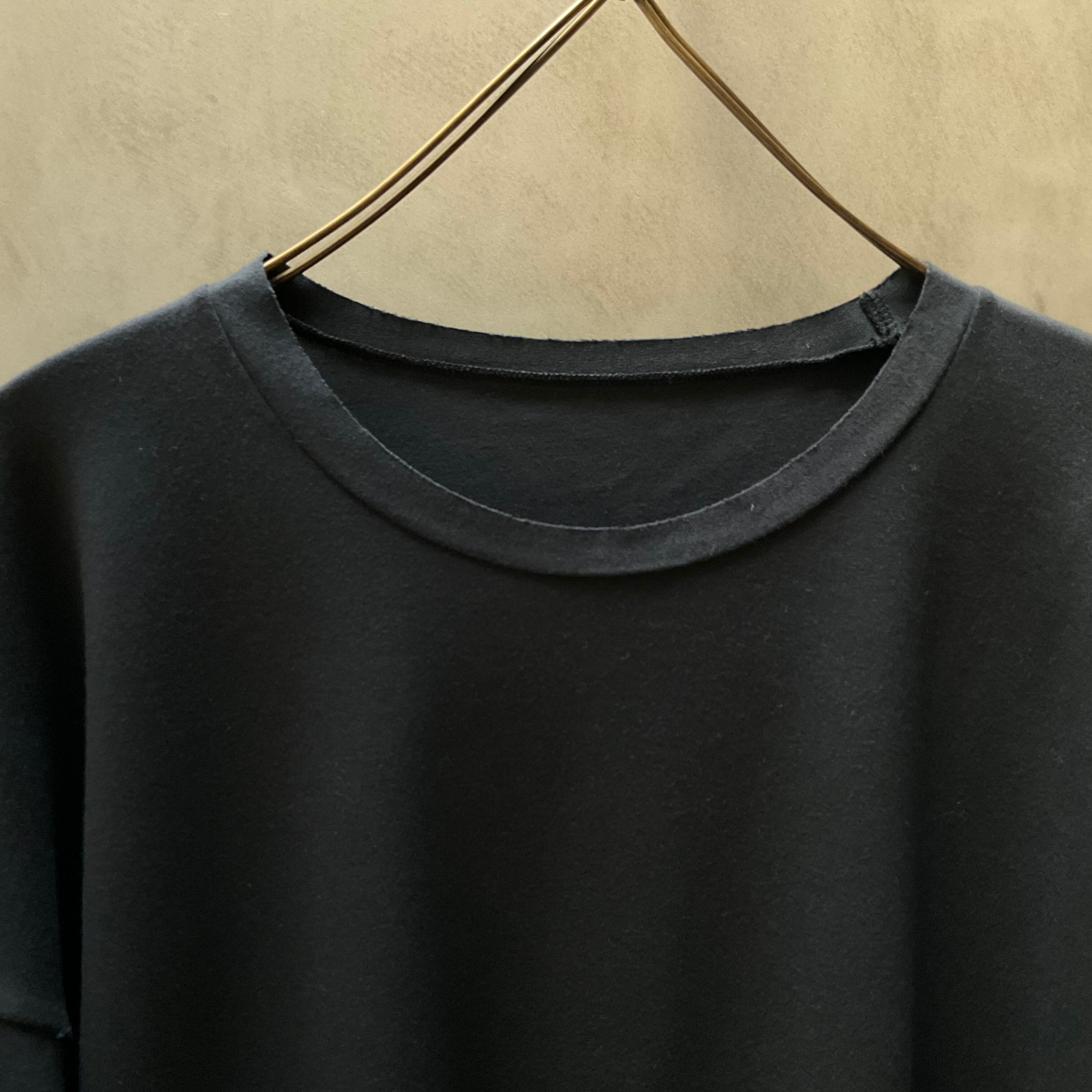 襟ぐり以外はすべて直線、台形の袖以外は長方形のパターンで構成された非常に平面的なTシャツで、着物のように多くの方の体型に自然に馴染みます。衿端、袖口、裾口は切りっ放しのパーツの切り替えになっていますが、両面編みで編んでいる為に端も解けにくく、丸まりにくいです。また、サイズが変わっても襟ぐりの大きさは変わりません。全て綿糸で縫製しています。