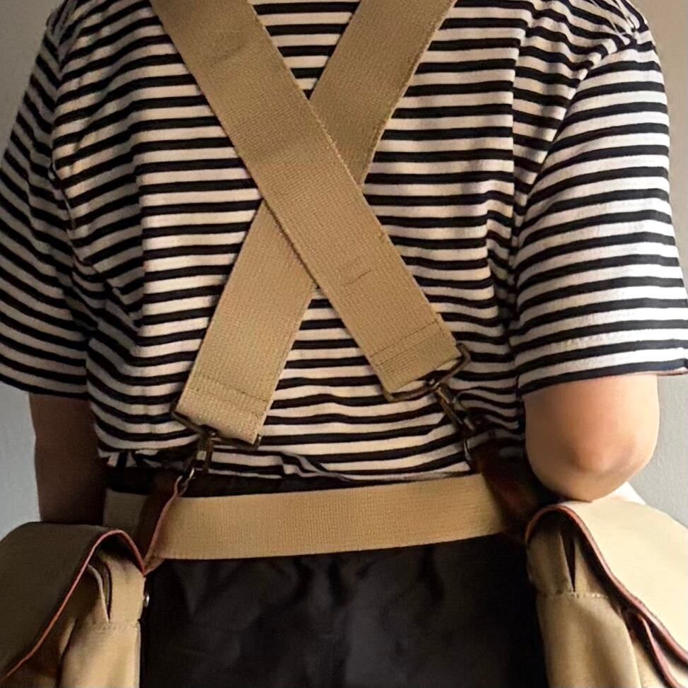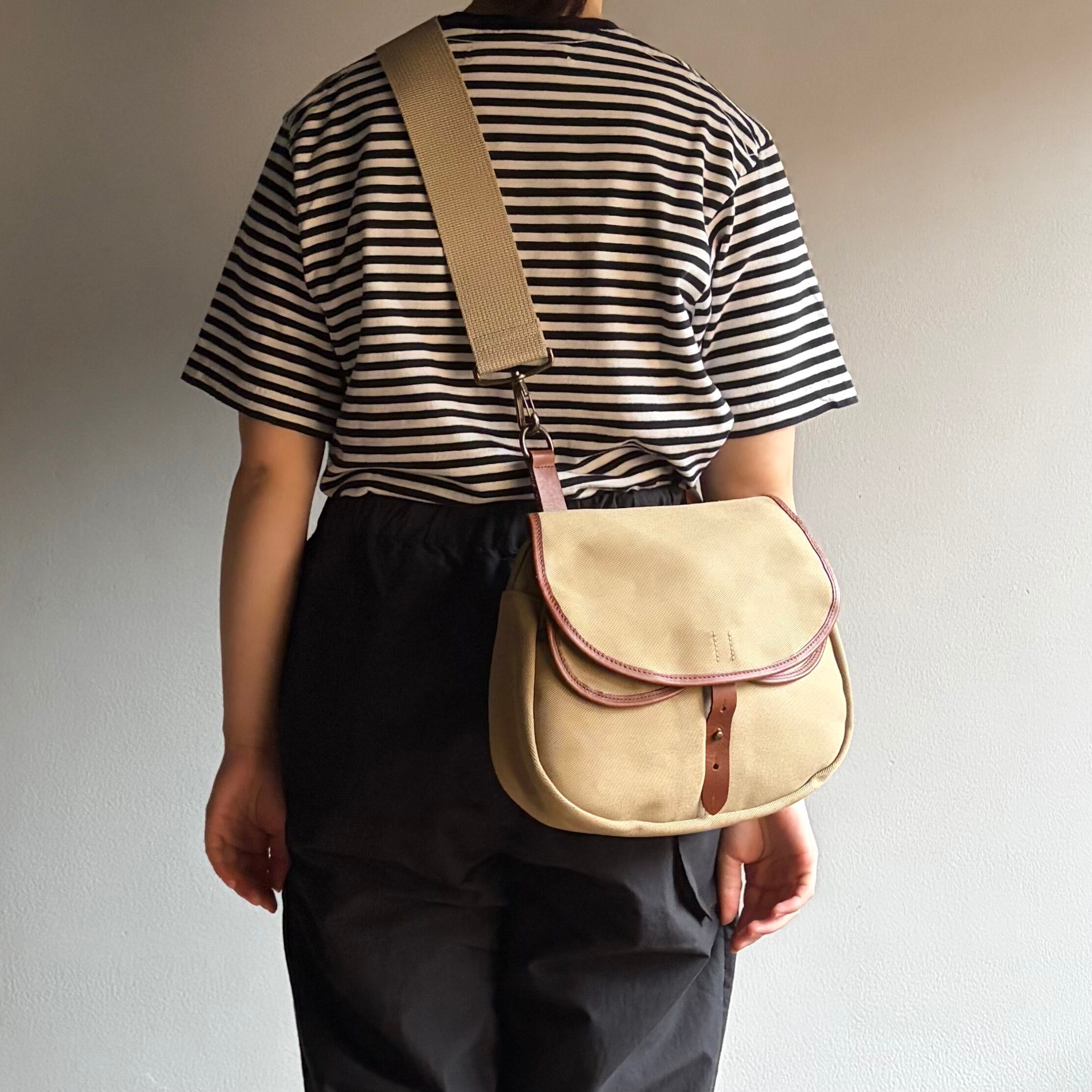 写真のように両側にポケットのようにかけたり、ウエストポーチ、ショルダーバッグ、ハンドバッグとしても使えます。スナップボタンをとめると一つのコロンとしたショルダーになります。物語では、記憶を拾う道具はフラップの無い方のバッグに入れ、拾った記憶はフラップがある方のバッグに入れ、保管庫に着くとメンバー四人決められた場所に同じようにバッグを壁にかけるように使います。物語の世界観が具現化したオリジナルのバックです。色はベージュと黒の二色。どちらも魅力的。