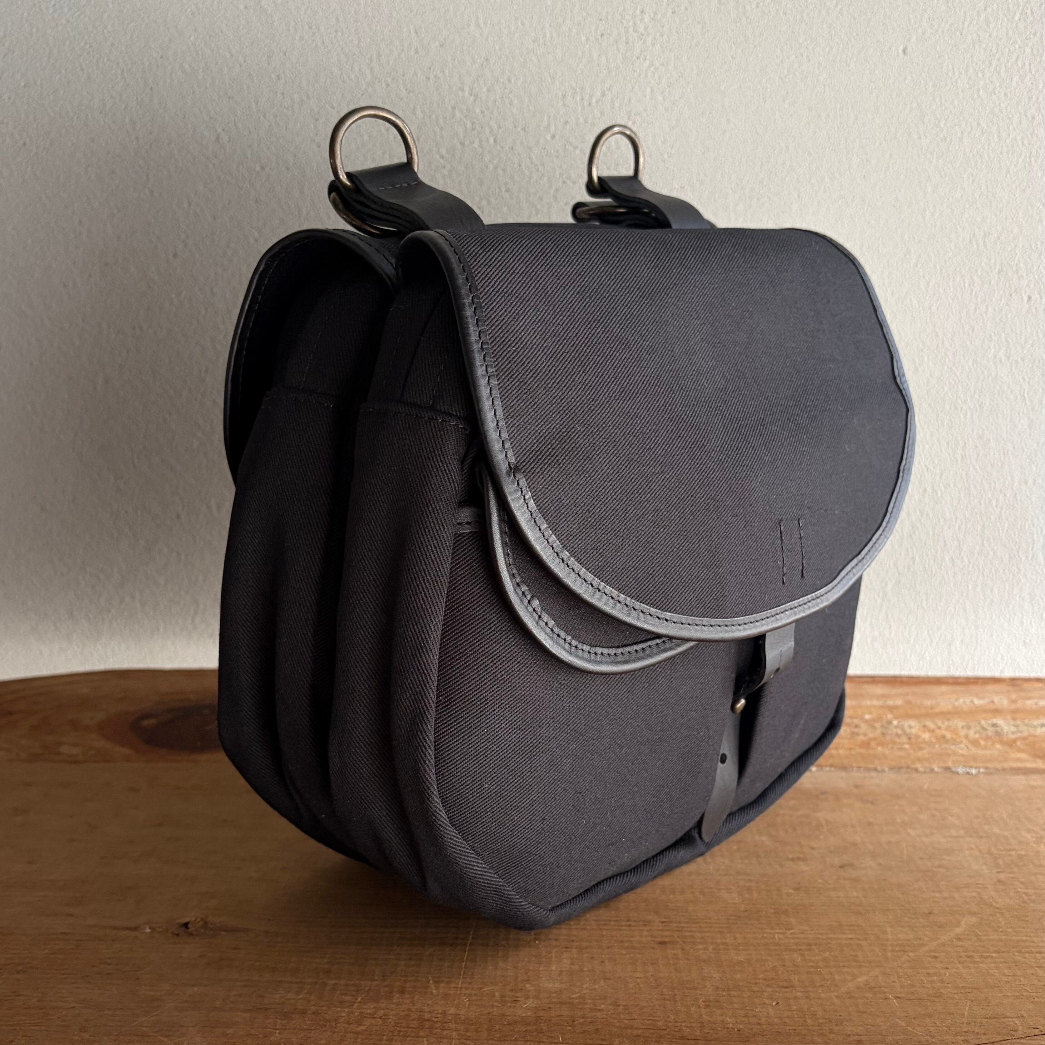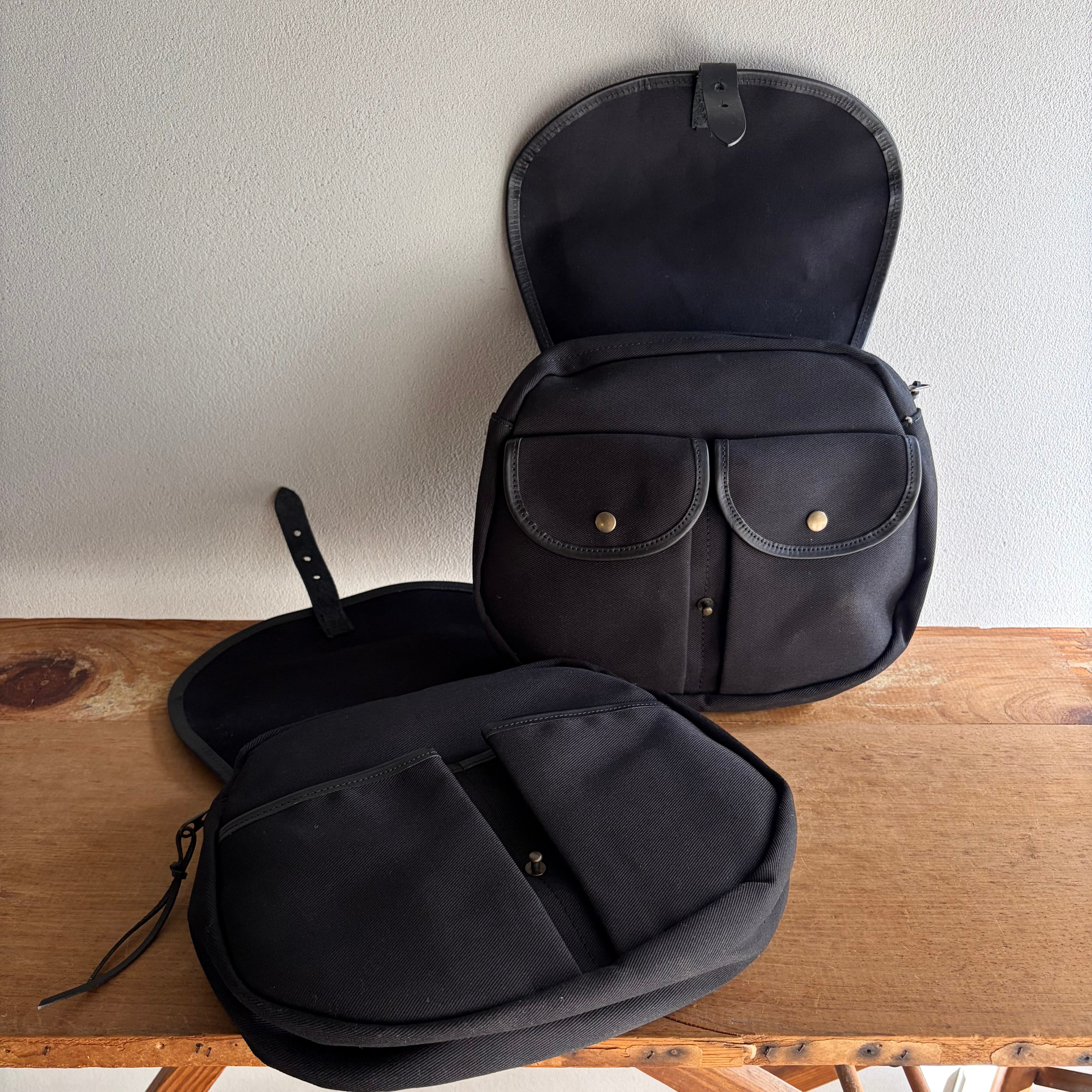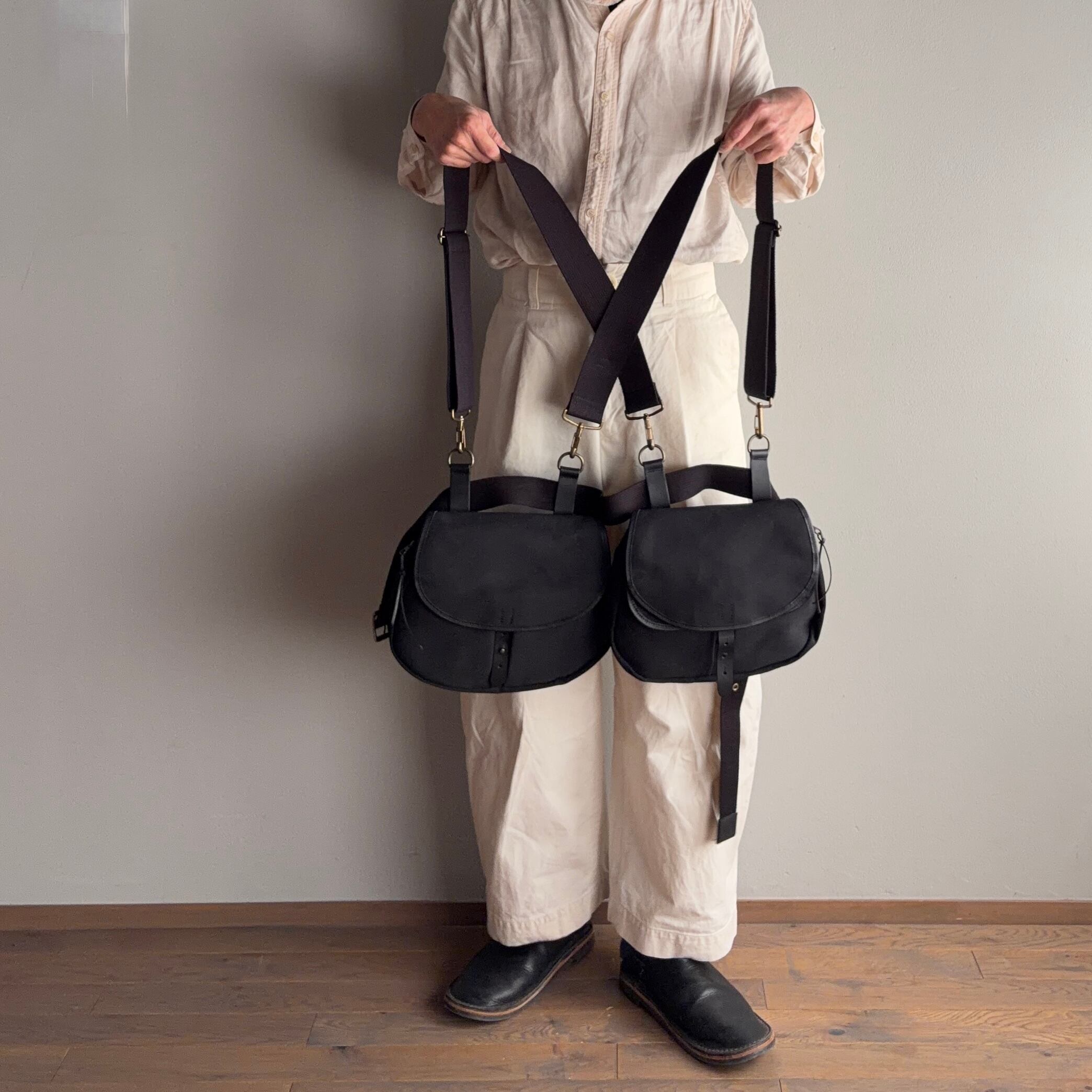 双子のような二つのバックは、ショルダー紐により写真のように両側にポケットのようにかけたり、ウエストポーチ、ショルダーバッグ、ハンドバッグとしても使えます。スナップボタンをとめると一つのコロンとしたショルダーになります。