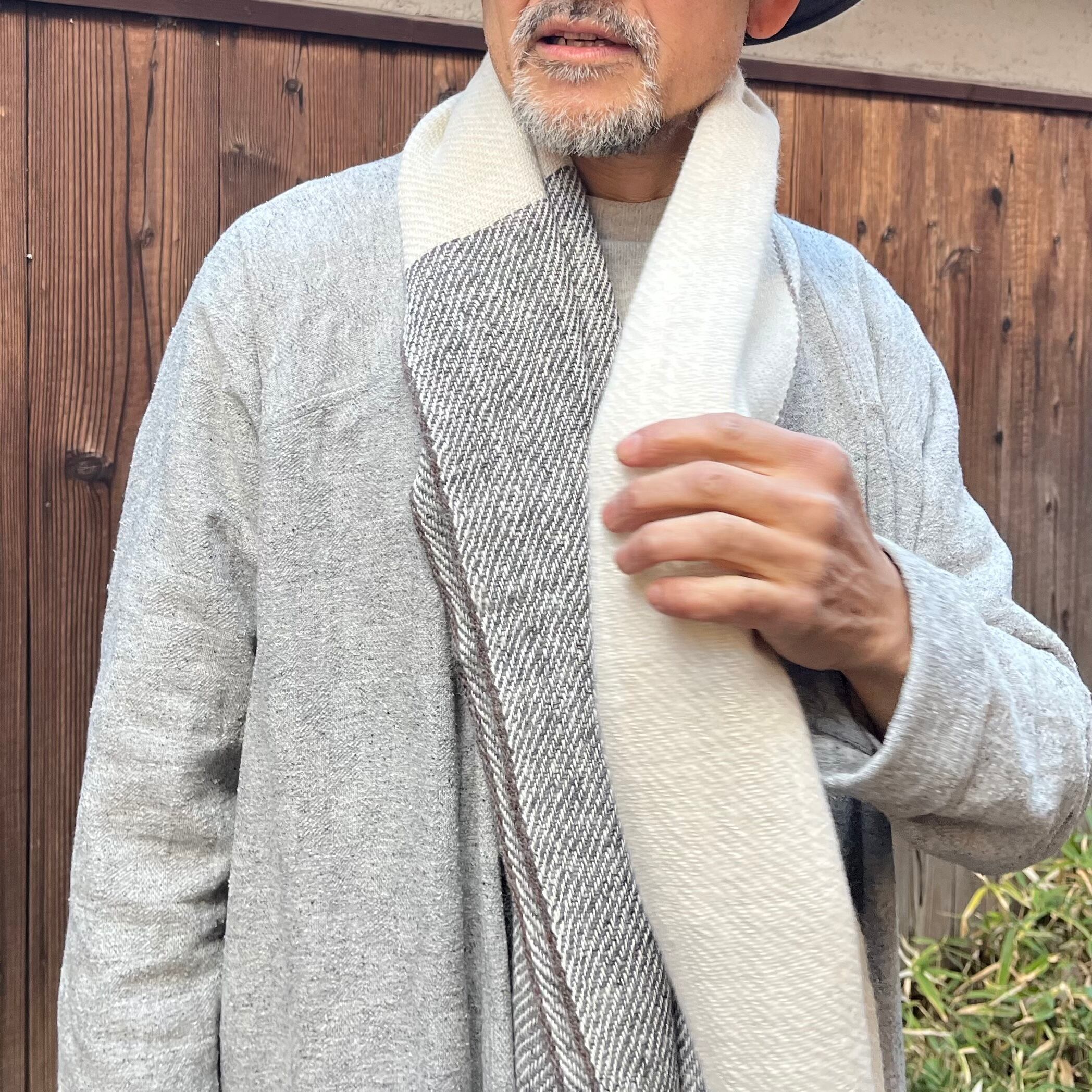 PUENTE/プエンテ 手紡ぎアルパカ手織りショール #RT-12 ホワイト/クリアグレー/ライン杢ブラウン