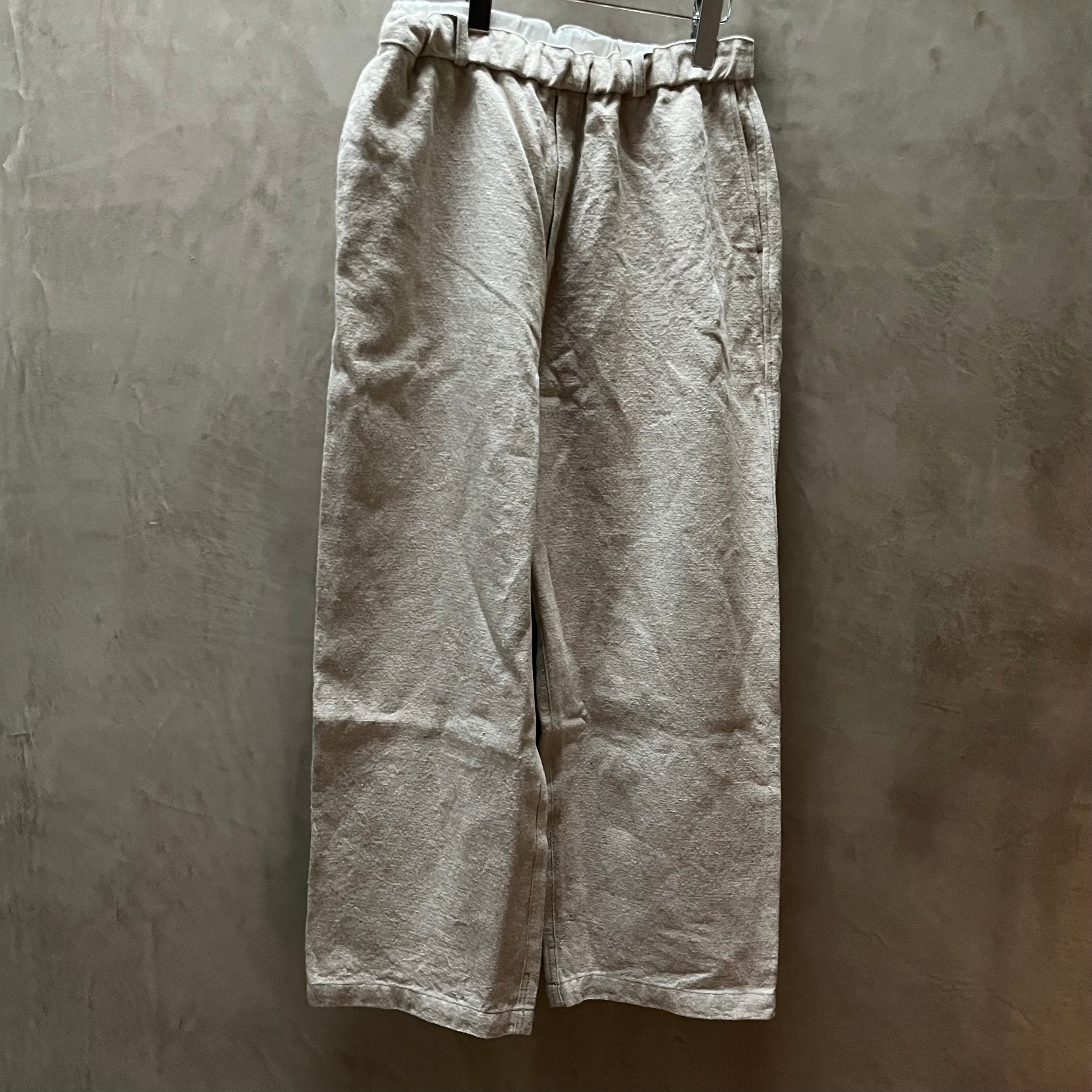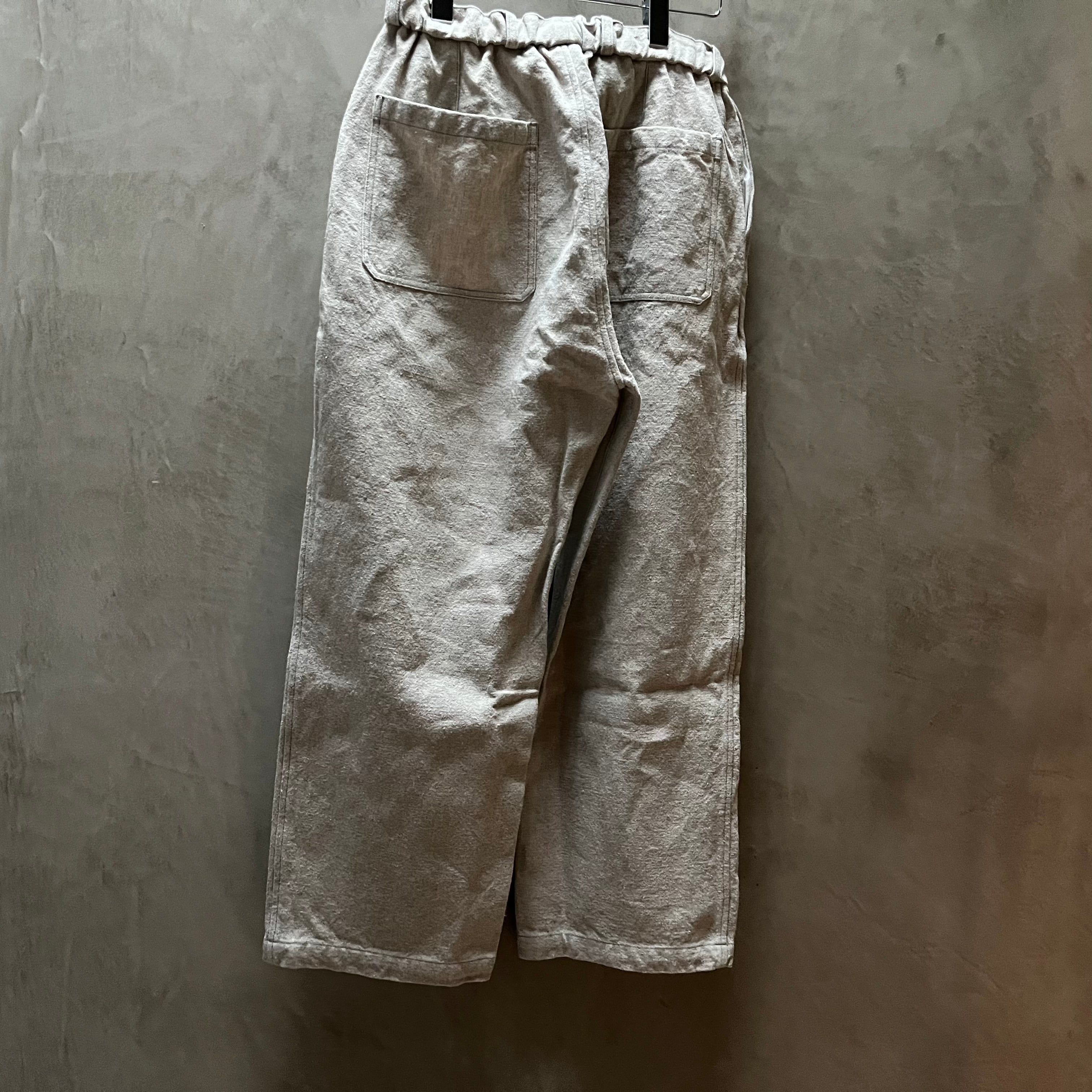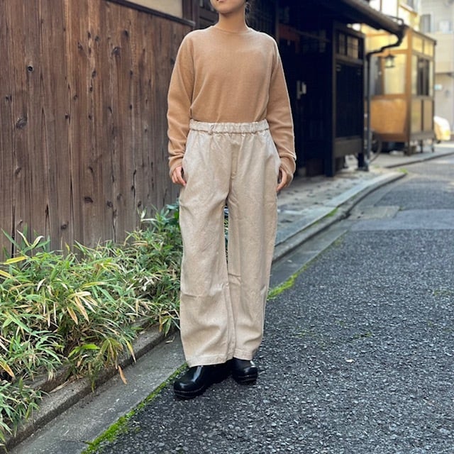 しっかりと重さがある生地なので自重に耐えられるようにベルトループが付いていますが、ウエストゴムと内側のオーガニックコットンの紐で、ベルトを用いなくても着用が可能です。パターンはPT-13をベースに、裾幅を太くしたストレートシルエットとし、後ろポケットも若干大きくしています。裾幅を太くした分全体のバランスを考えて、丈を5cmほど短くしています。