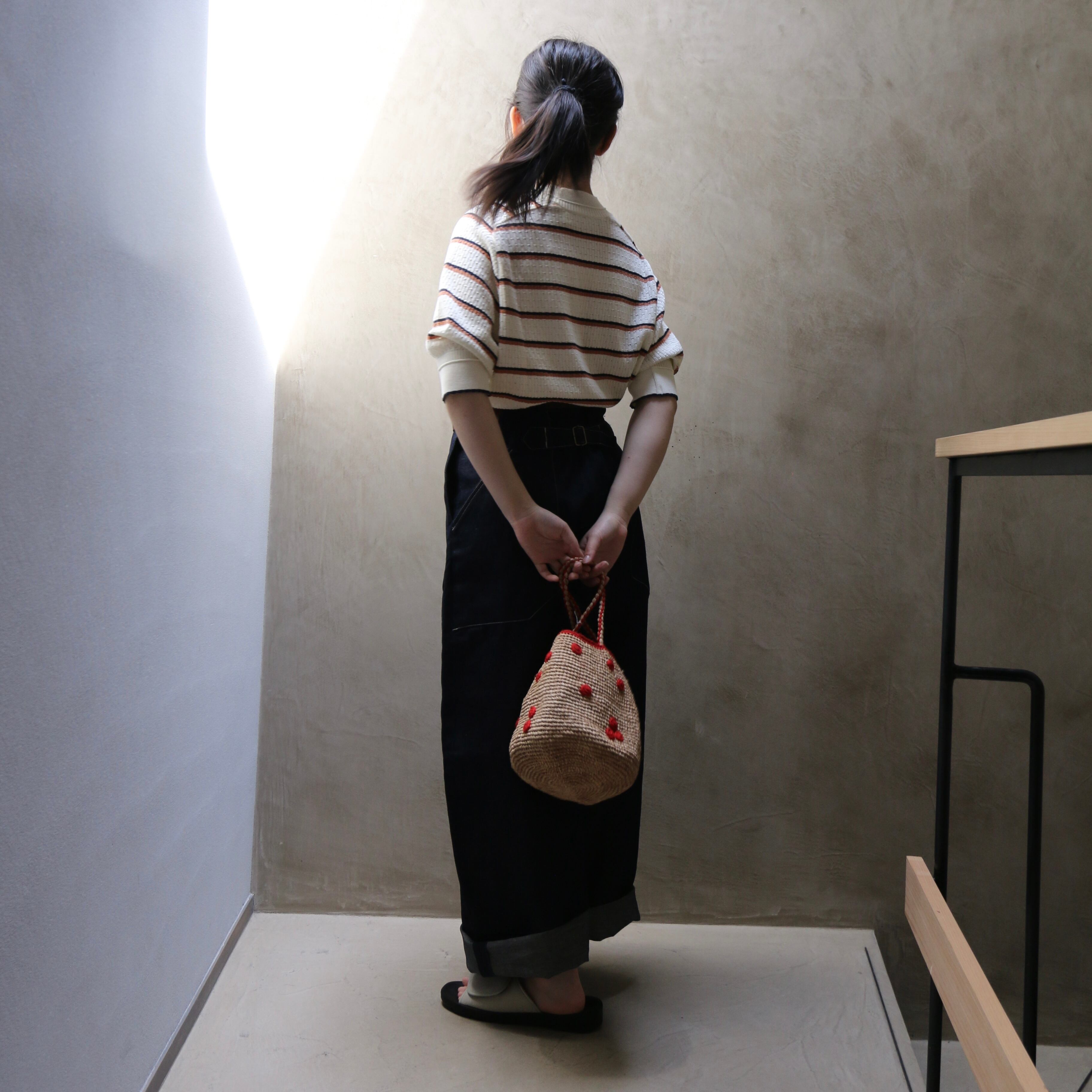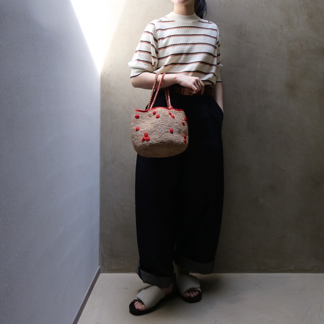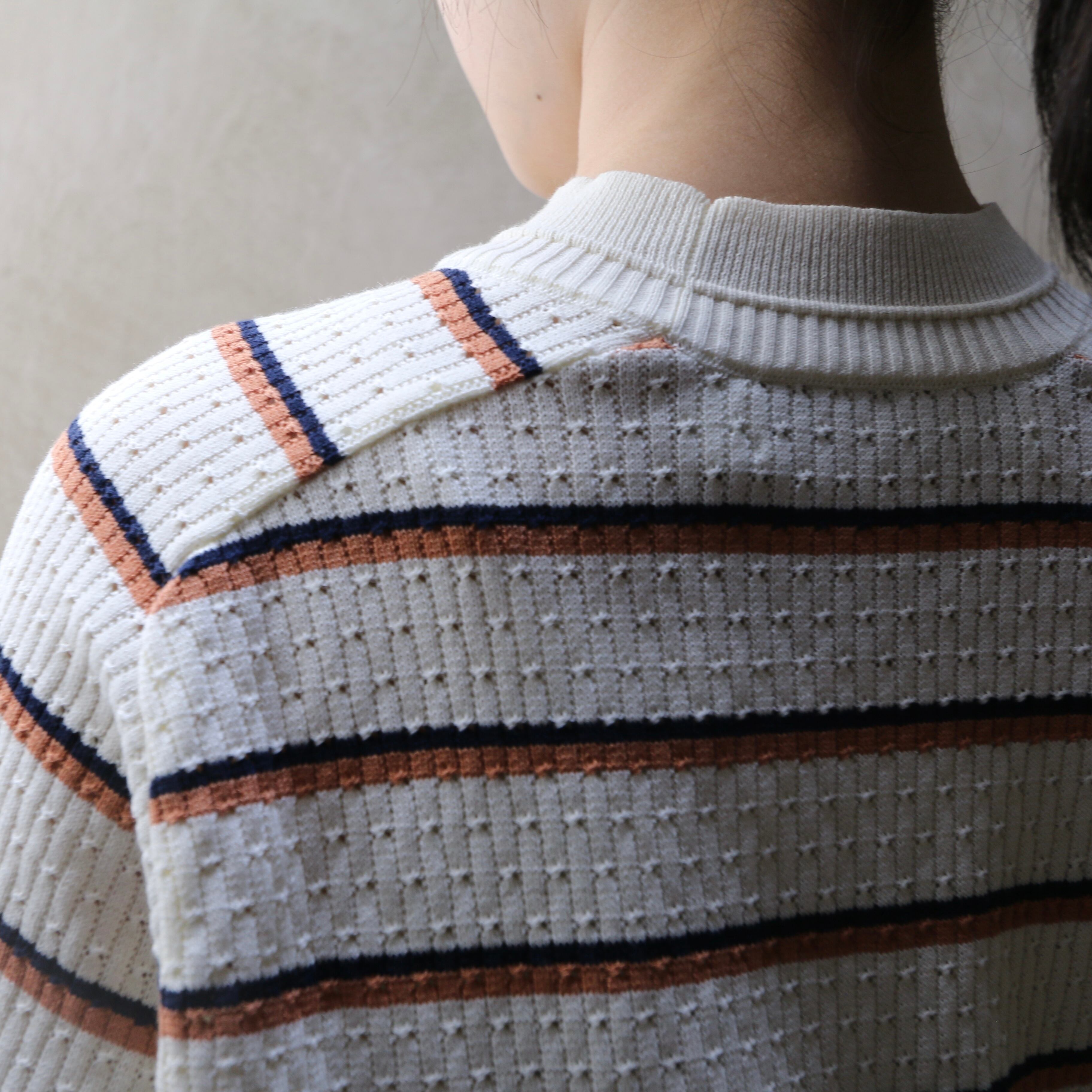 パフスリーブのゆったりとしたニット。ノスタルジックなオリジナルのマルチボーダーとレース柄を組み合わせた柄で作っています。強撚のドライなコットンの糸を使っているので春夏にもサラっと着られるニットです。
