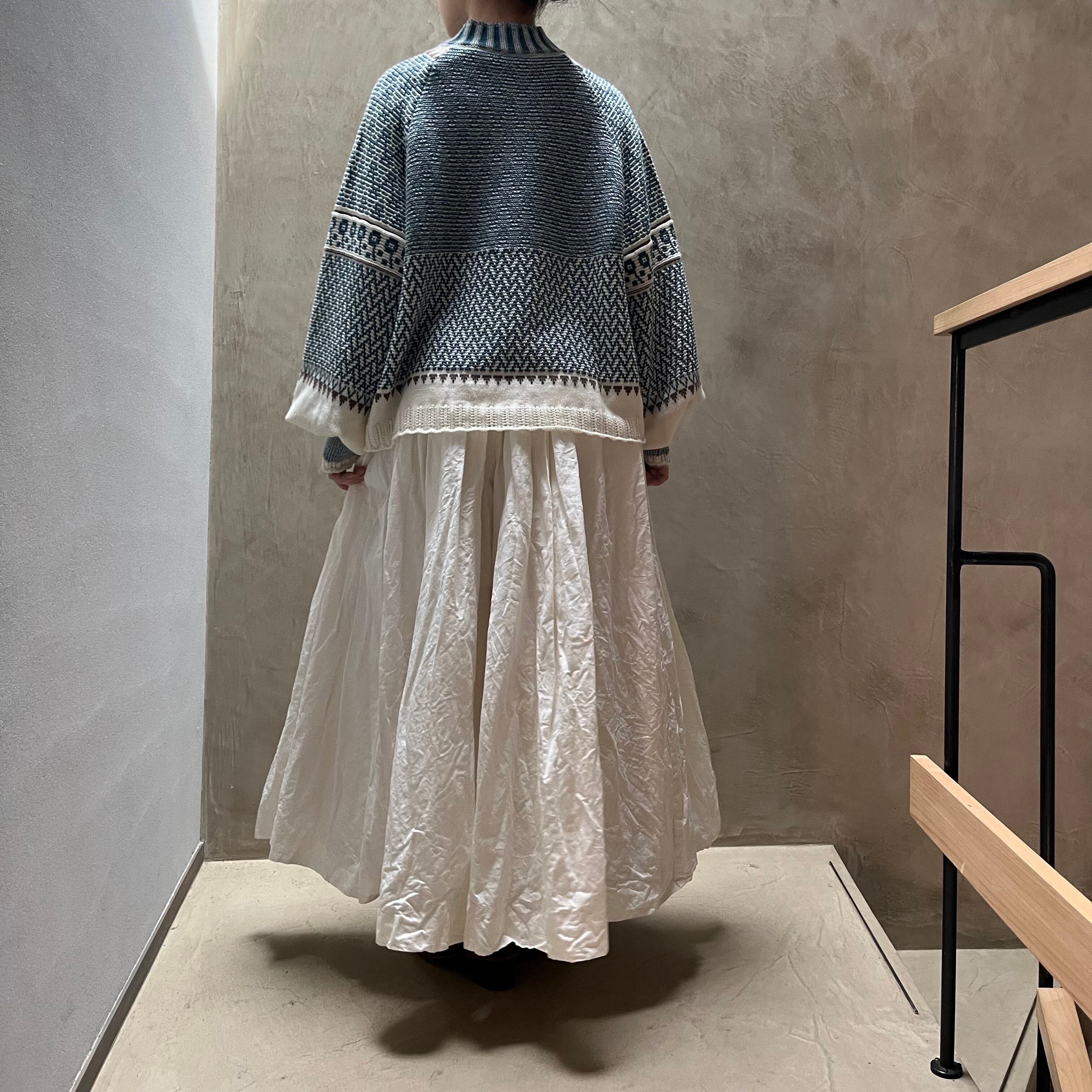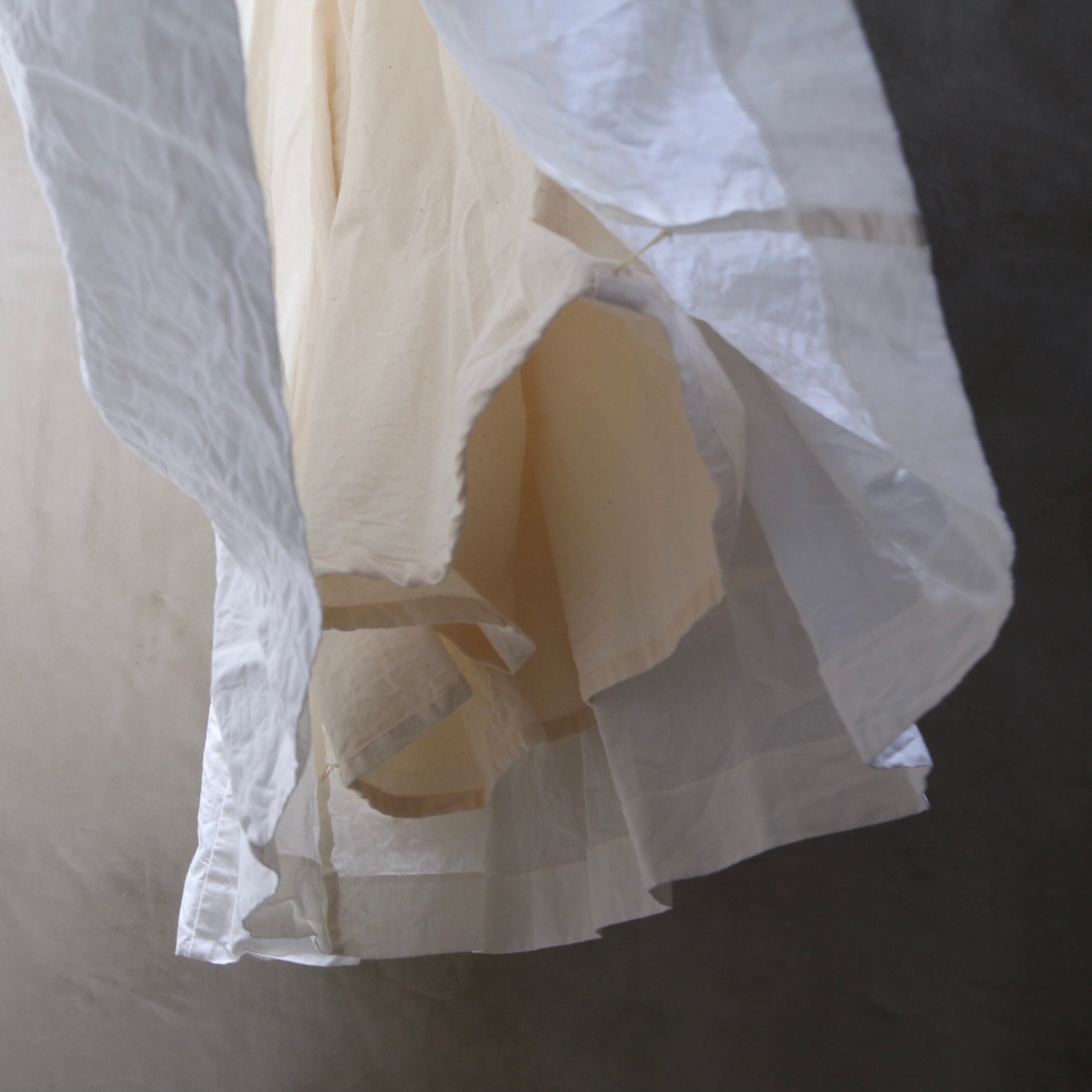やや光沢感のあるしっかりした白。裏地あり透け感はまったくありません。トップスのボリュームがあがっている今、すっきりしつつボリューム感のある丈長のフォルムはバランスがとりやすいです。