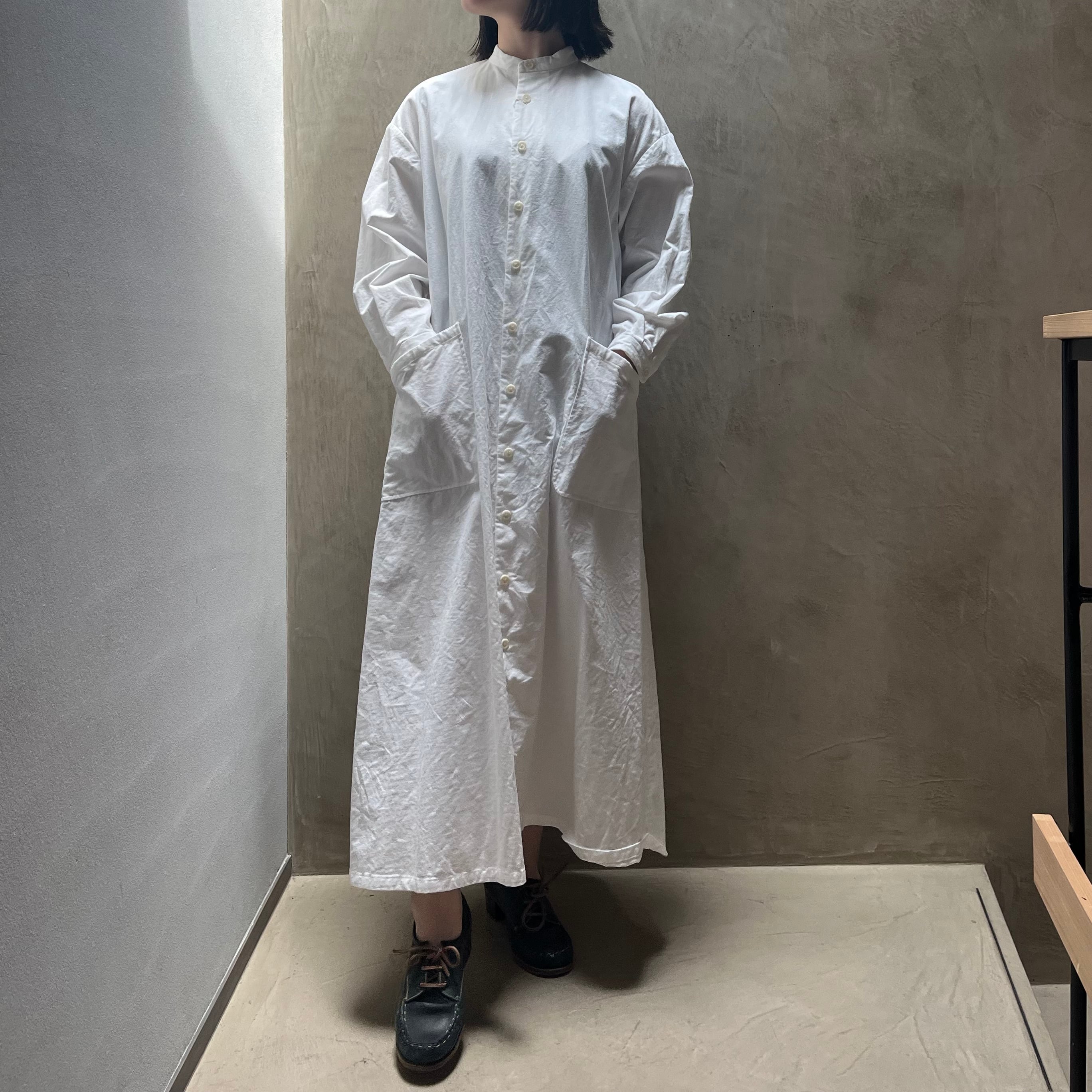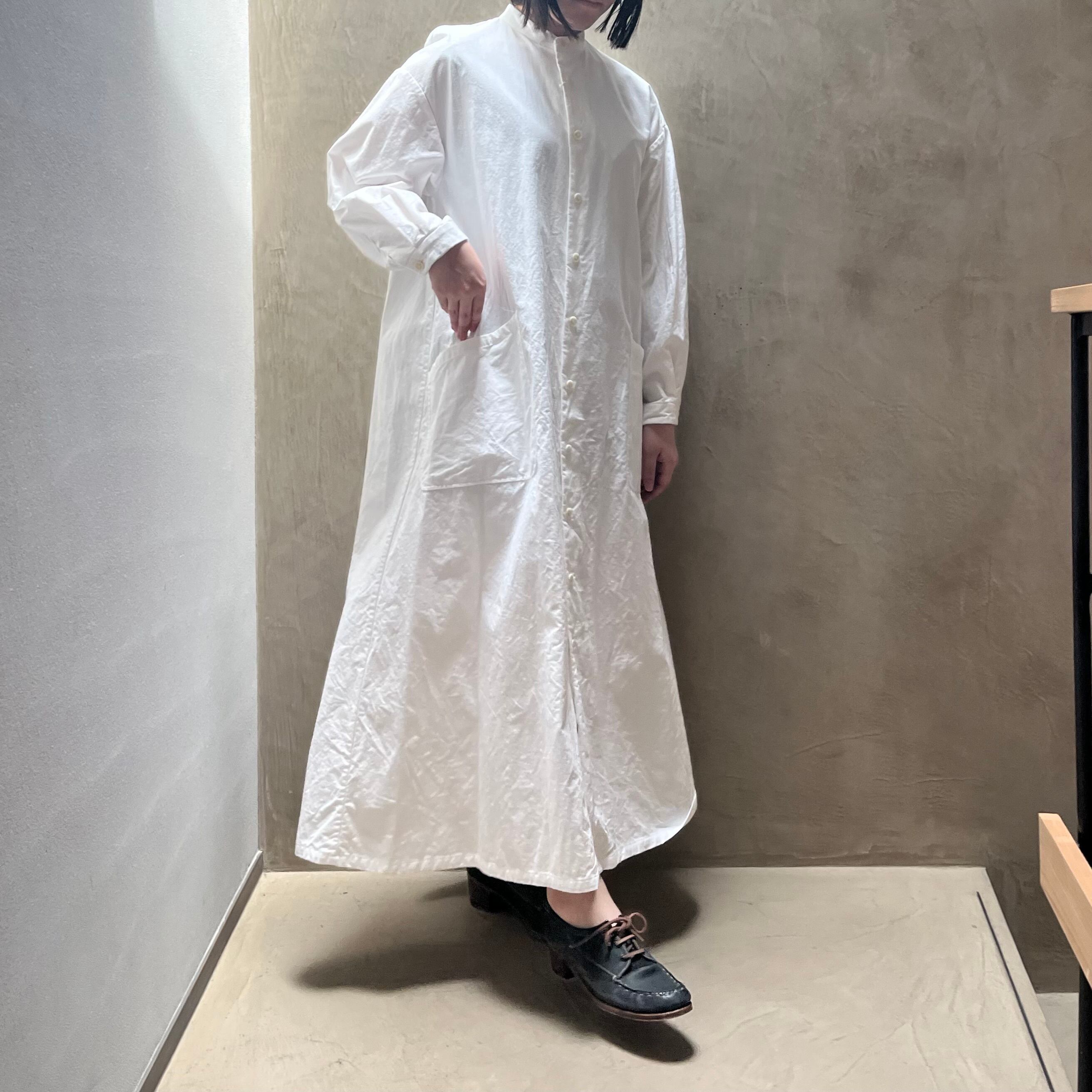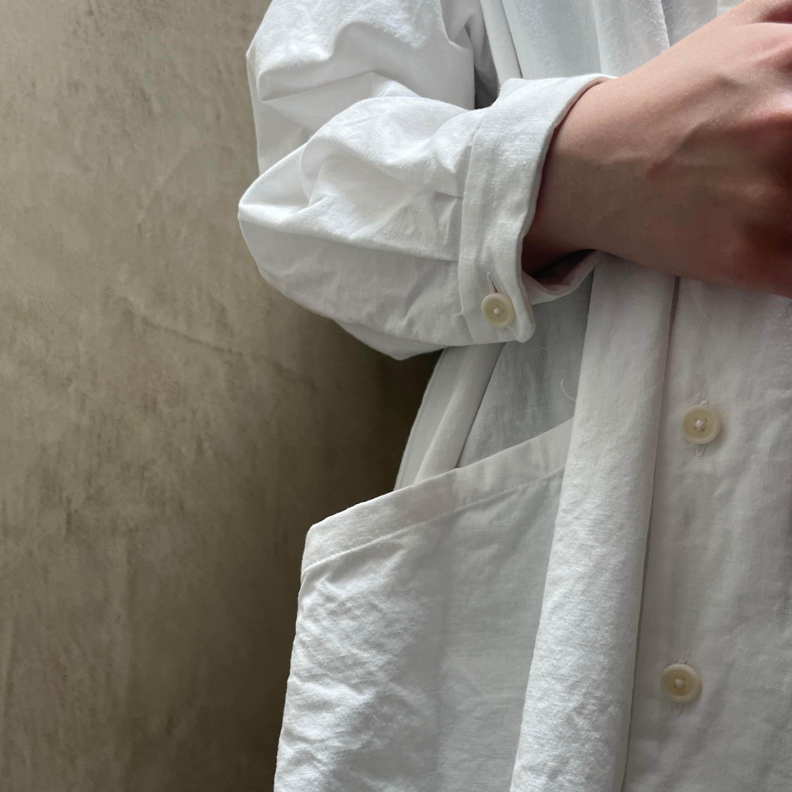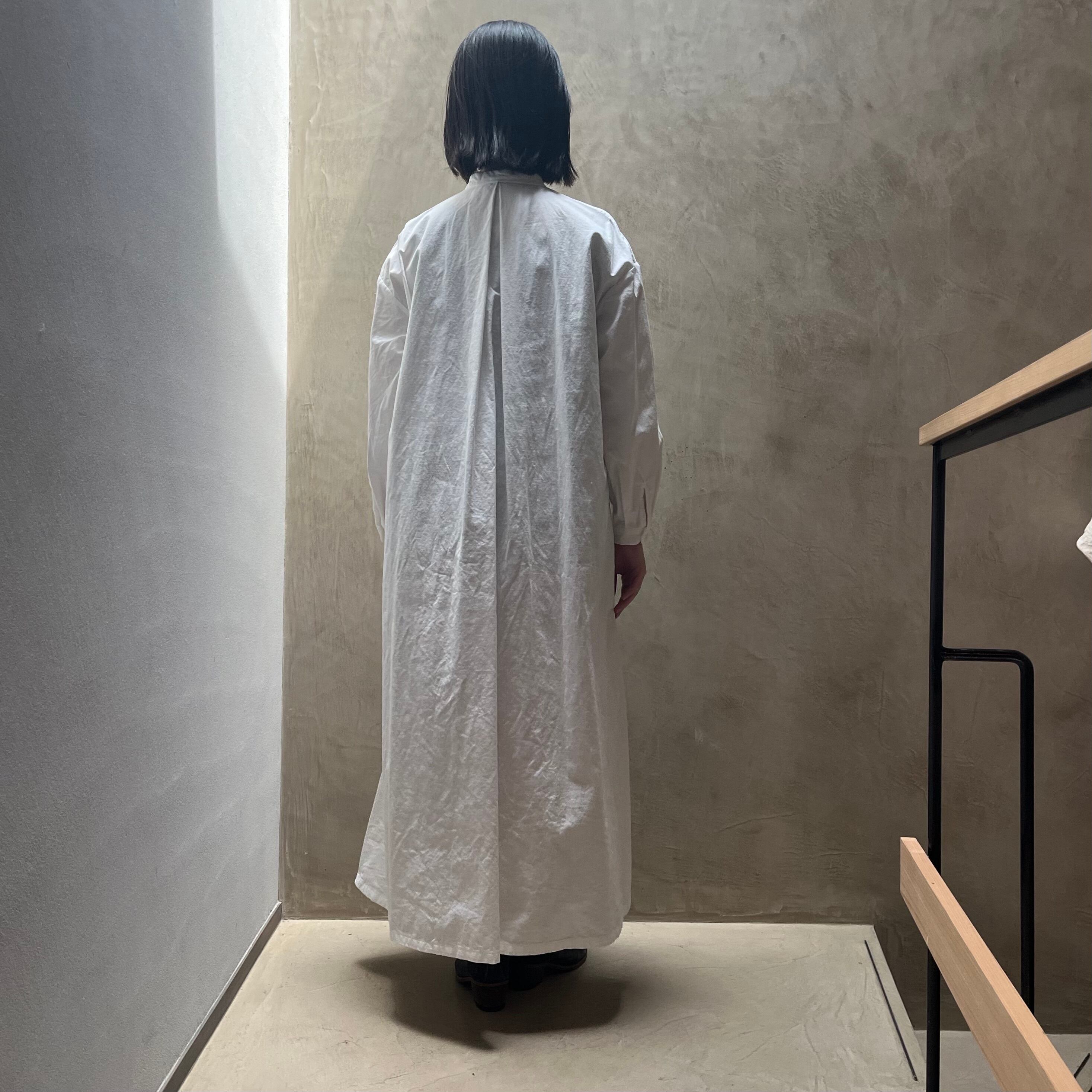 YAECA WRITEの定番ともいえる、ワークシャツコート。しっかりとしたコットン地のホワイト。Aラインの長めのシルエットは、前をあけてコートのように着ても、ボタンを閉じてワンピースのように着ても雰囲気のあるアイテムです。背中心衿下に深い一本タックがはいって裾にかけてスーっと伸びているような印象が、ワークコートにモダンな個性を感じされてくれるヤエカらしいアイテムとなっています。