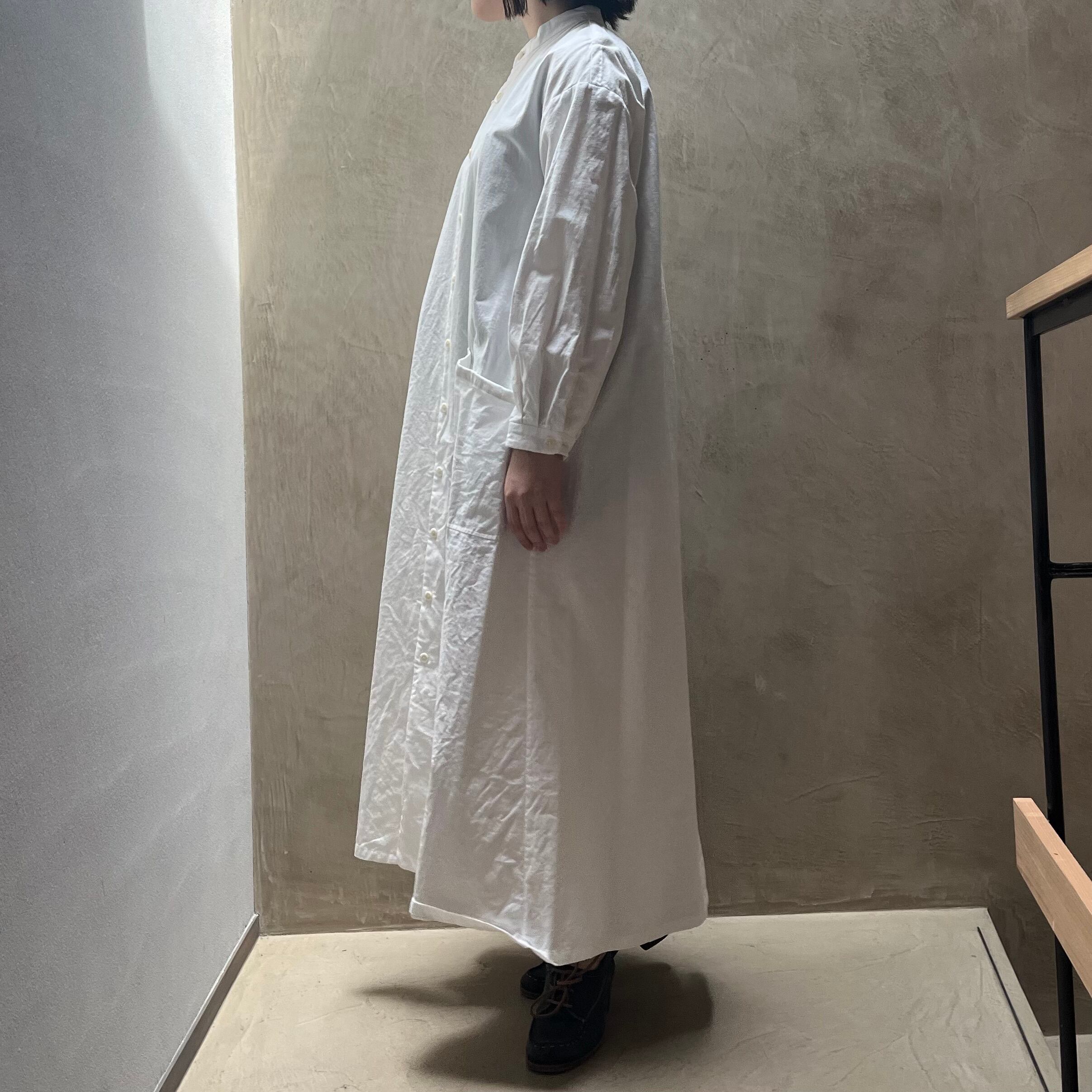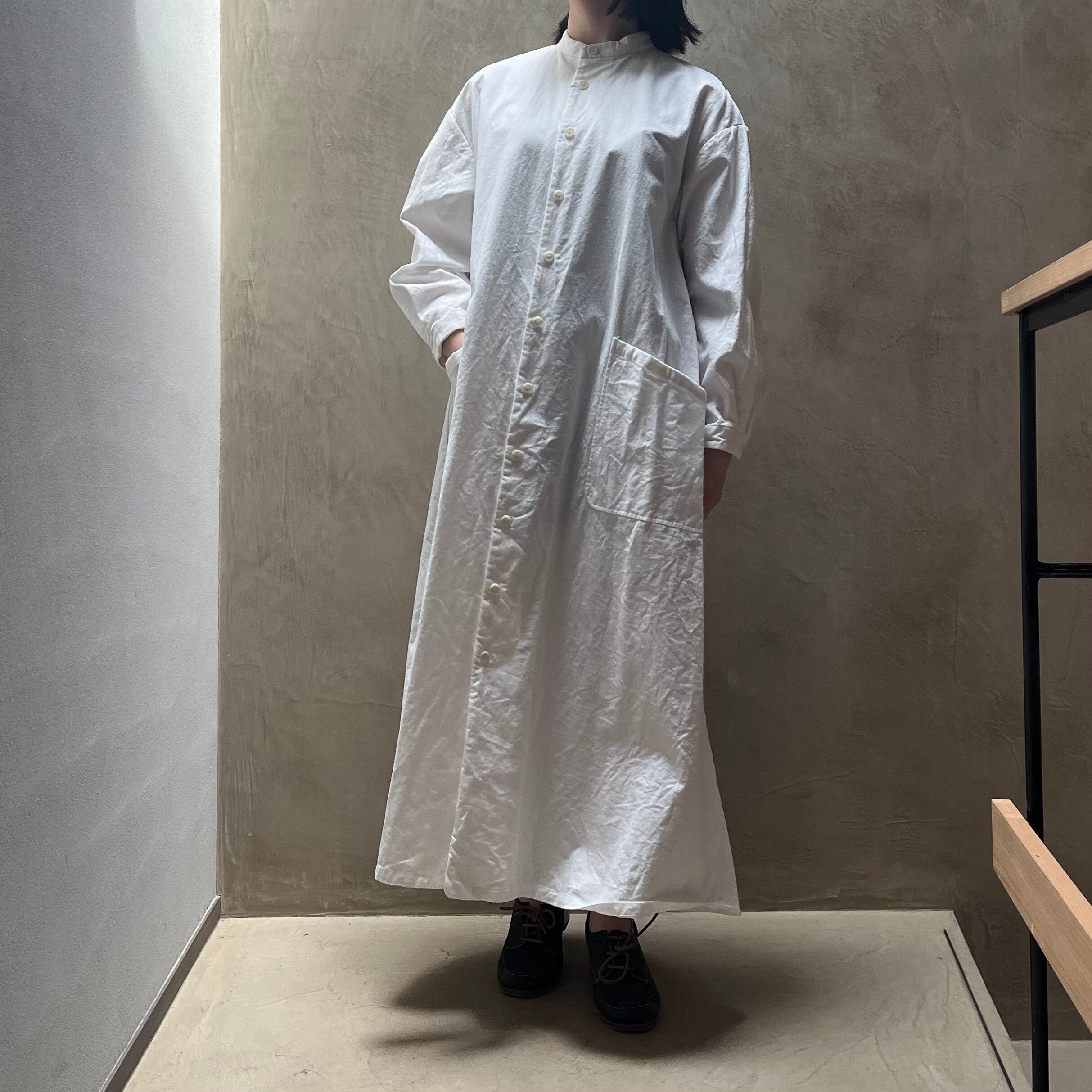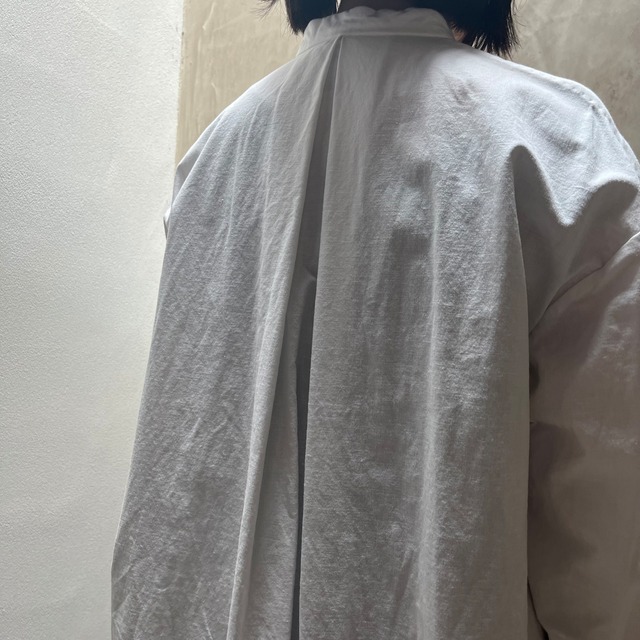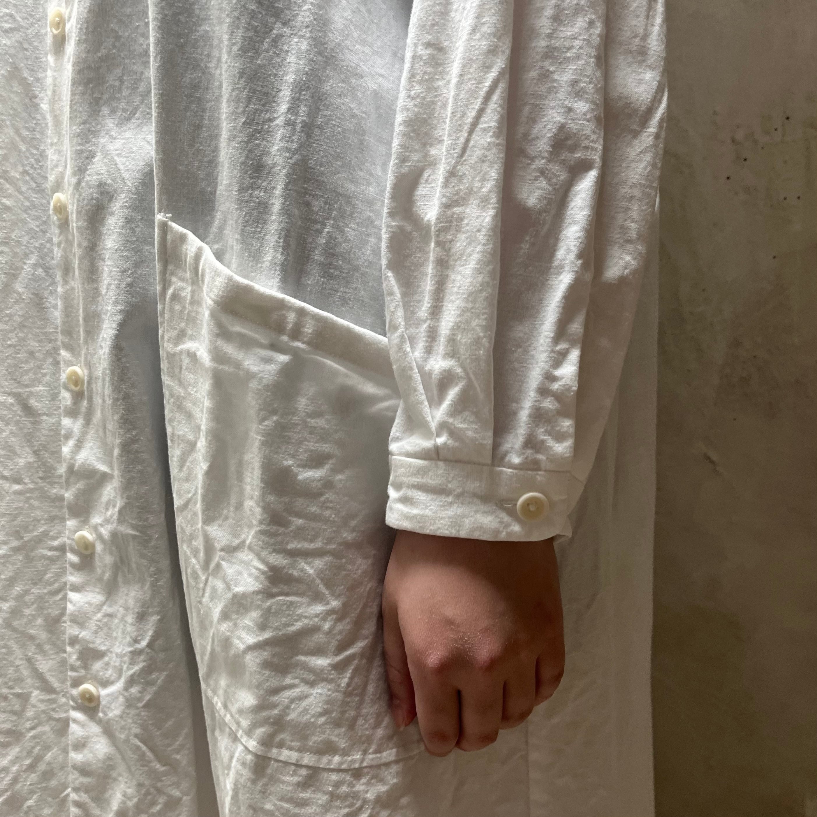 YAECA WRITEの定番ともいえる、ワークシャツコート。しっかりとしたコットン地のホワイト。Aラインの長めのシルエットは、前をあけてコートのように着ても、ボタンを閉じてワンピースのように着ても雰囲気のあるアイテムです。背中心衿下に深い一本タックがはいって裾にかけてスーっと伸びているような印象が、ワークコートにモダンな個性を感じされてくれるヤエカらしいアイテムとなっています。