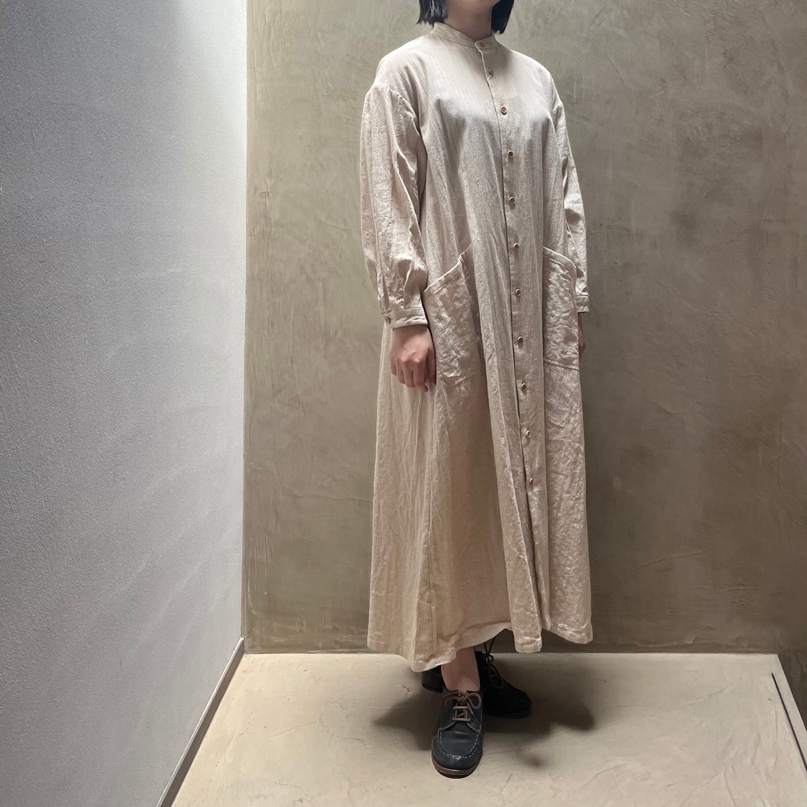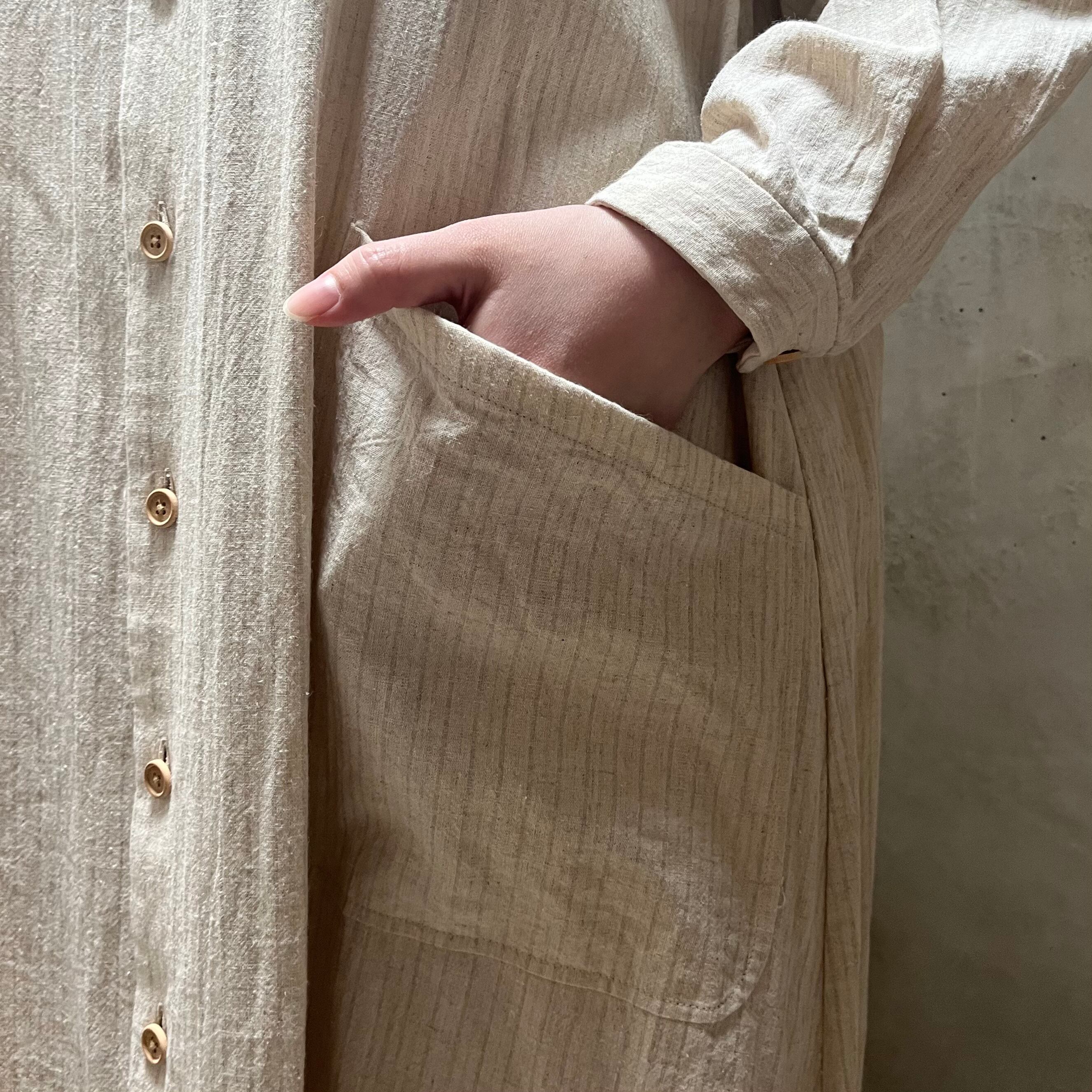 コットンのナチュラルカラーの色をストライプに生かした生地。温かみのあるベージュとかすれたようなグレーのストライプが上品で深い風合いがあります。前面のウッドボタンと大き目のポケットがアクセントになっており,Aラインの長めのシルエットは、前をあけてコートのように着ても、ボタンを閉じてワンピースのように着ても雰囲気のあるアイテムです。レディースのサイズSですが、ゆったりとしたシルエットですので、様々な体系の型に着ていただけます。詳しくは実寸をご参照ください。