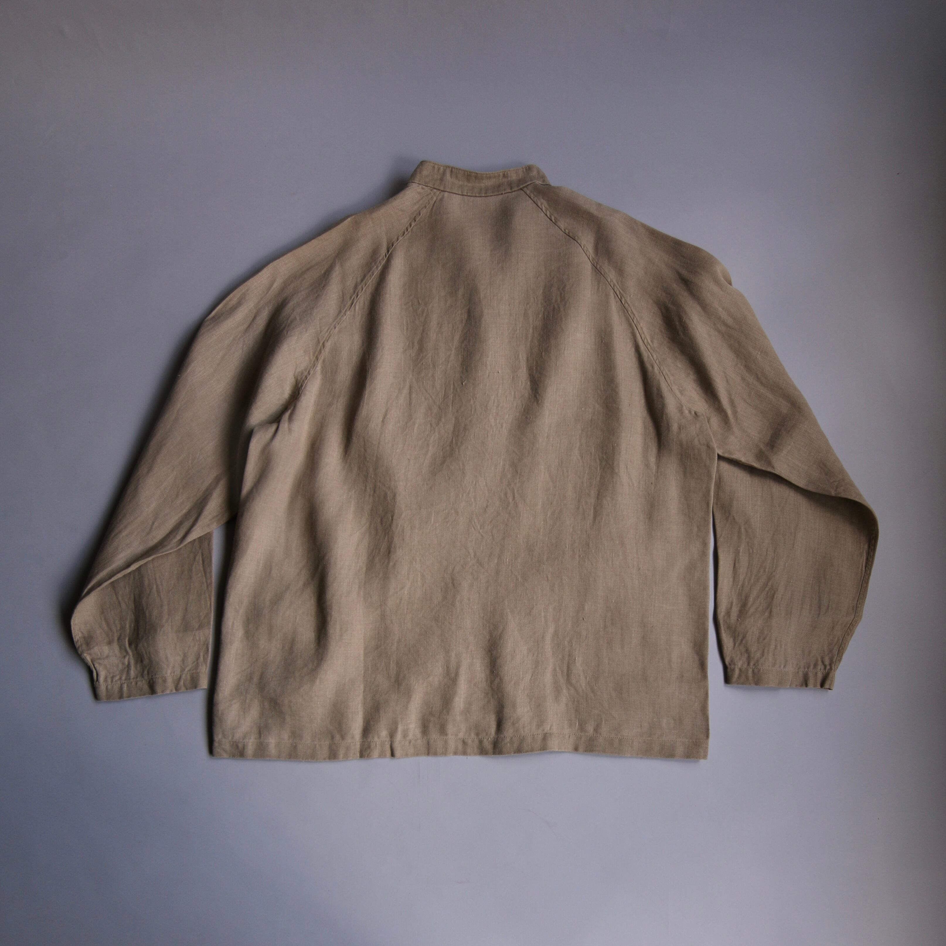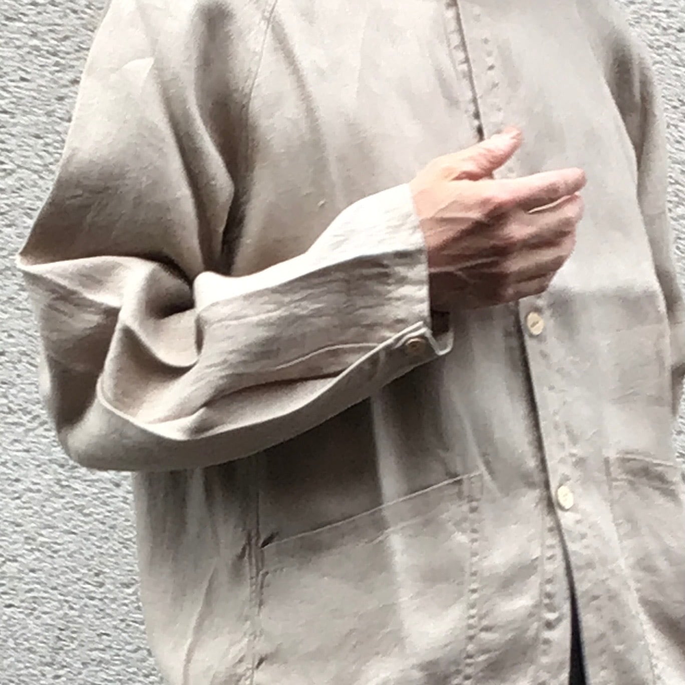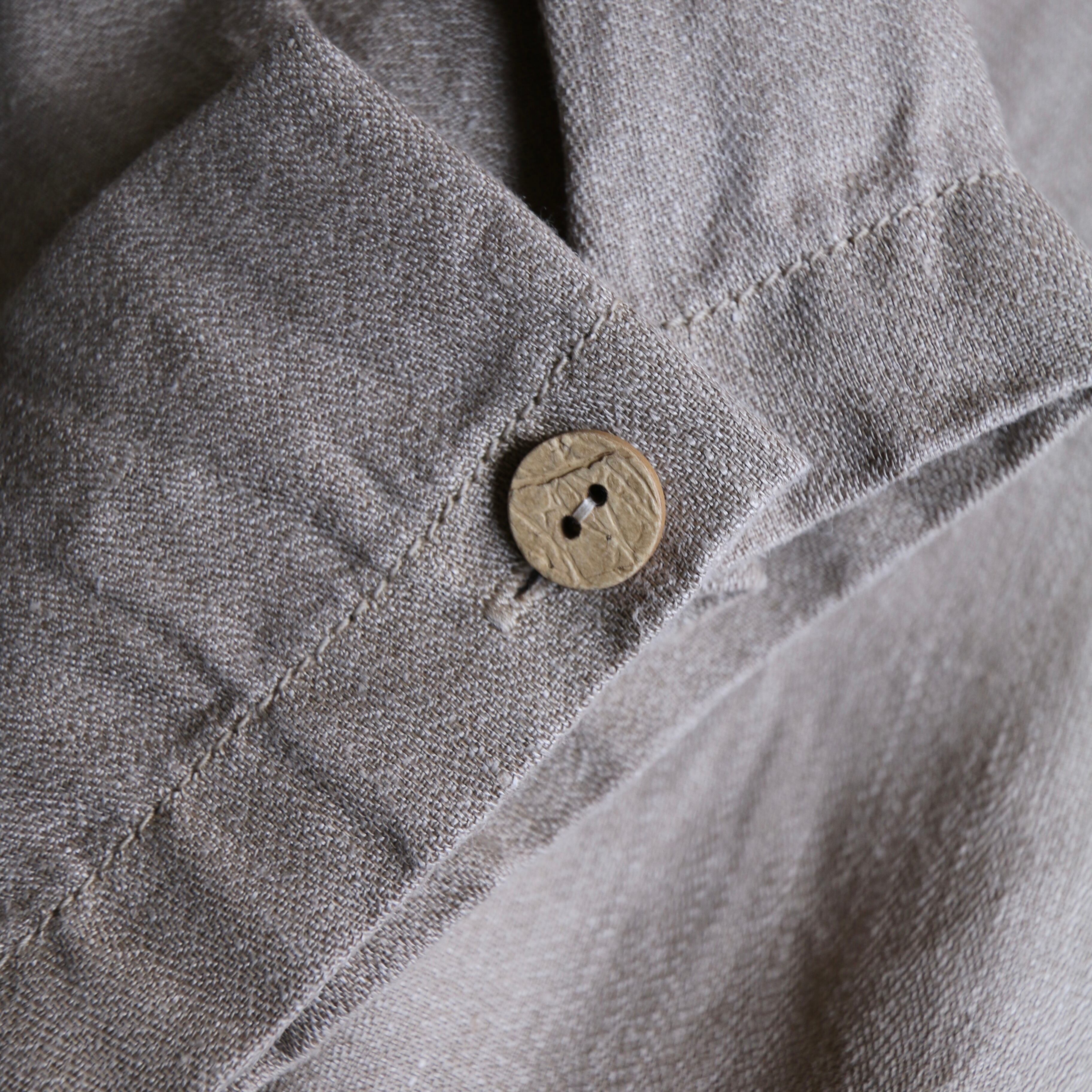 大麻の素材の機能性を活かし、身体との空間を意識したゆとりのあるデザインです。袖口はボタンによって好みに応じて太さを調整できるようになっています。ボタンには木製のものを使用しており、生地から縫製糸に至るまで、天然繊維のみで構成されています。(ボタン付け糸のみ強度の為、ナイロンコア糸(中心のみナイロンで外側は綿でカバーリングした糸)を使用しています。)