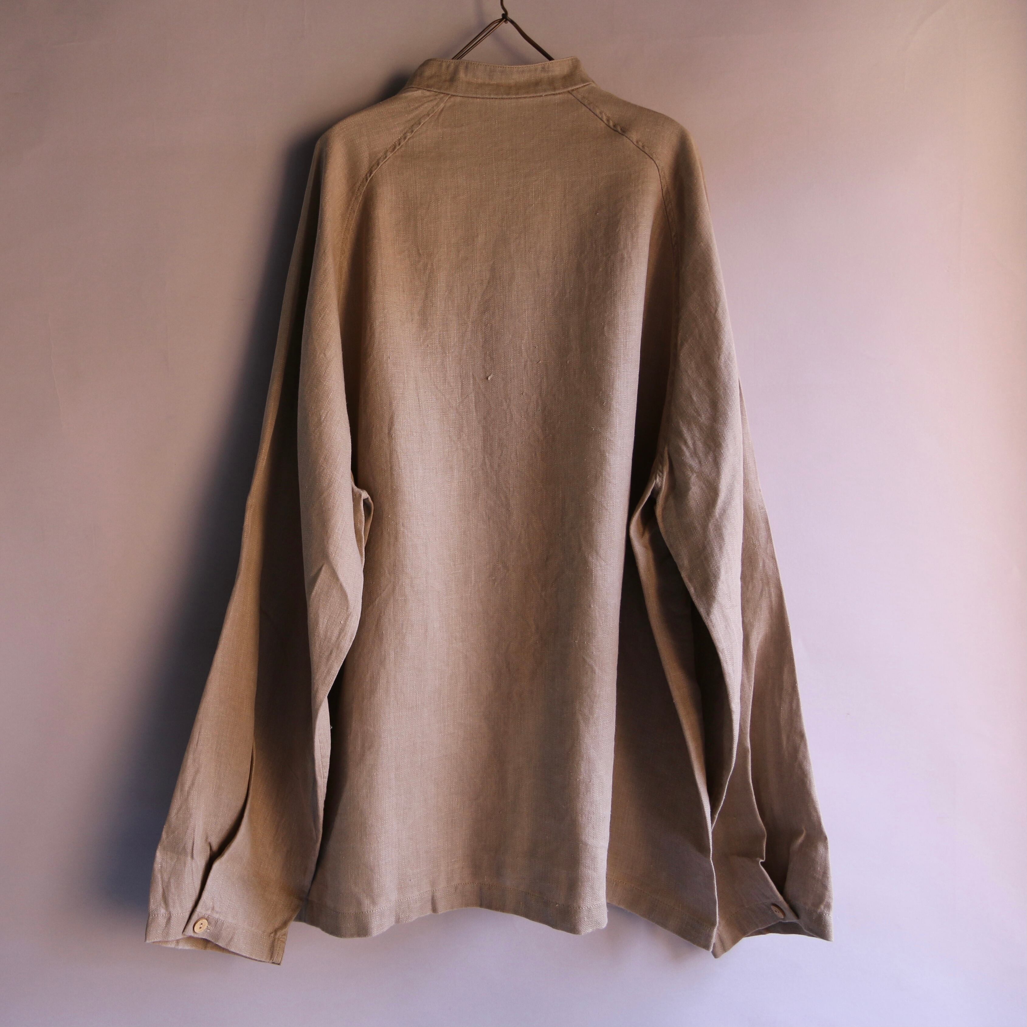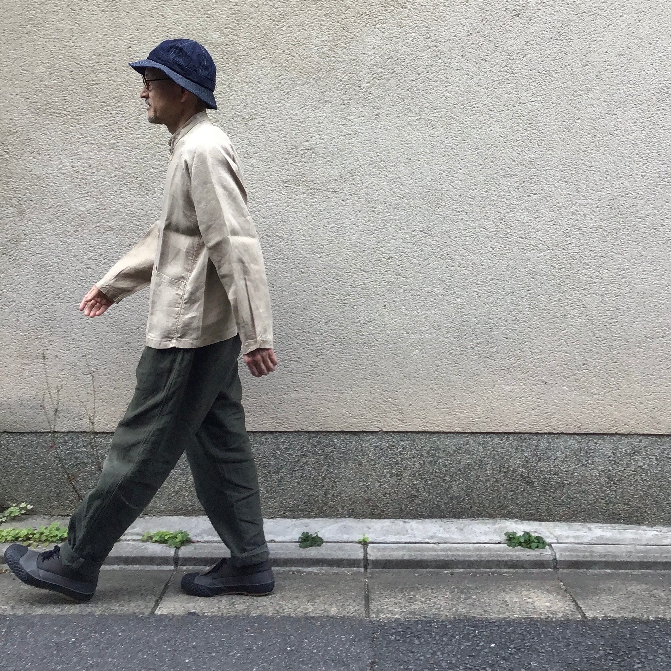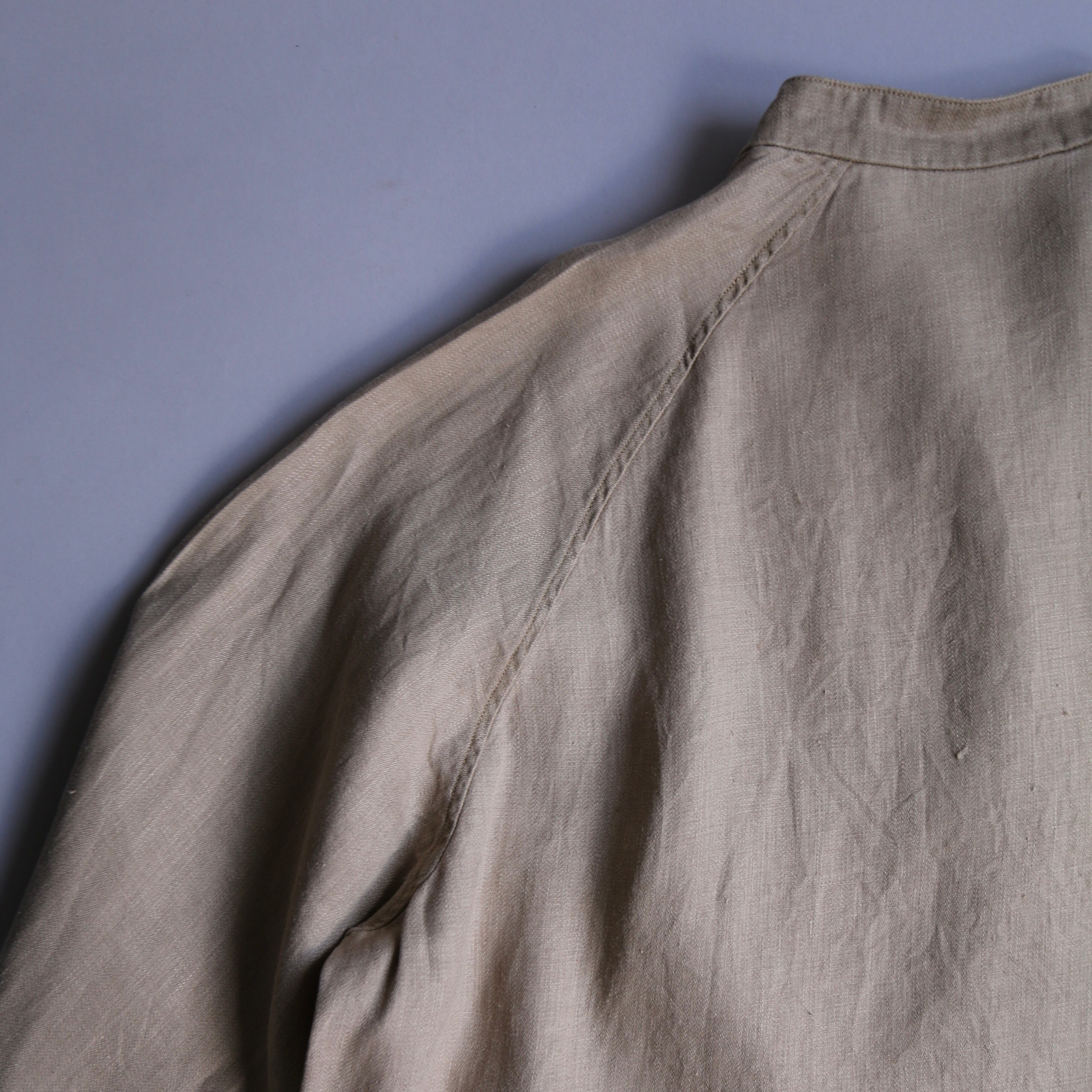 大麻の素材の機能性を活かし、身体との空間を意識したゆとりのあるデザインです。袖口はボタンによって好みに応じて太さを調整できるようになっています。ボタンには木製のものを使用しており、生地から縫製糸に至るまで、天然繊維のみで構成されています。(ボタン付け糸のみ強度の為、ナイロンコア糸(中心のみナイロンで外側は綿でカバーリングした糸)を使用しています。)