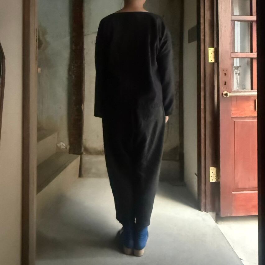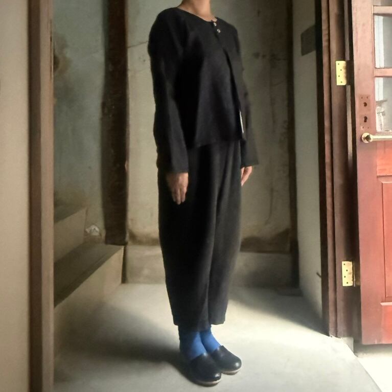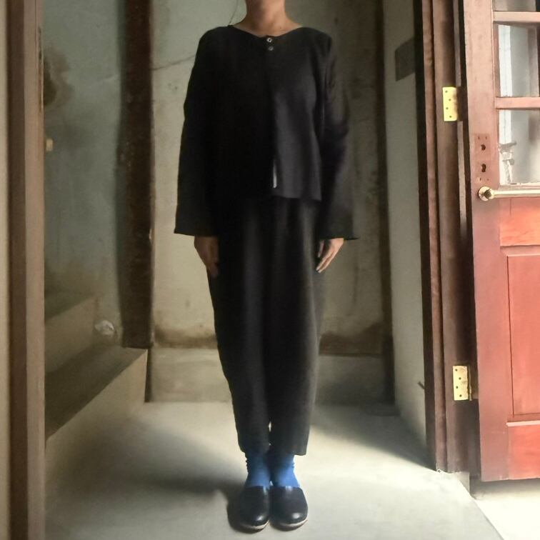 丈は短め。前見頃センターの生地の合わせラインには生地の耳をもってくることで、キリッとシャープなアクセントを差し込んでいます。