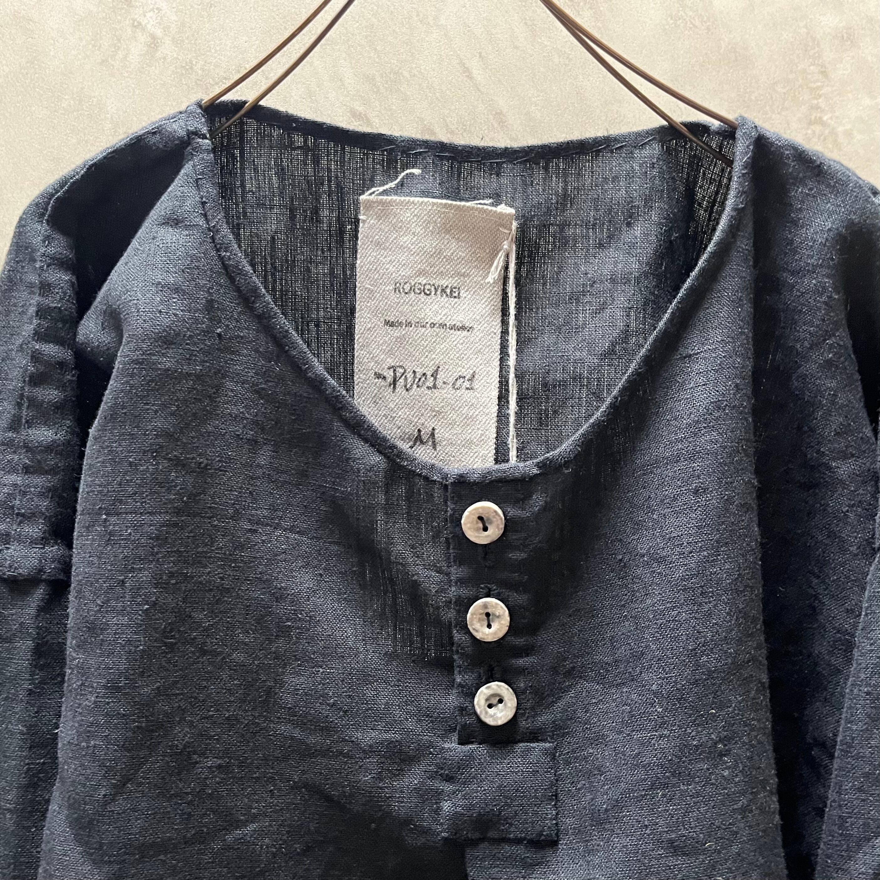平面的なパターンでありながら、首周りからヘンリーネックの3つボタンの表情まで、何気ない中にも可愛さと、豊かさが感じられます。ボタンは、手作りの陶器製。