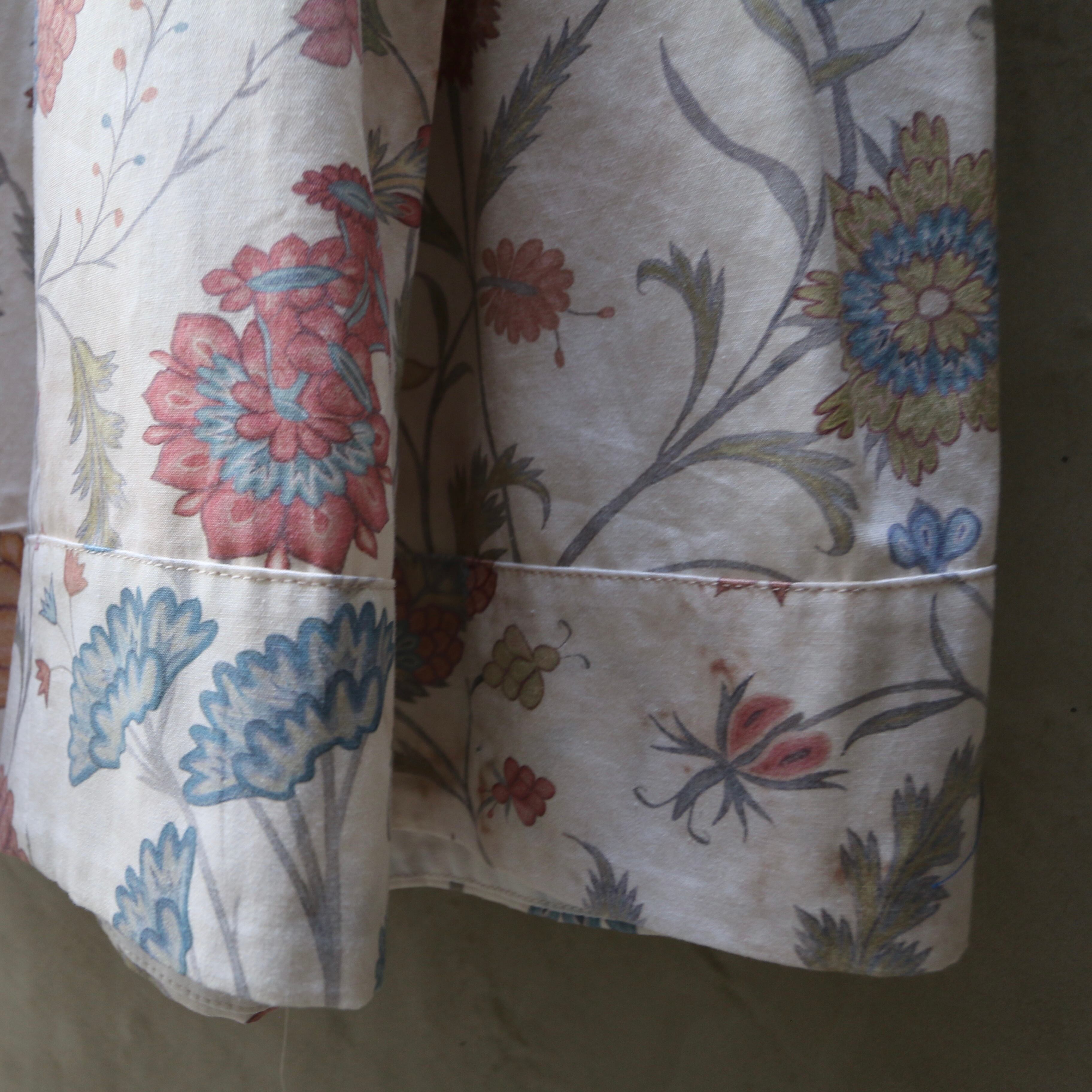 草花の下地のベージュの生地にはところどころ薄く掠れたような茶色い柄が見え隠れしていますが、一見すると汚れのようにも見える柄は、実は蝶々の姿がそれとは識別できないほどの曖昧さでプリントされています。