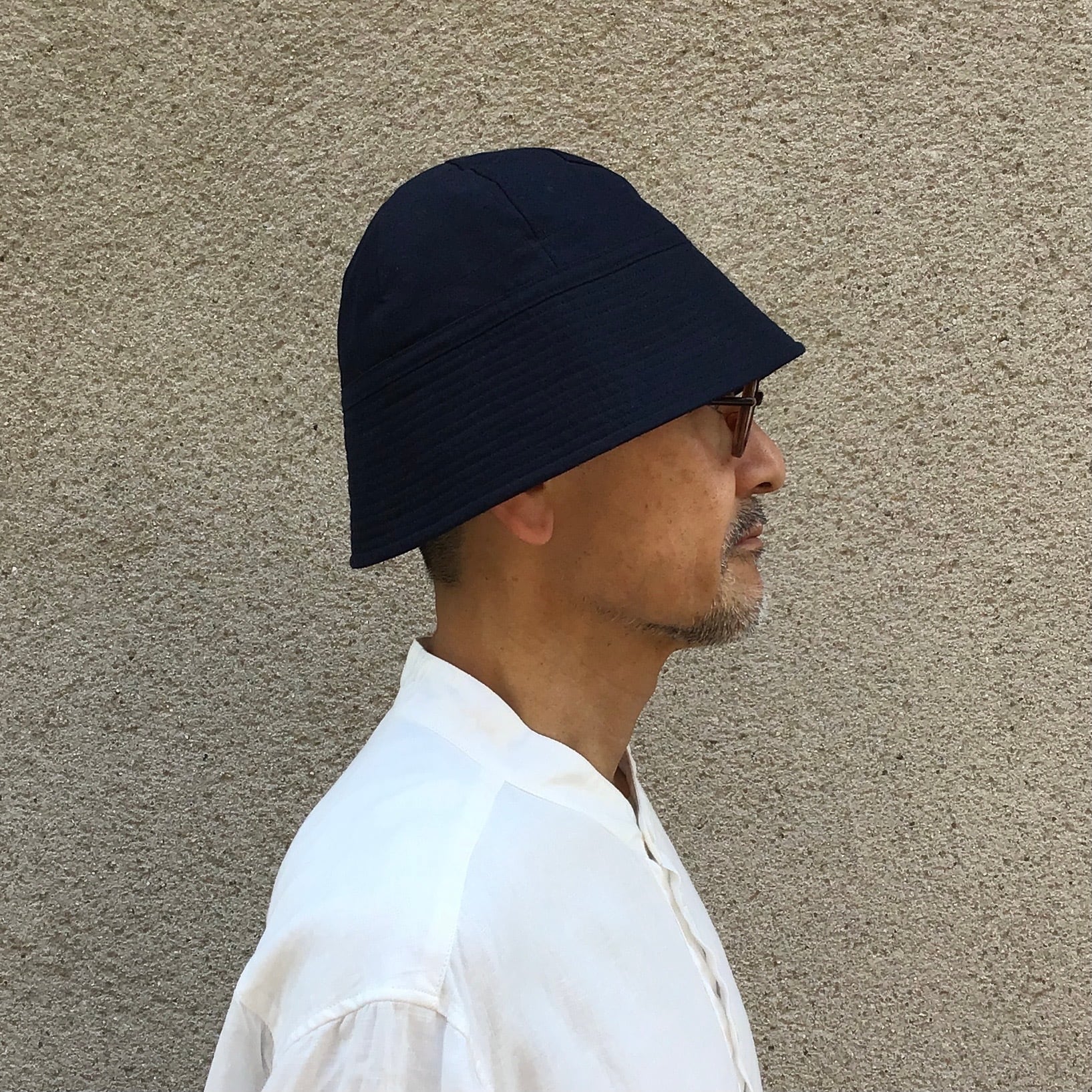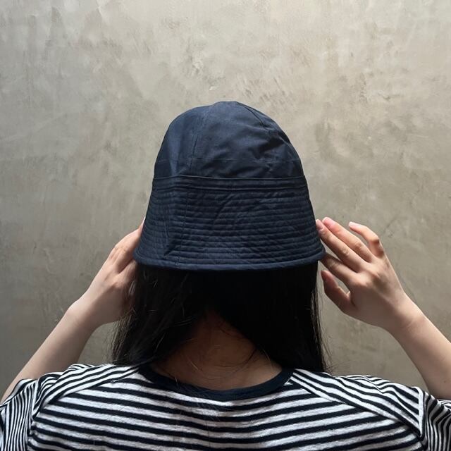 やや軽めの生地感で、浅めのクラウンに、ストンと下がったツバが可愛いシルエット。畳むとコンパクトになり、夏の帽子としておススメです。