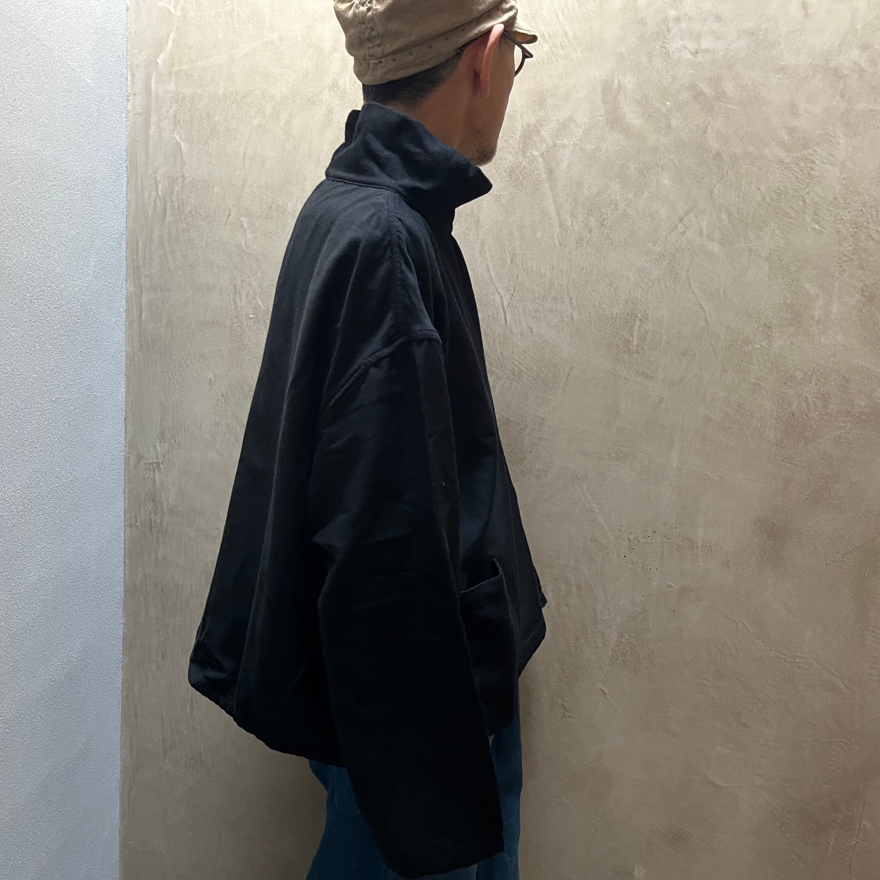 身幅にゆとりをもたせたプルオーバーシャツです。インナーを調整することで、多くの季節に対応できます。襟元は立てても折り返しても着用可能で、リバーシブル仕様なので裏返すと色が変わります。表面の前身頃の左右にはポケットがついています。