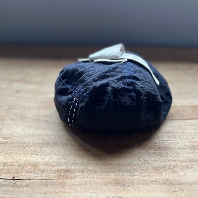 裏返してかぶるとテーピング生地と手縫いのステッチがまた表情豊かで、かぶった時の存在感はとても強いものがあり、全身のコーディネートのフィクサー的な働きをしてくれる帽子です。手洗い可能で、商品タグを着るとリバーシブルで裏面のステッチをアクセントに