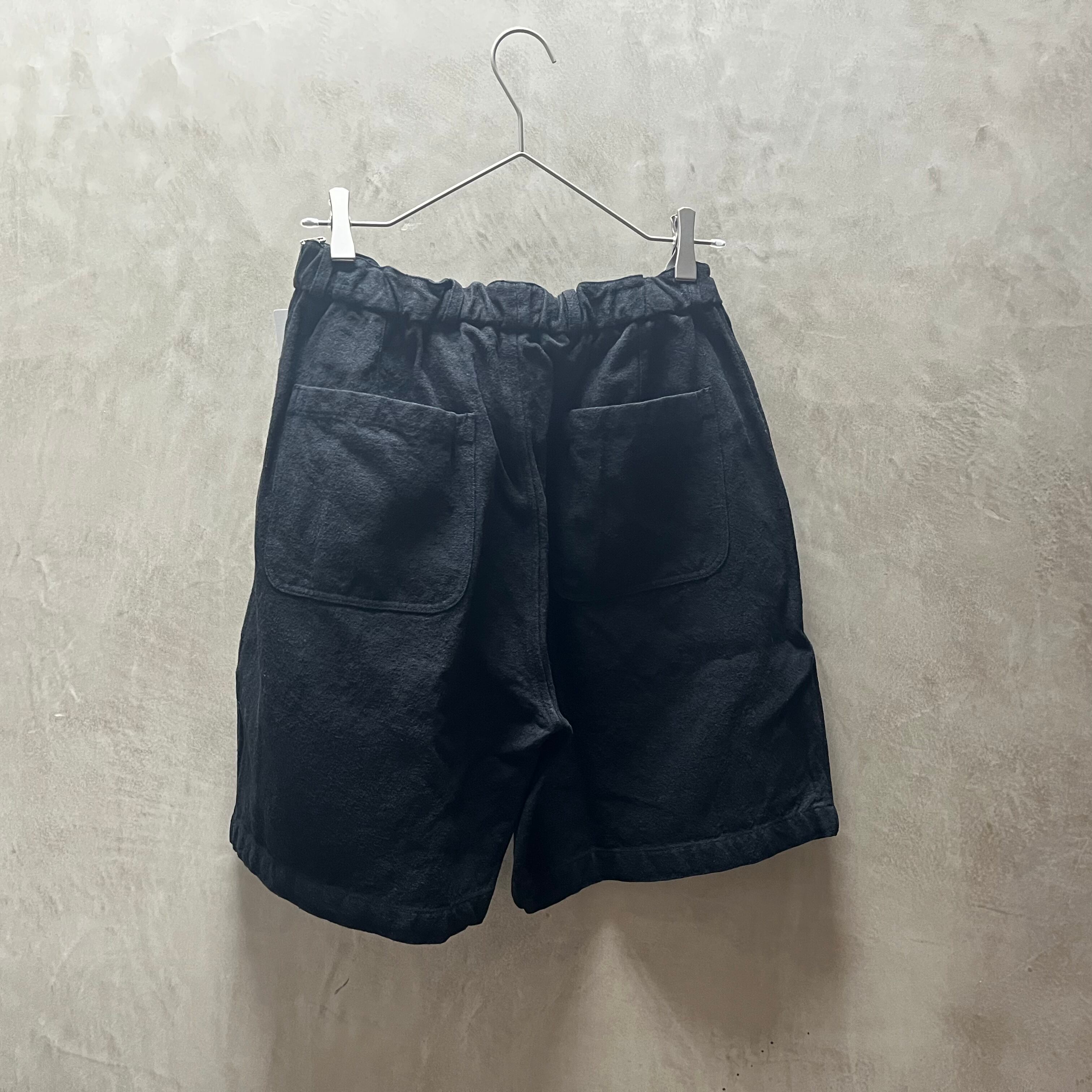 二種類の麻、亜麻(リネン)と苧麻(ラミー)の国内紡績の混紡糸を経糸と緯糸に使用した亜麻苧麻パンツシリーズのショートパンツ。吸湿性や耐久性、経年変化の美しさもあいまって