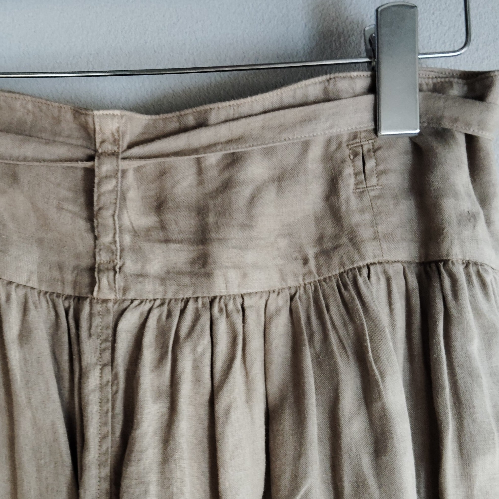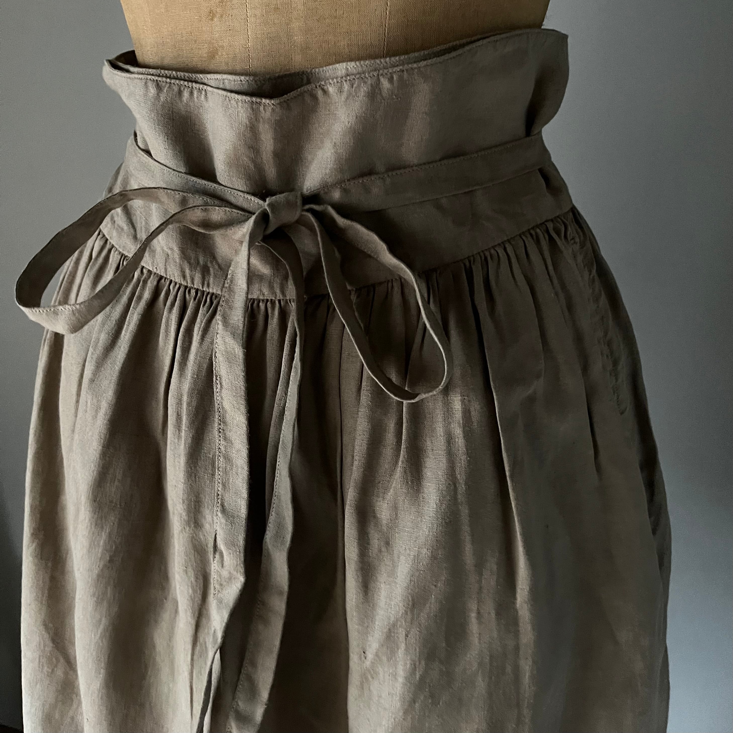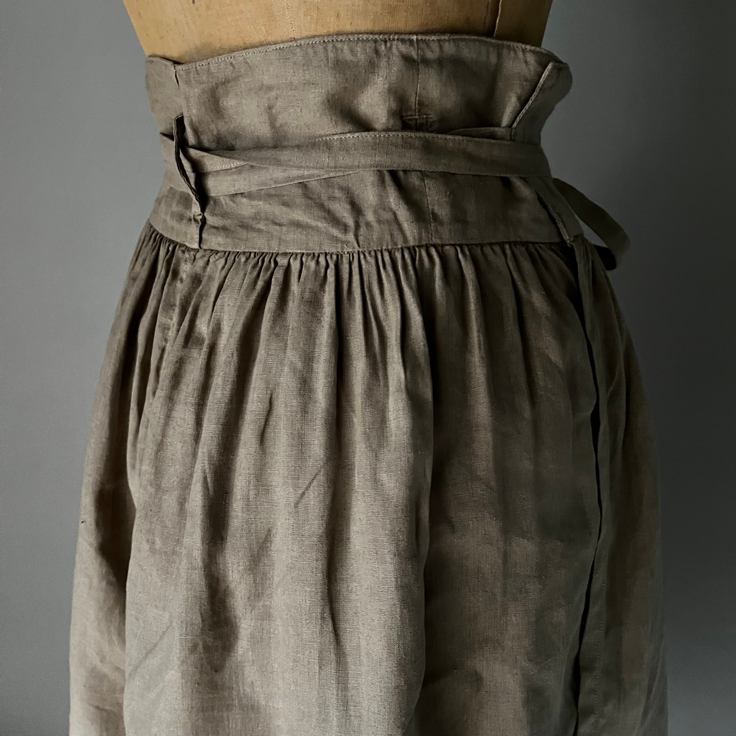 長い紐を使いウエストを結ぶ、分量感のある巻きスカートです。ウエストの位置はハイウエストでもローウエストでも、お好みの位置で着用することができます。巻きスカートなので、サイズに合わせて調整することも可能です。仕様により左前でも右前でも巻くことができます。両サイドにはポケットもあり、機能性も兼ね備えています。