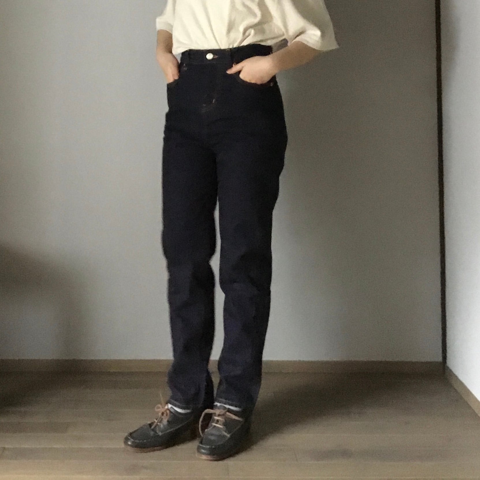 細身のシルエットに深めの股上でウエストから裾にかけてスッキリとした女性らしい印象のデニムパンツ。