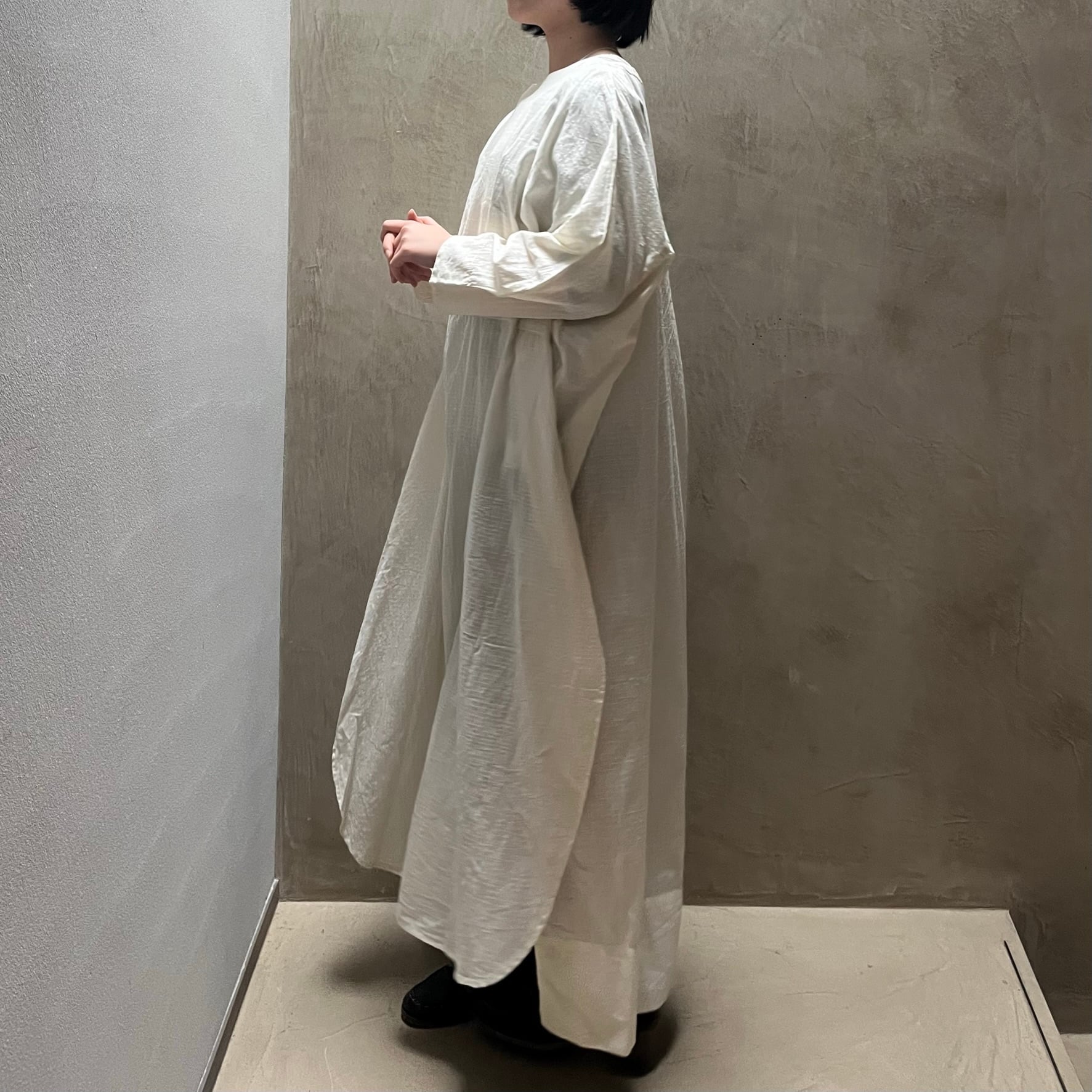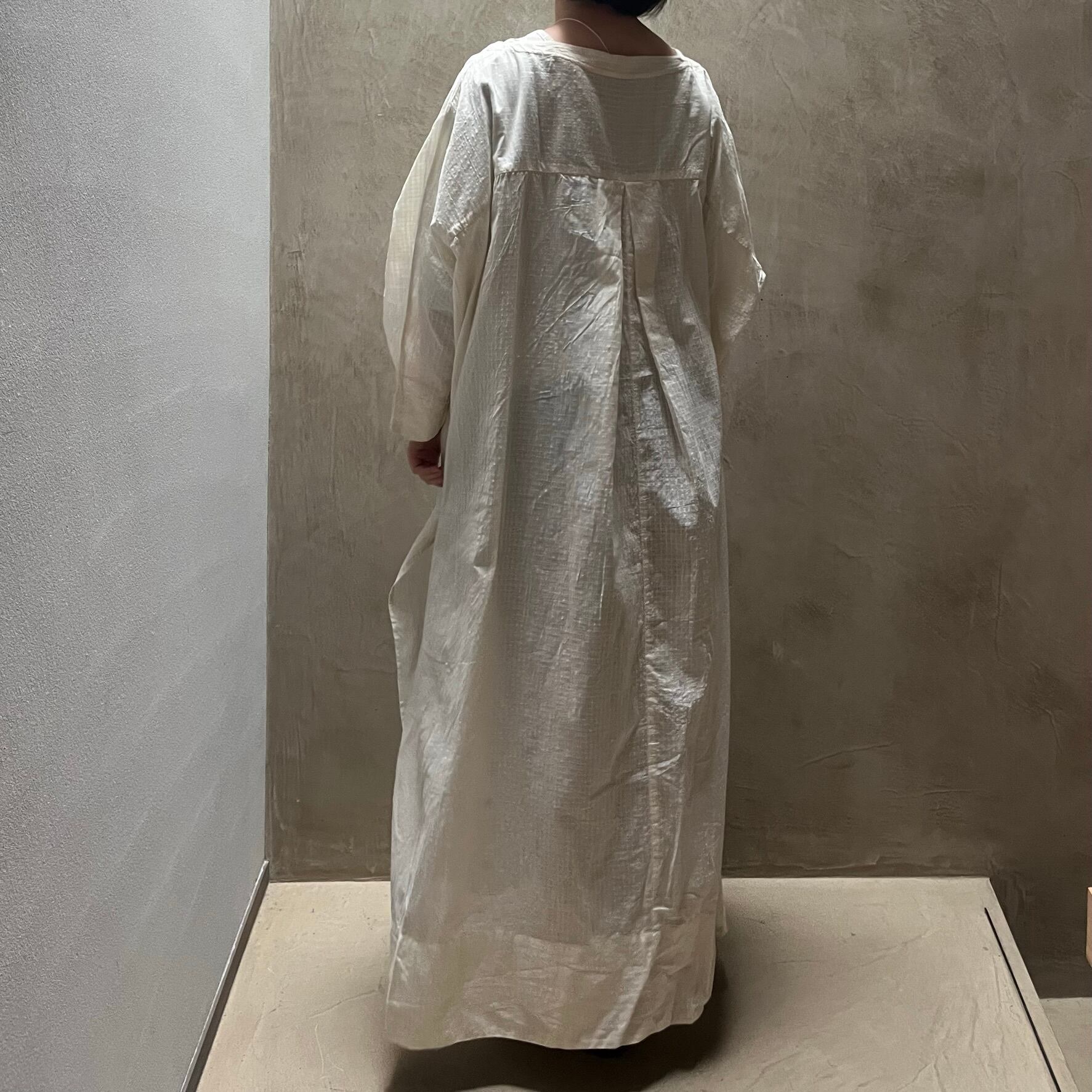 インド産の手紡ぎ手織りのカディコットンの生地を使った、ノーカラーのプルオーバーのロングシャツ。