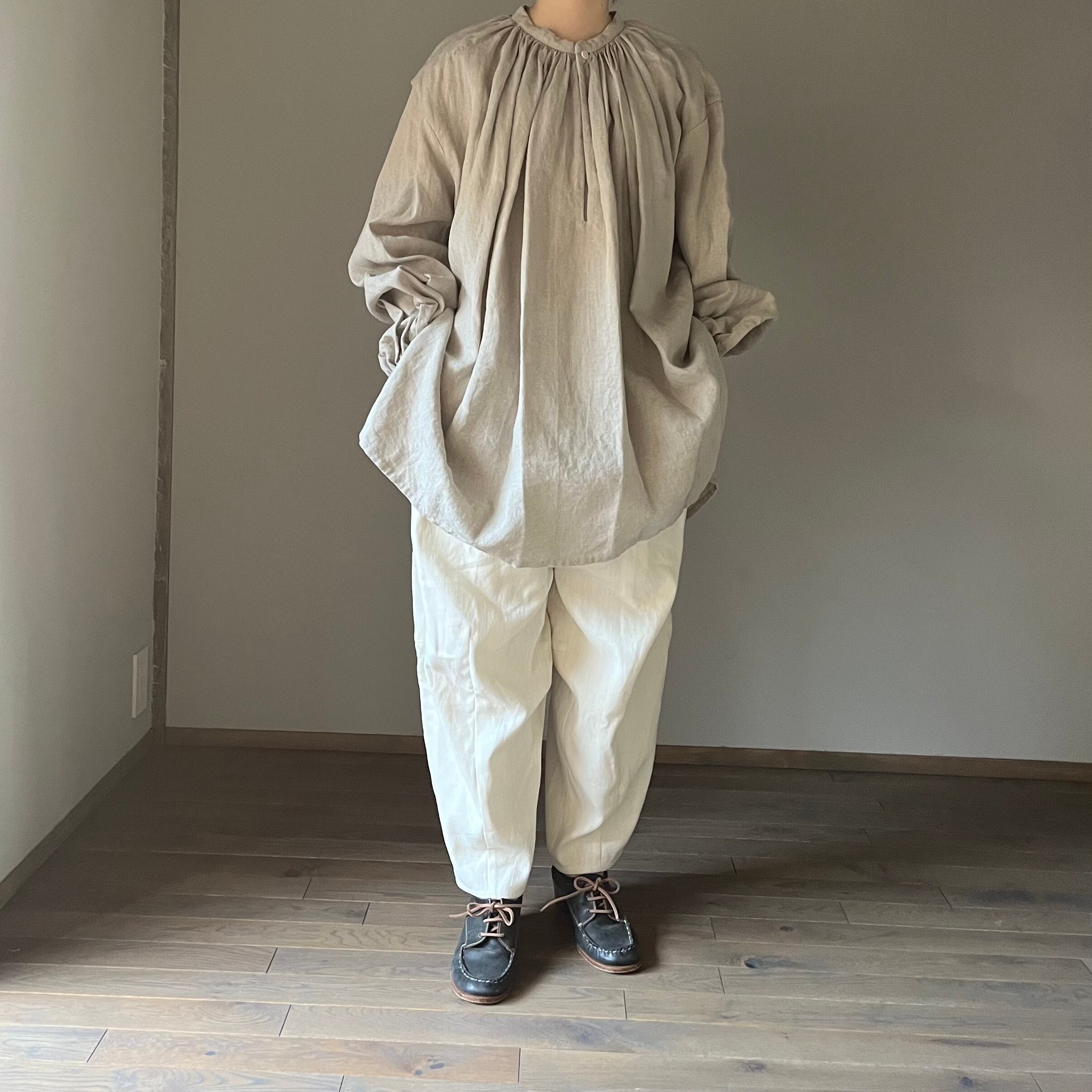 やわらかくて適度な厚みのあるLINEN生地、洗いのかかっが表情豊かなnatural color。襟まわりのたっぷりとしたギャザーが、きれいなラインを描いてゆったりとした、落ち着きのあるシルエット。フロント首元のボタンの下は、長めの25cmほどのスリットが入っていて、首元のボタンを開けてアンダーにキャミソールなど合わせてもよいです。裾にはサイドにスリットがあります。裏地はなく一枚仕立てですので、お洗濯も気軽にしていただけます。肩はオフショルダーで自然な袖のふくらみがきれいです。